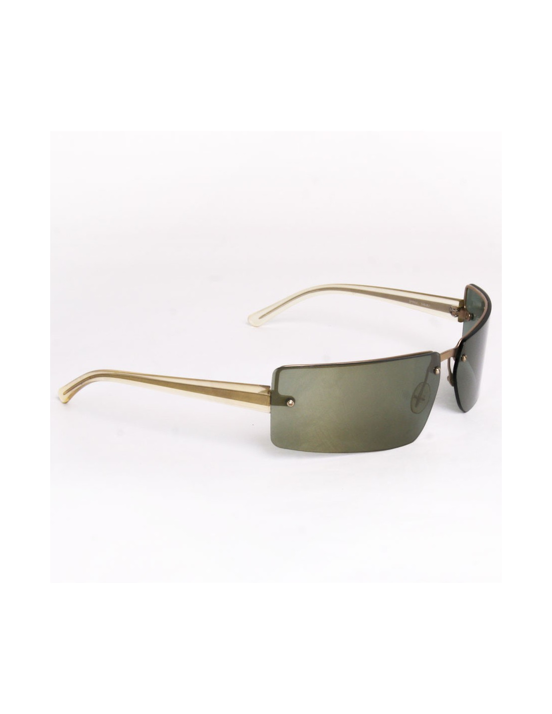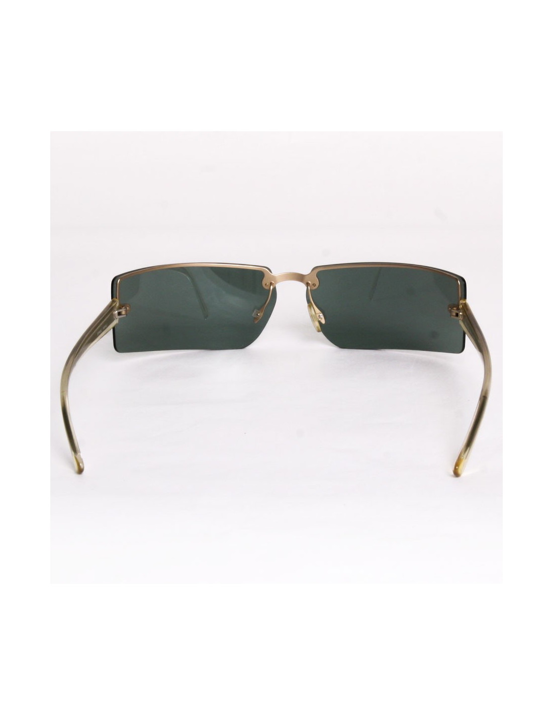Pair of sunglasses Prada rectangular shape and curved. The branches are transparent with inclusion a golden line, the glasses are tinted green smoked. Golden matte metal micro scratches from use on the glasses.