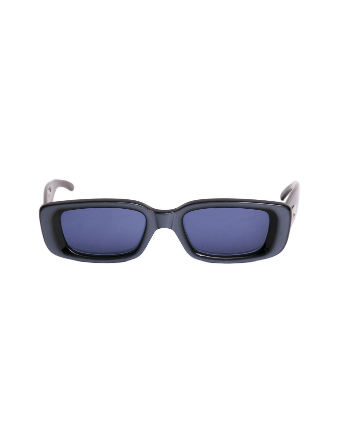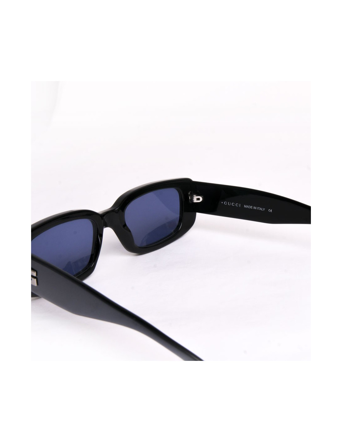 Pair vintage Gucci sunglasses, the frame is blue in color, they are rectangular in shape, the branches are wide enough, and glasses are blue tint Micro stripes are to report on the glasses. They are in good condition. Width: 13.5 cm, hauteur des verres : 3.5 cm , longueurs des branches : 14 cm Comes in a protective cover