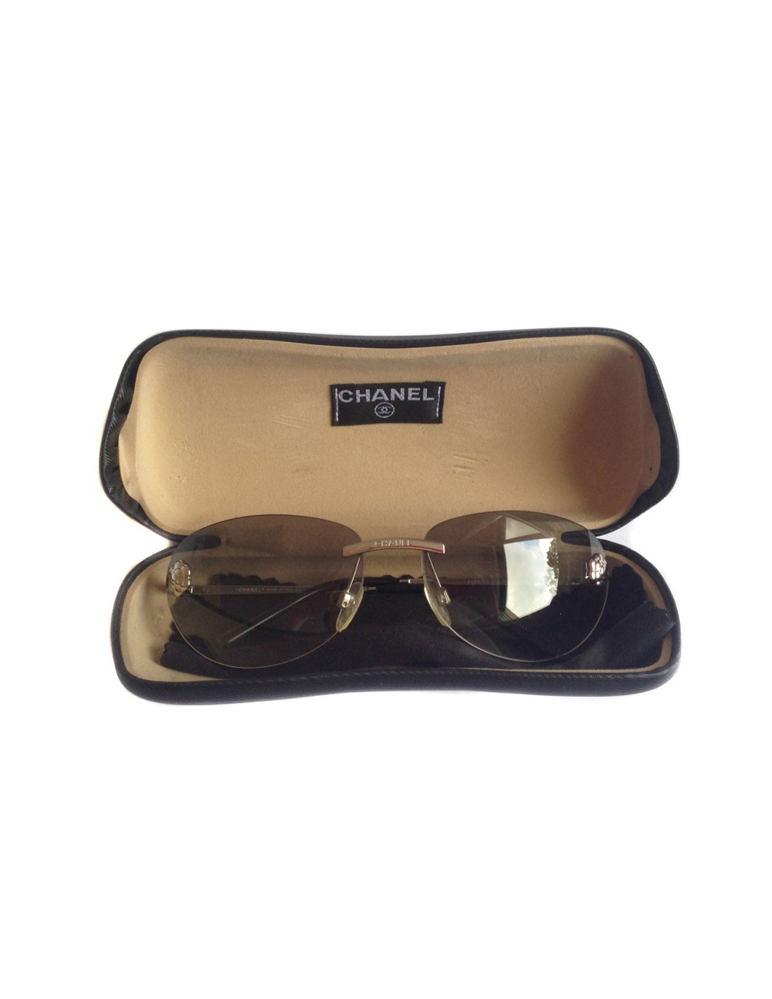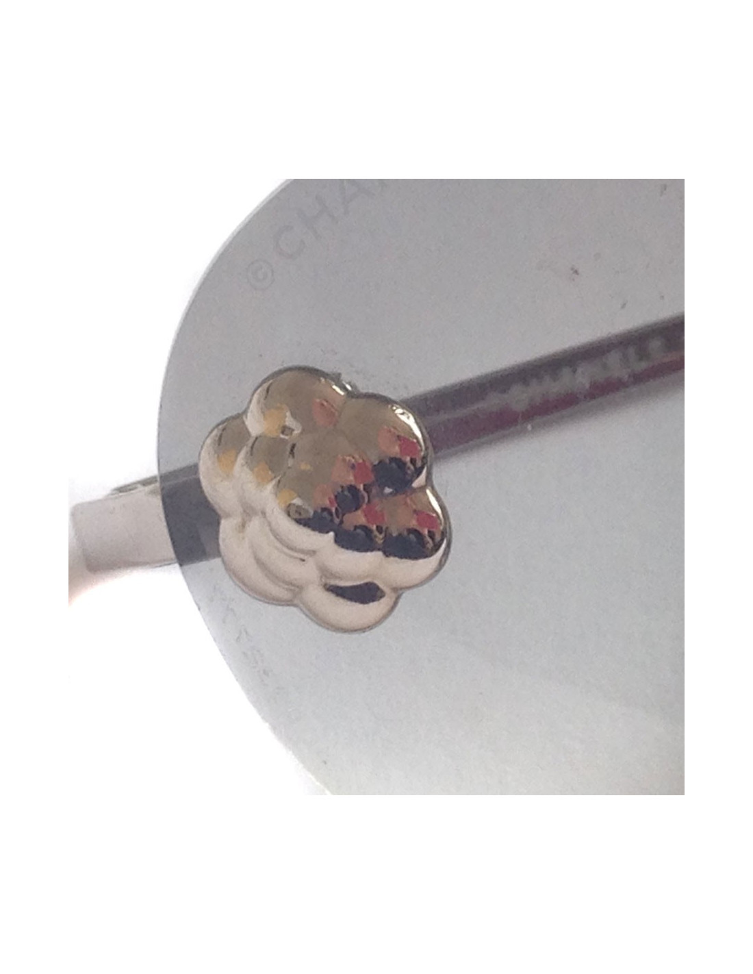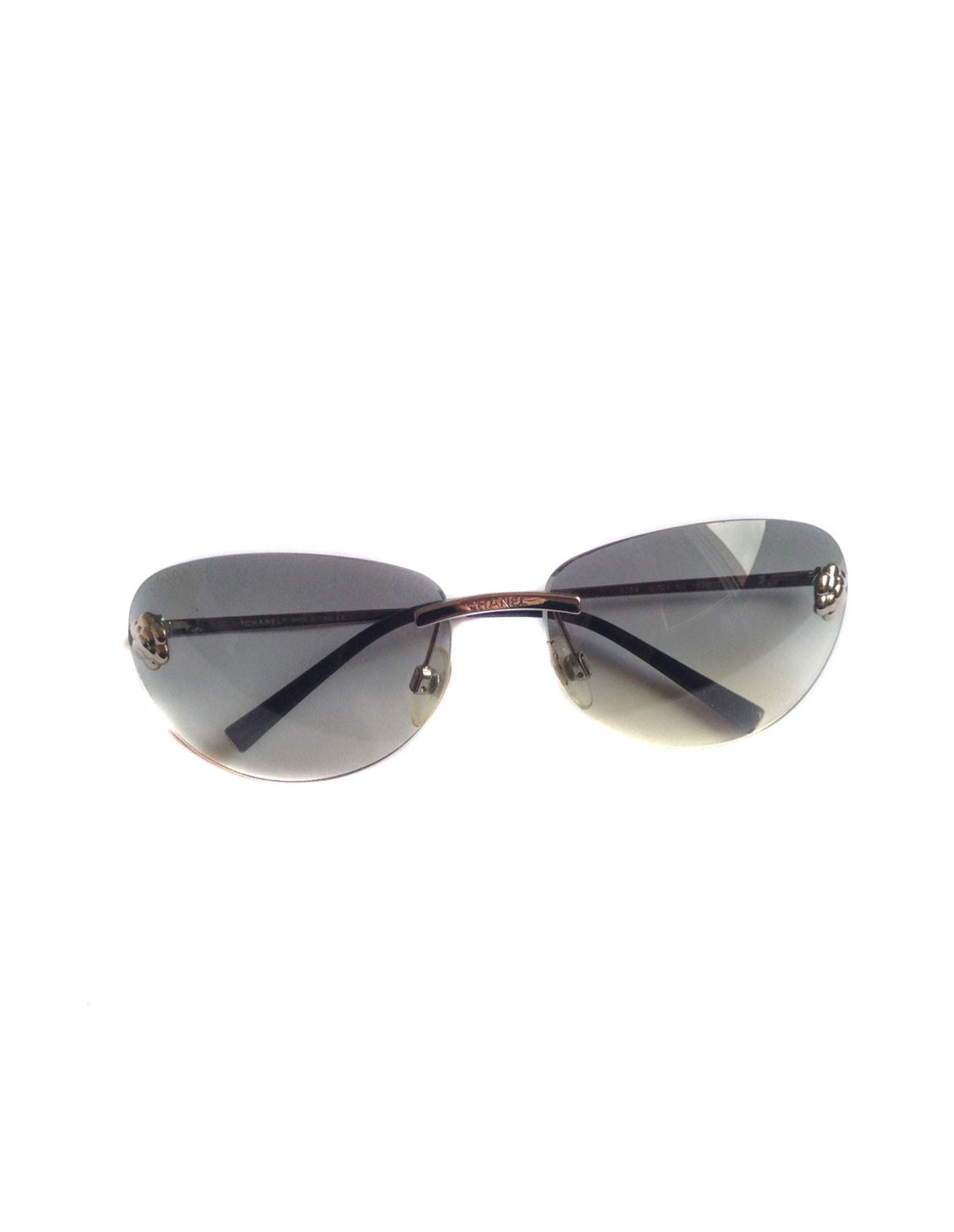 Very nice pair of Chanel sunglasses. The glasses are in a gray gradient, branches are a small Camellia in silver, on each side of the glasses.