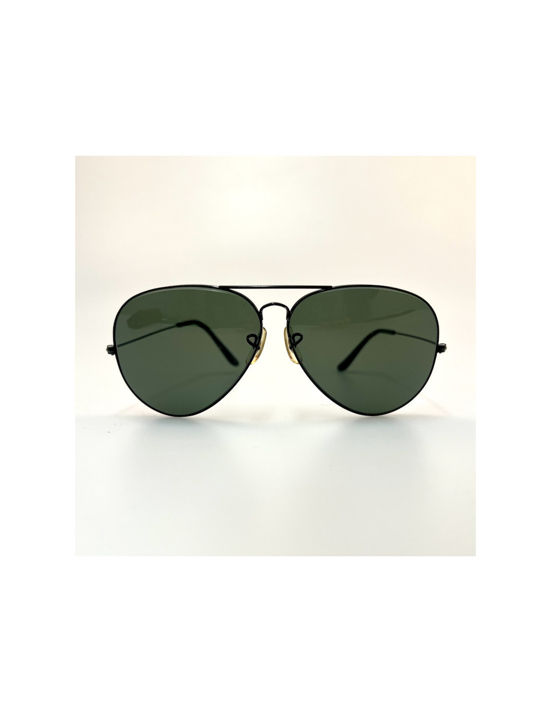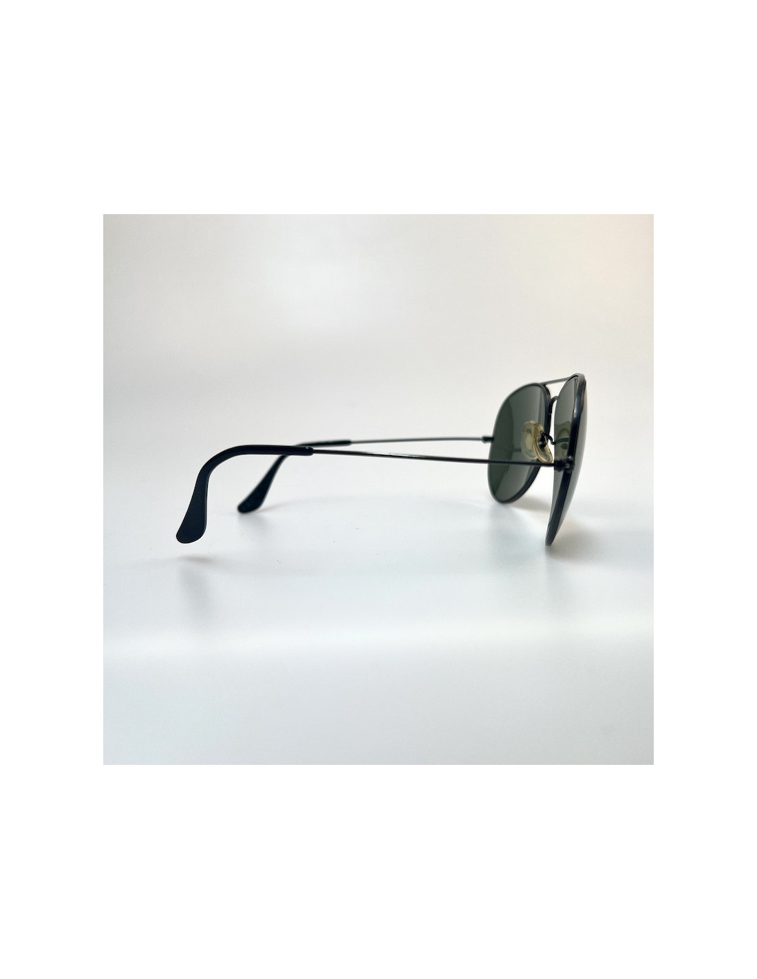 Details: Pair of Ray-Ban aviator style sunglasses, black metal frame and temples, black tinted lenses, the glasses are vintage and may have some flaws, such as a few scratches on the lenses.