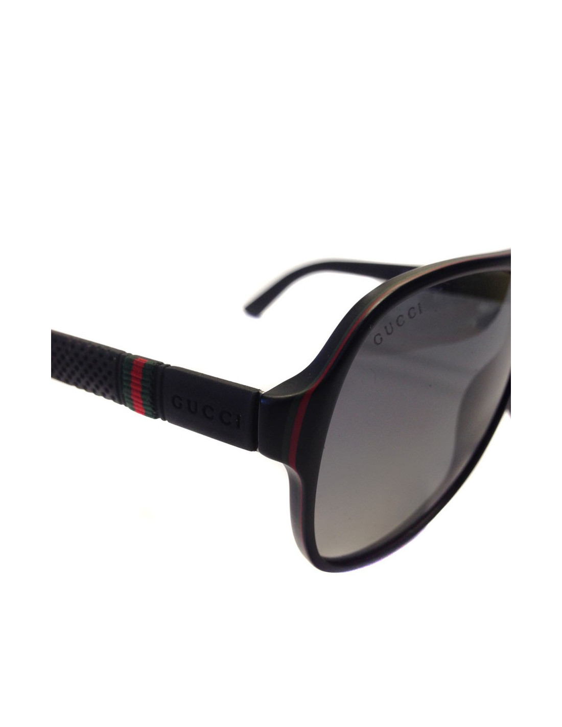 Pair of GUCCI, model Aviator sunglasses. Black plastic, polarized dark lenses mount. In very good condition.
