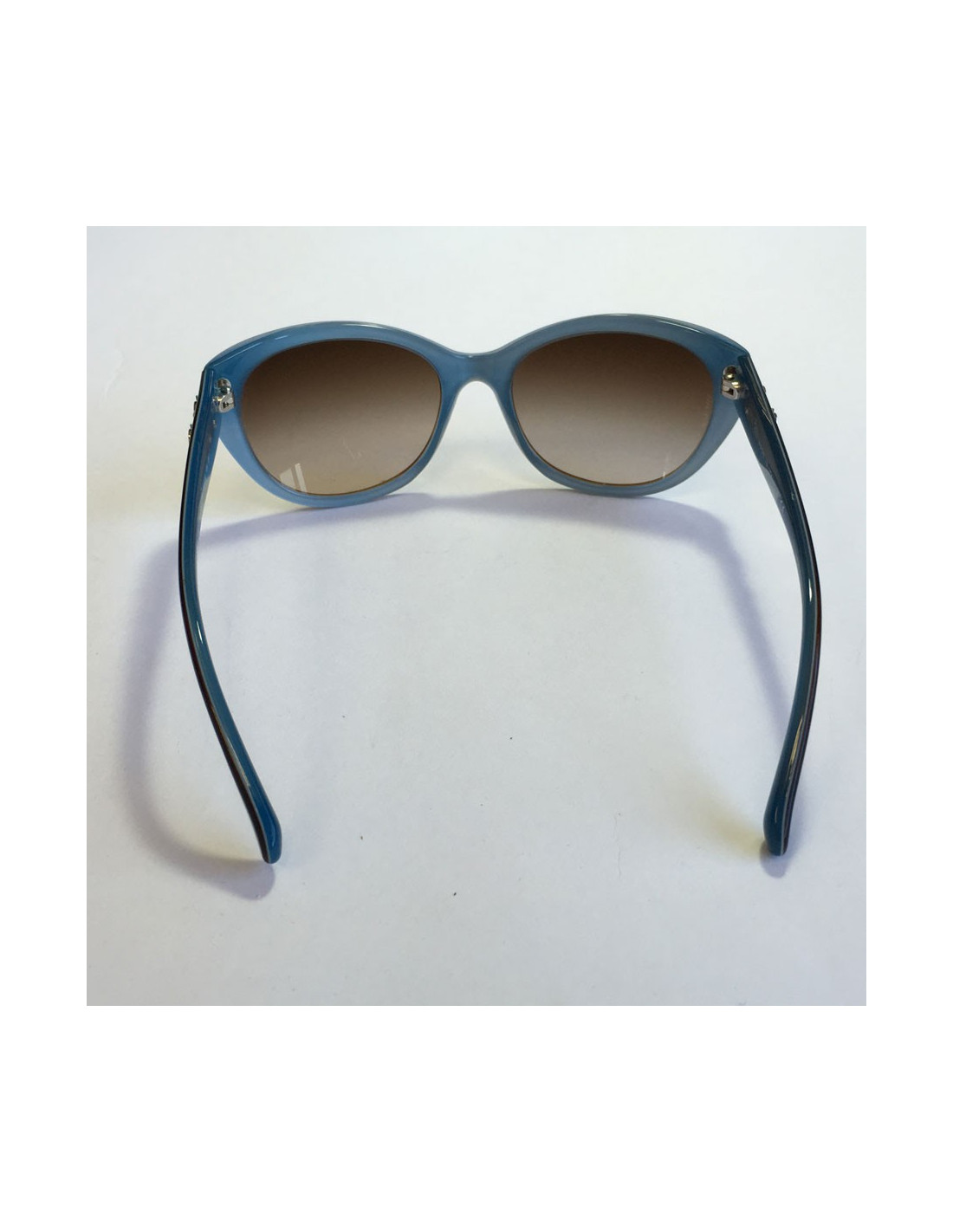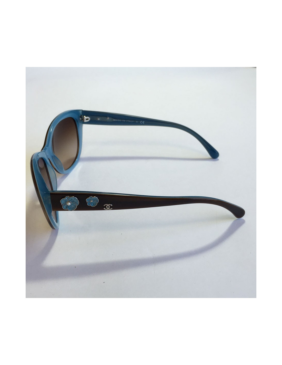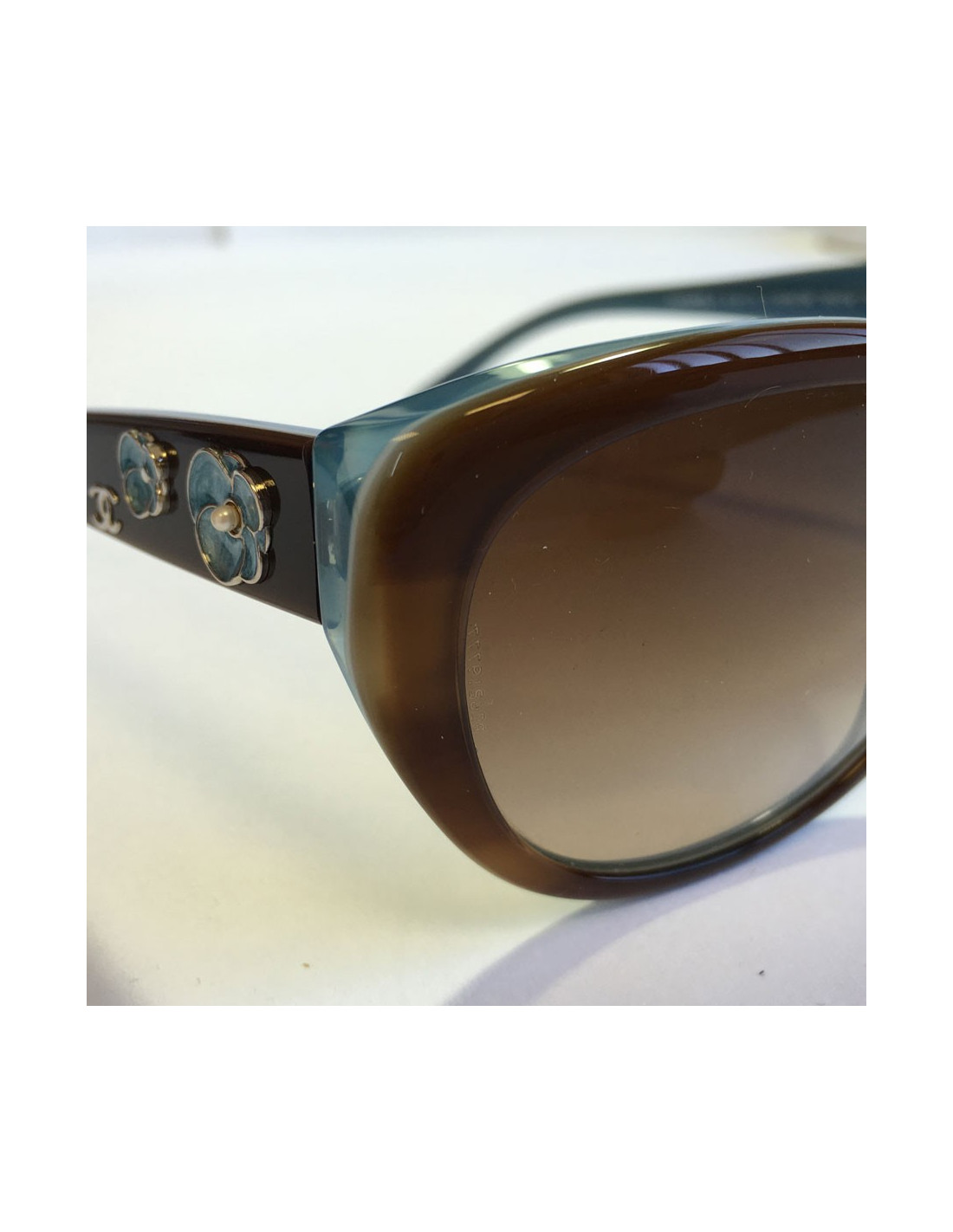 CHANEL sunglasses in plexi two-tone Brown way tortoiseshell and the Interior in blue. Small camellias in blue metal on each branch.
