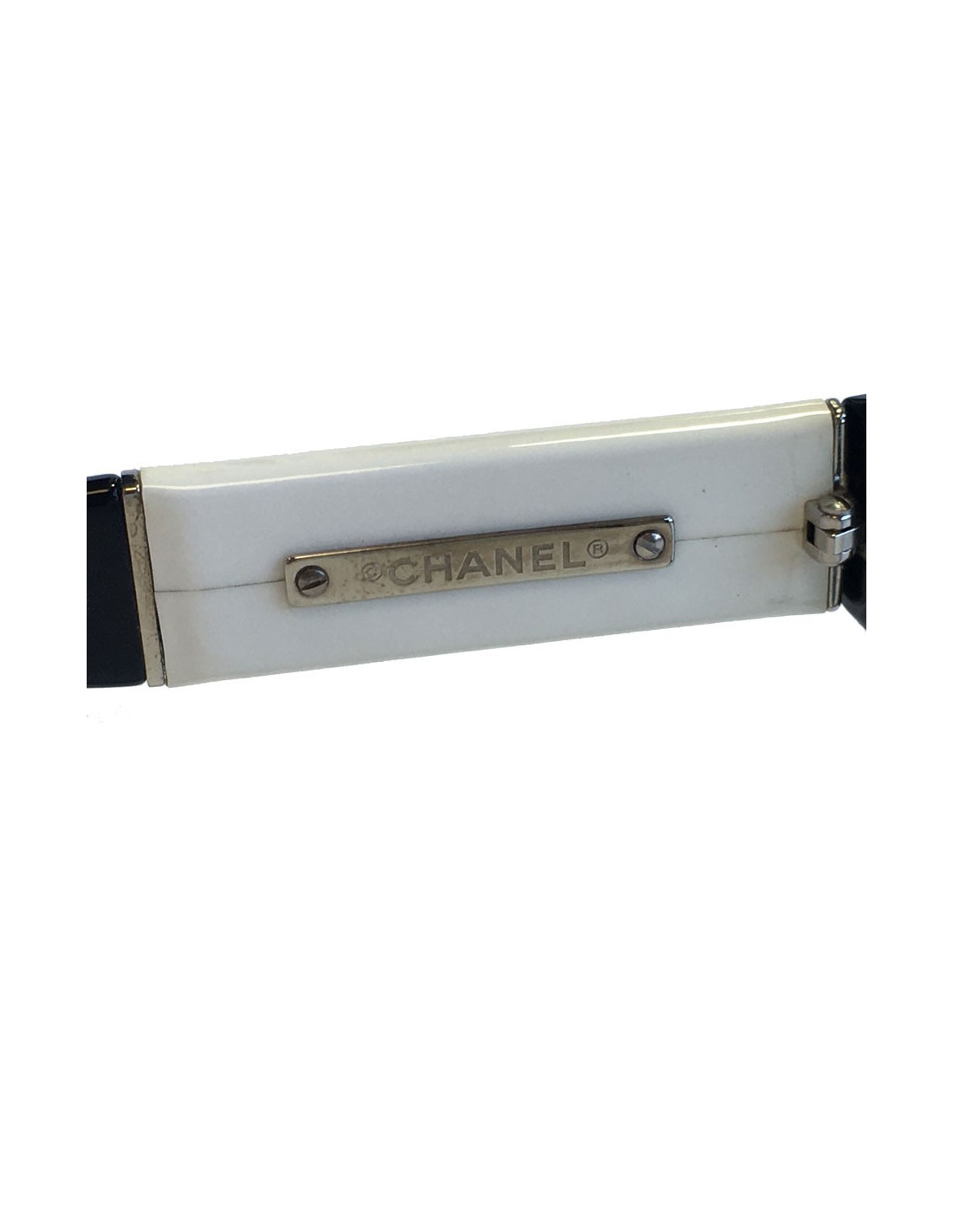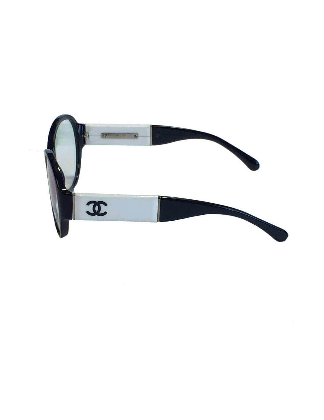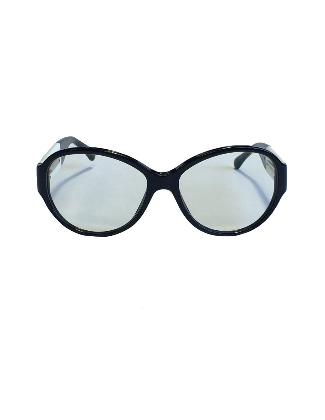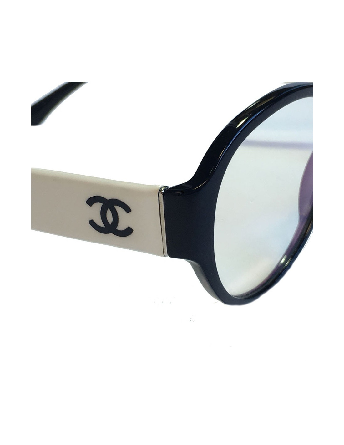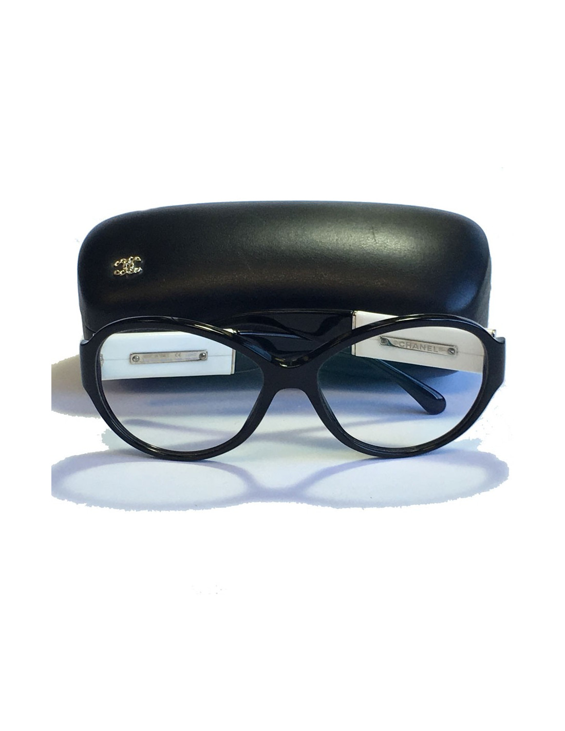 Lunettes de vue CHANEL en plastique noir. Une partie est en plastique blanc sur les branches. En très bon état.
