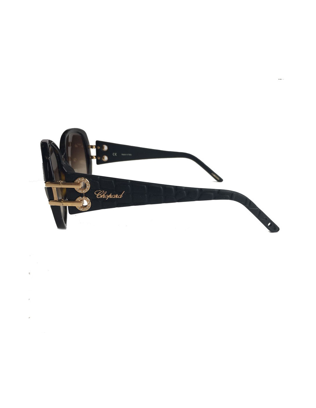 Lunettes de soleil Chopard en plastique écaillé marron foncé et branches caoutchouc noir façon crocodile. les visseries qui relient les branches aux verres sont en métal doré et strass.