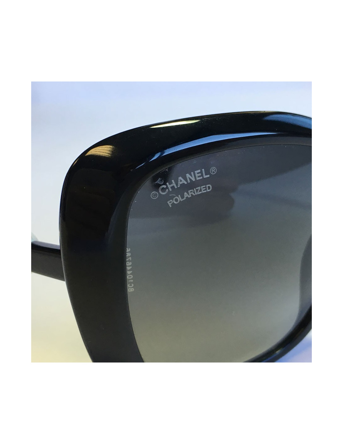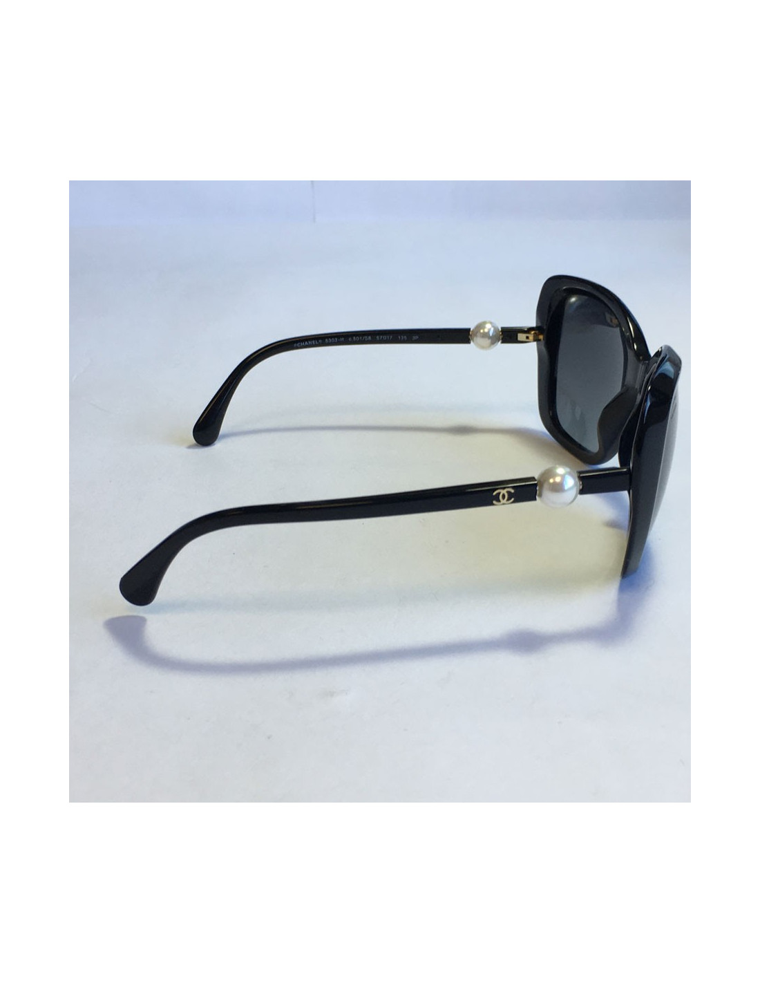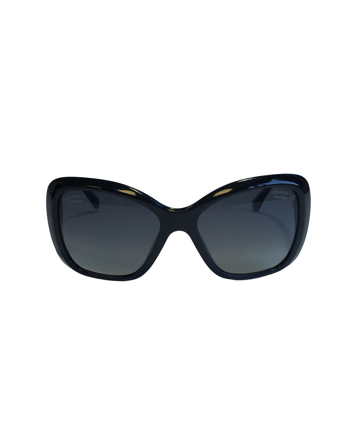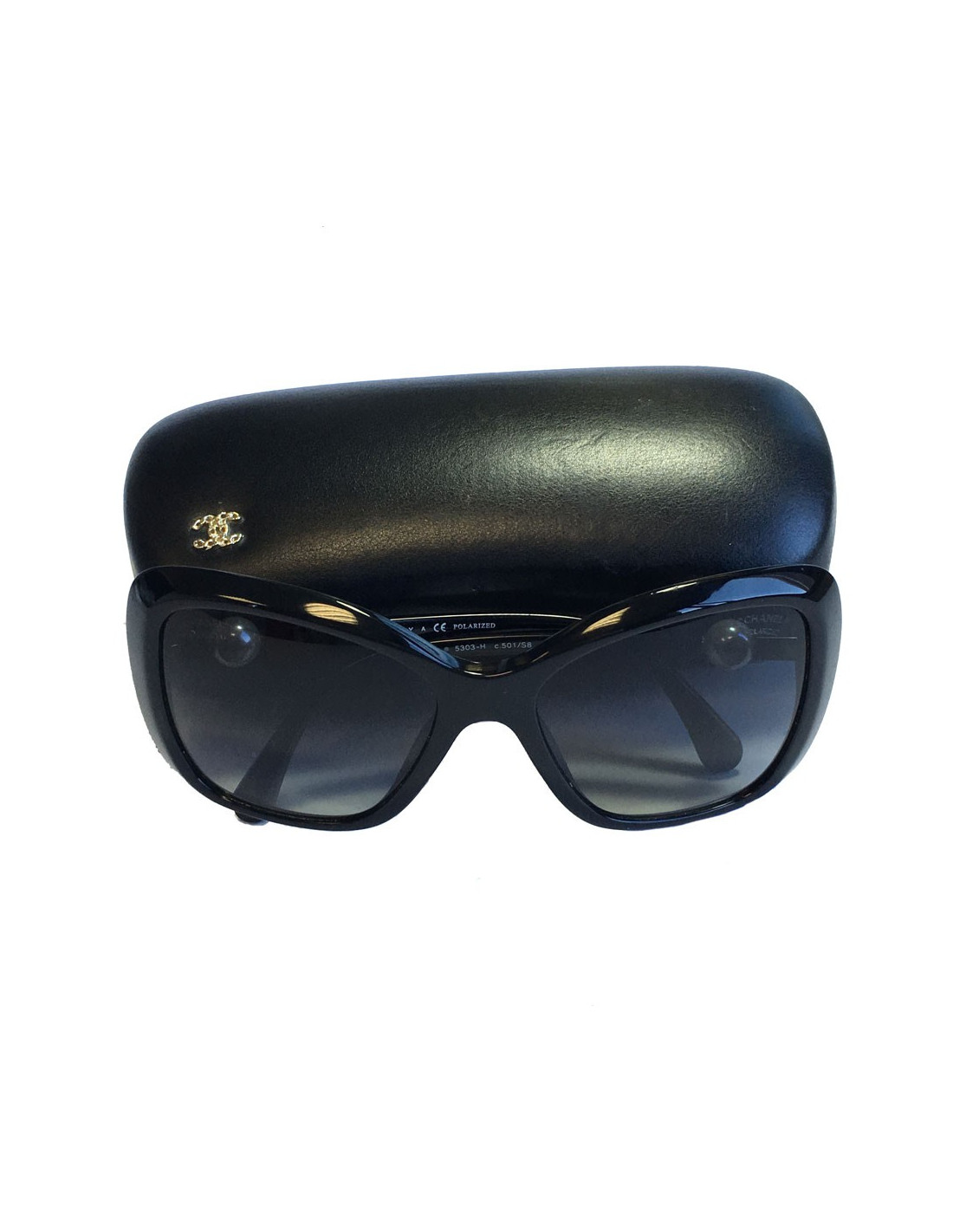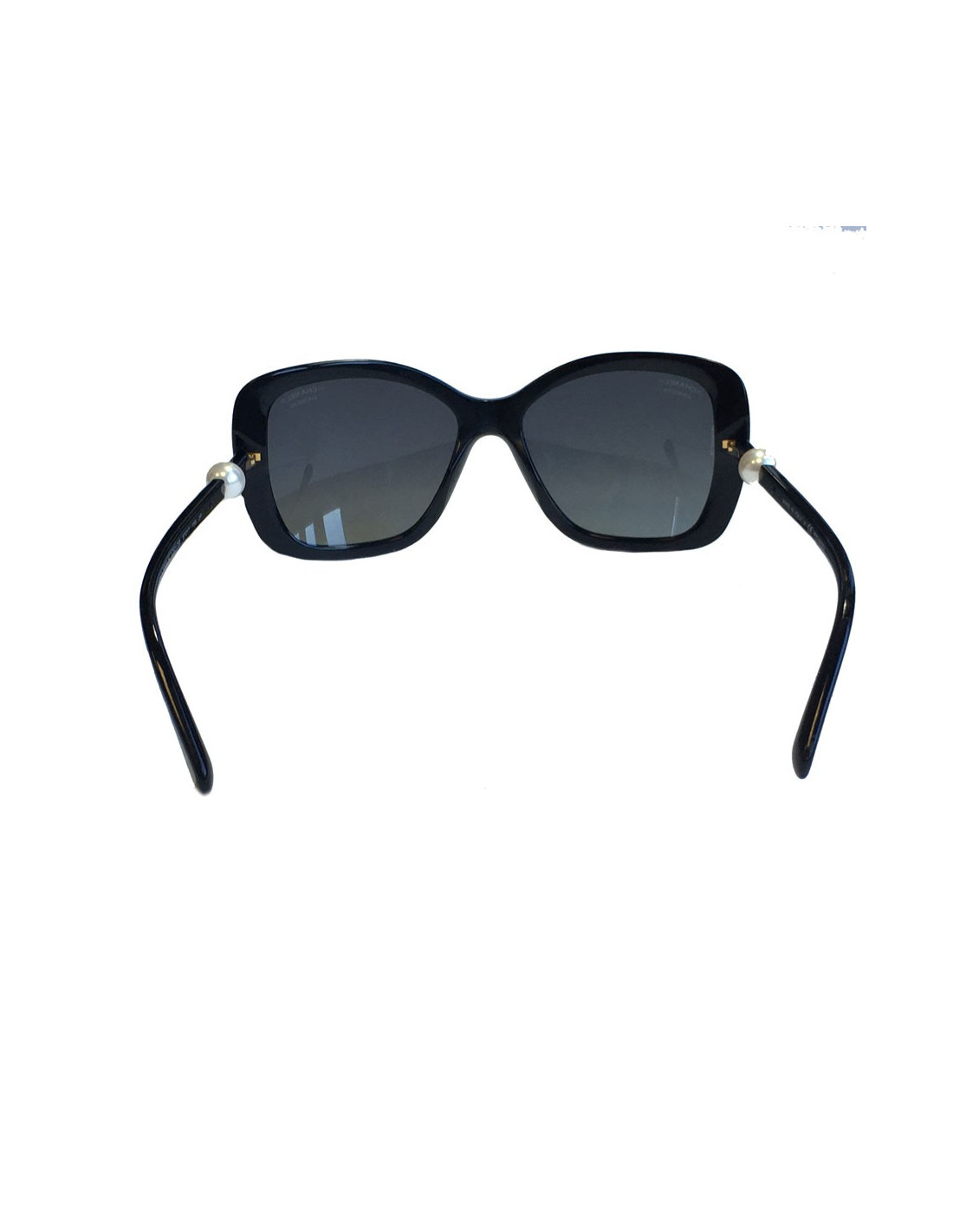 Lunettes de soleil CHANEL en plastique noir, verres foncés polarisés. Une perle nacrée se trouve sur chaque branche.