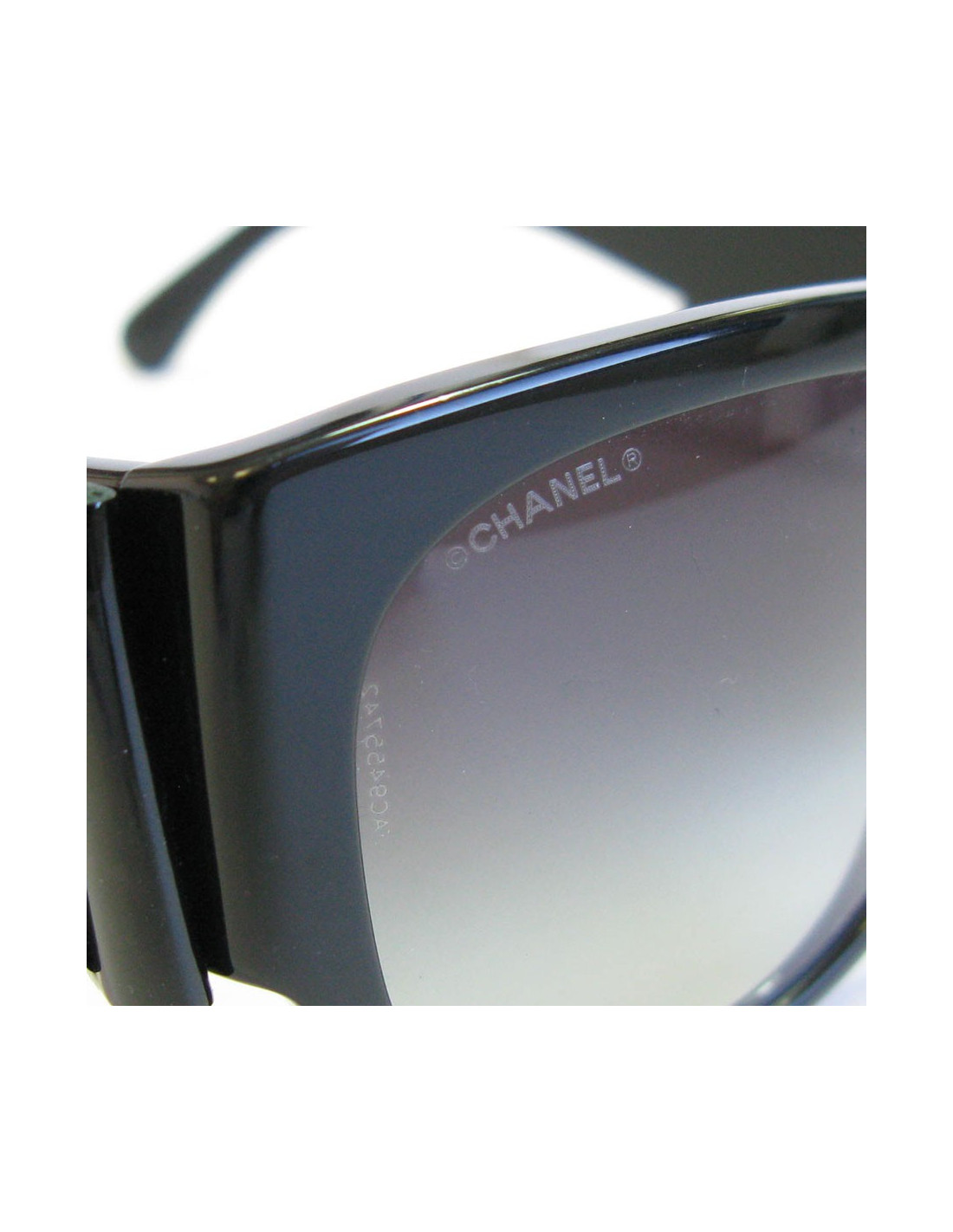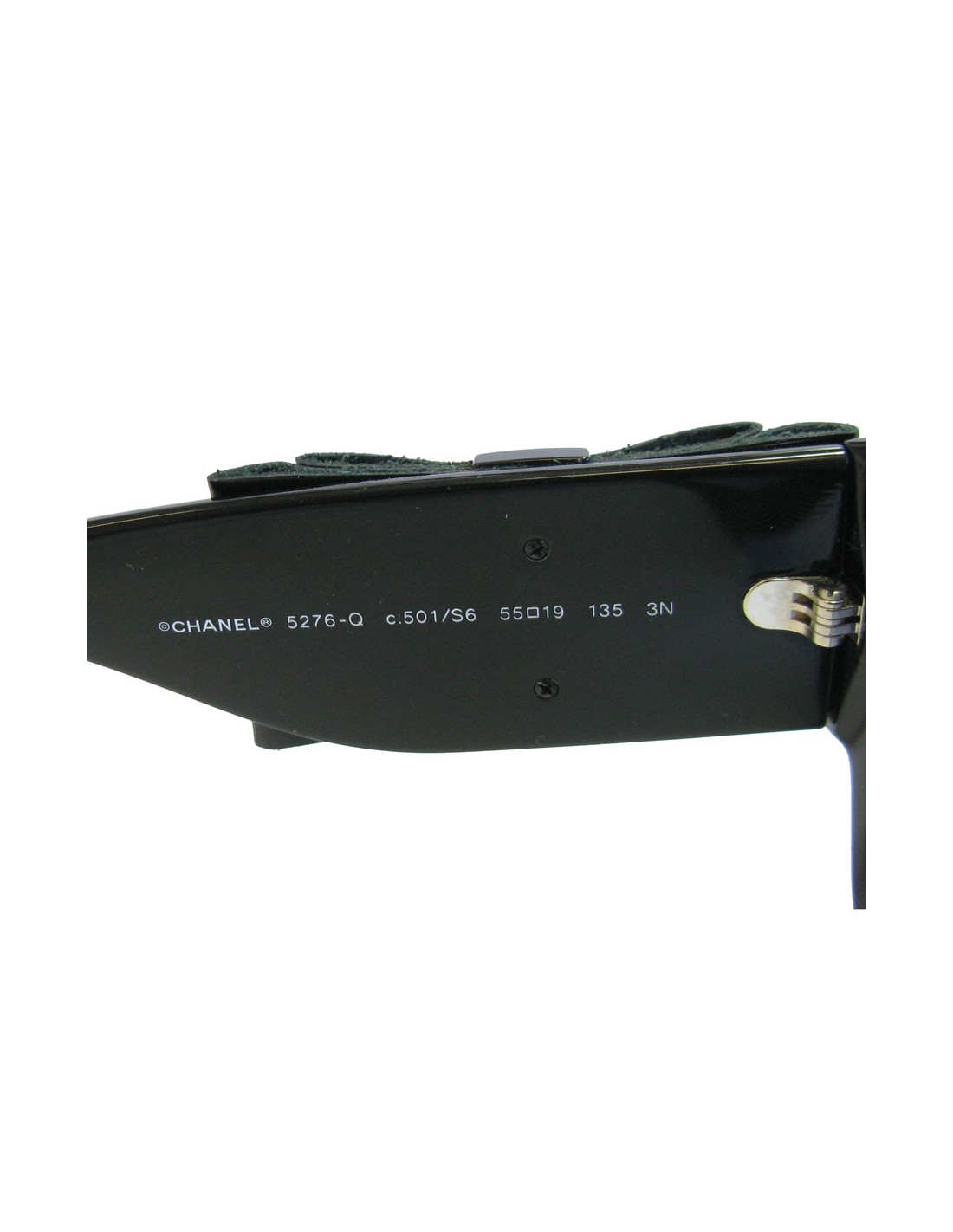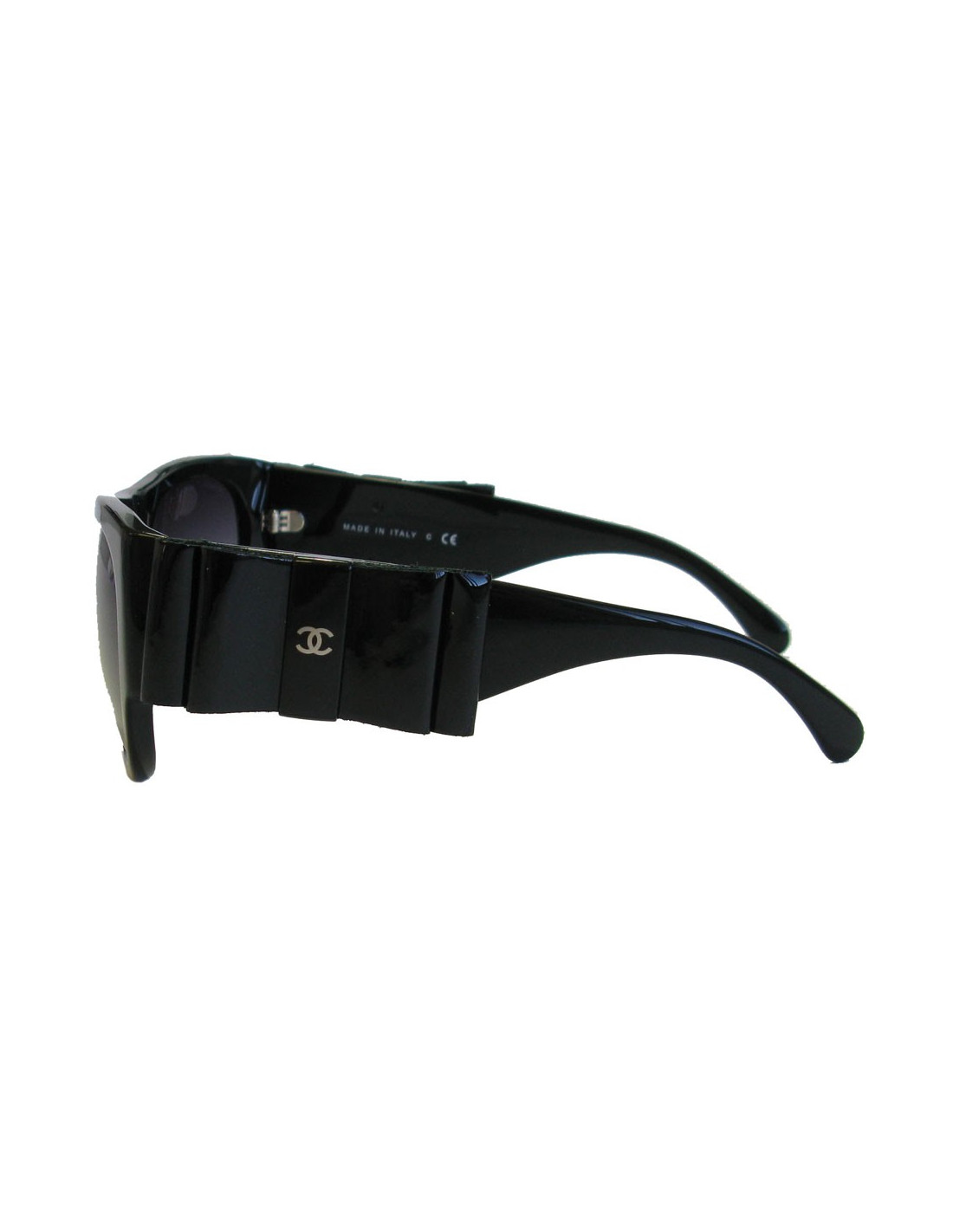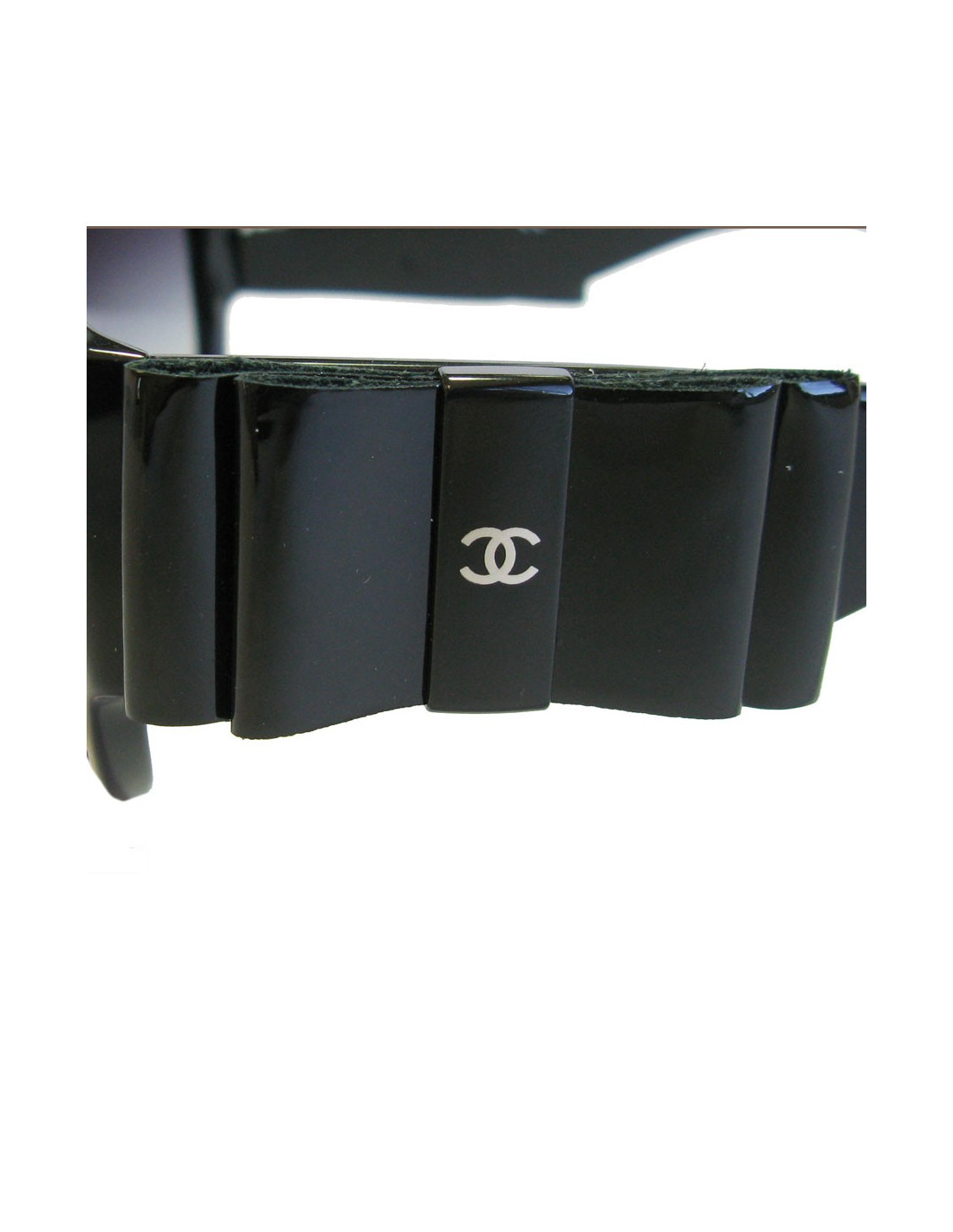 Lunettes de soleil Chanel en plexi noir. Un noeud en vinyl noir se trouve sur chaque branche, un petit CC argenté au milieu.