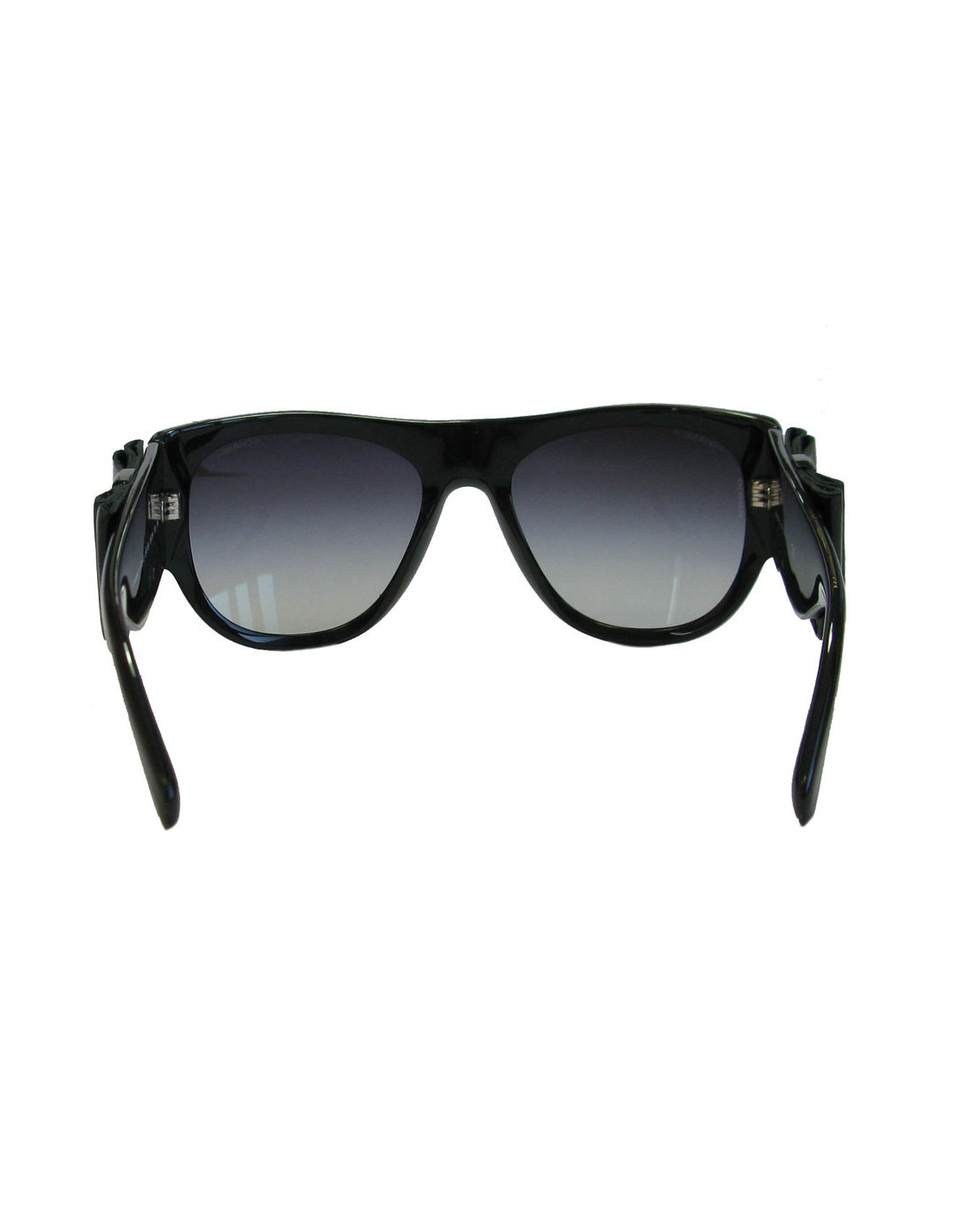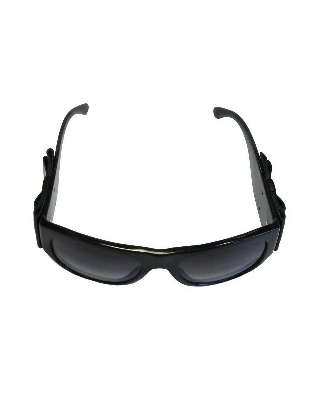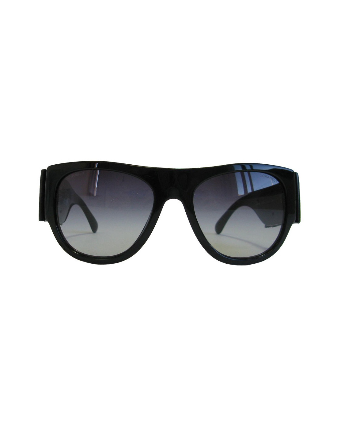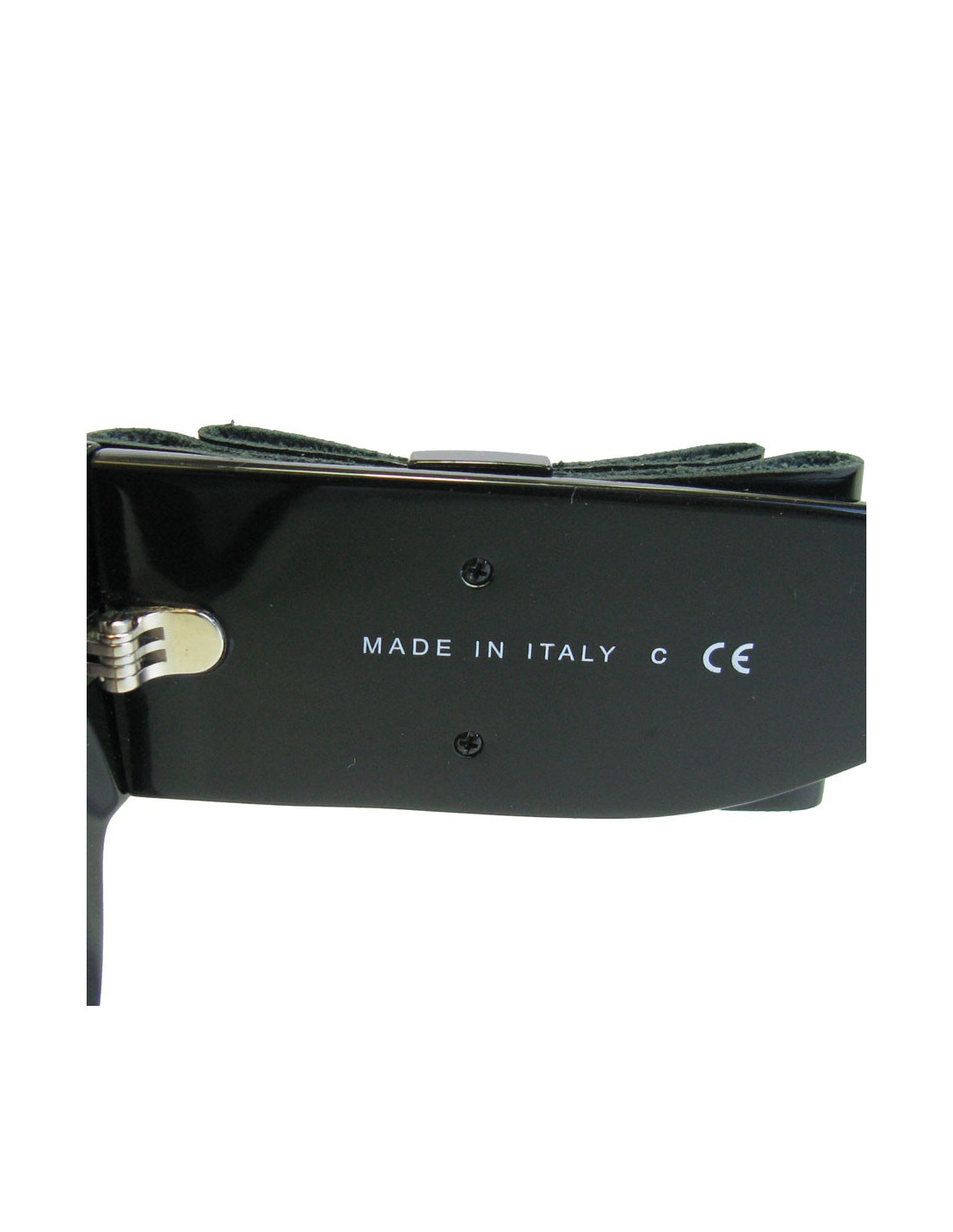Lunettes de soleil Chanel en plexi noir. Un noeud en vinyl noir se trouve sur chaque branche, un petit CC argenté au milieu.