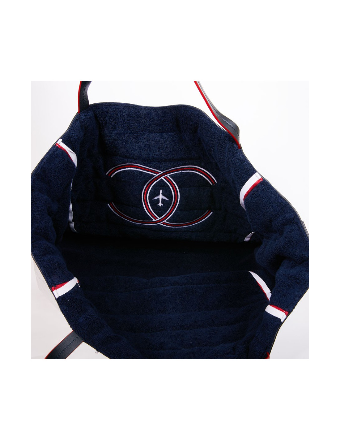 Last items in stock HEADWEAR CHANEL blue and white beach hat CHANEL 27288 350.00 € CHANEL blue and white beach hat Condition: very goodMade in France Material: cottonColor: blue, whiteLining: white monogram CCSize: 56Details: clover print and CC monograms Add to cart