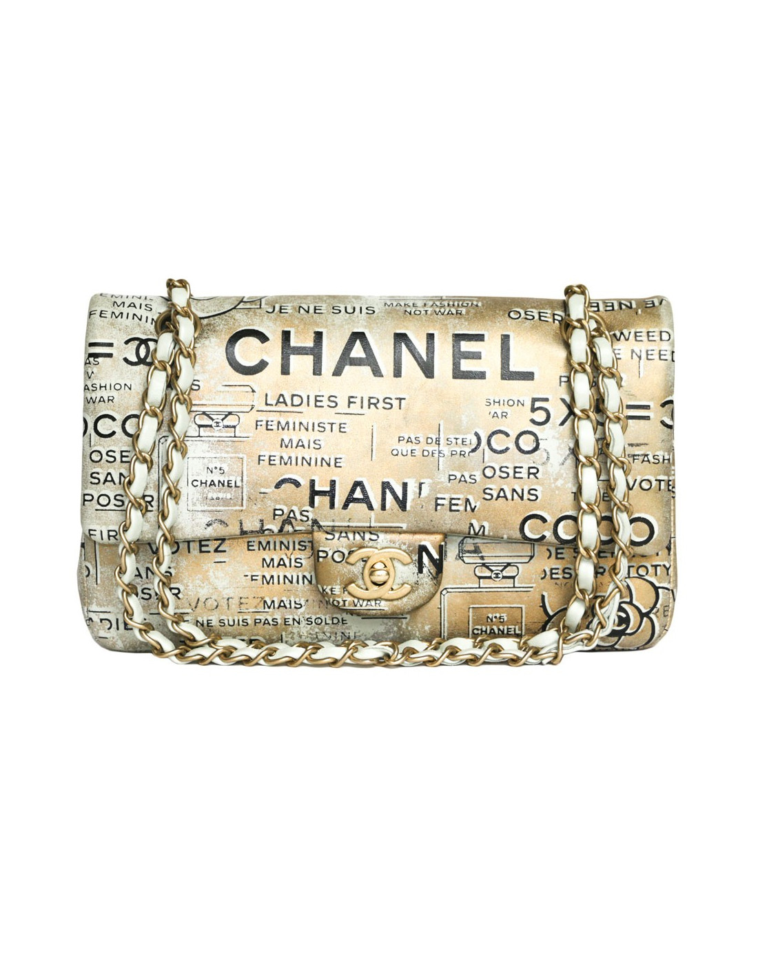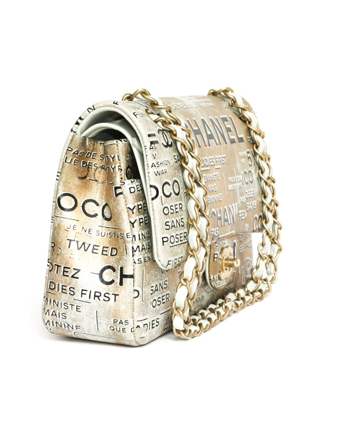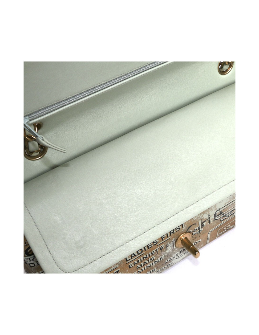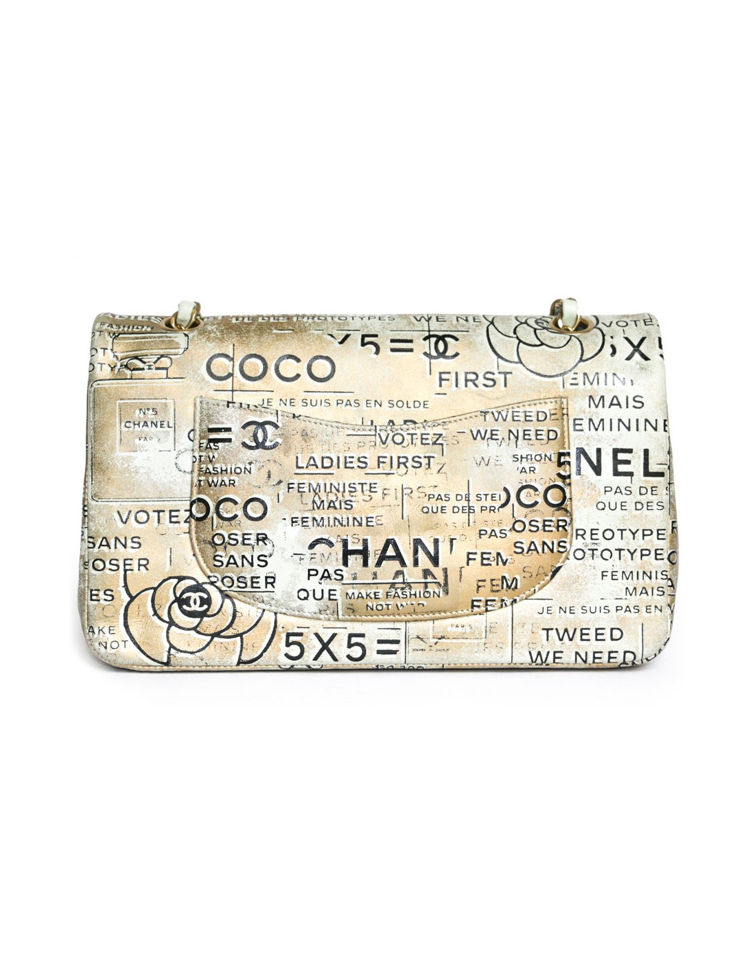 Exceptional bag! Chanel double flap Timeless bag. Coco Collection Spring / summer 2015, limited edition in gilded leather on a green water background as tagged. We can see mythical inscriptions such as: Coco, Chanel, tweed, ladies first, feminist but not feminine, etc .... Copper jewelery.