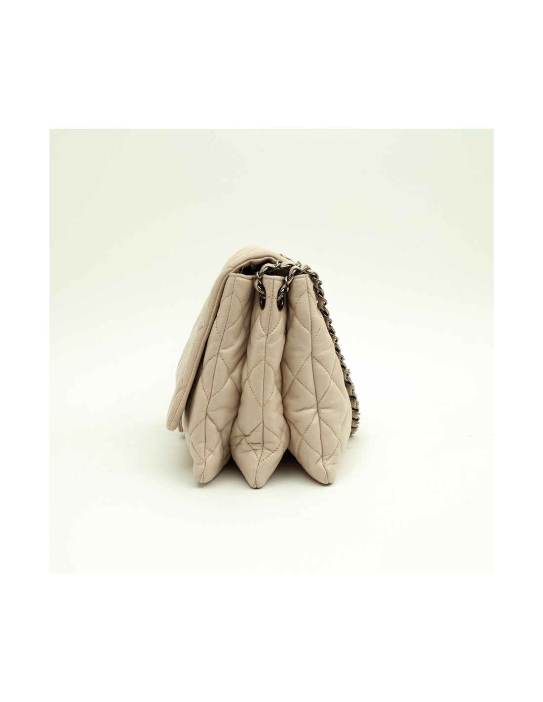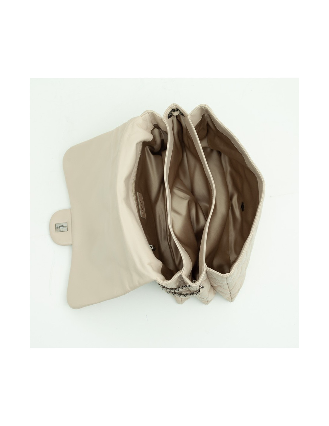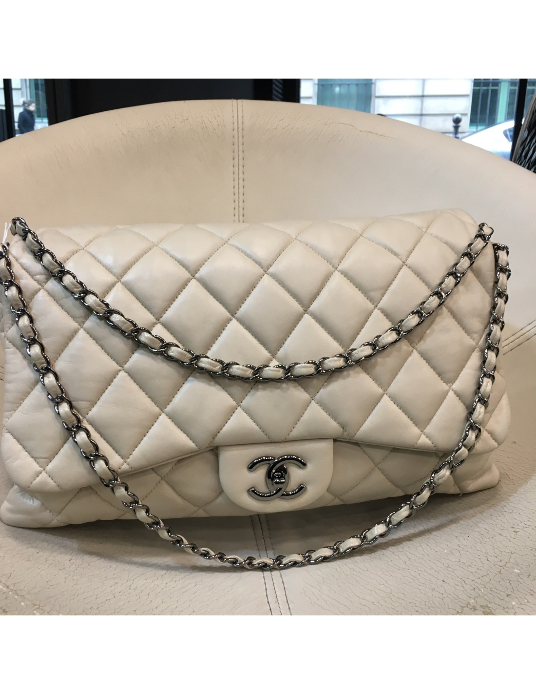Sold 255 CHANEL CHANEL maxi jumbo double flap bag in aged ivory leather CHANEL 22556 5,450.00 € Chanel 'Maxi jumbo' double flap bag in aged ivory leather. In very good condition. Antique silver metal hardware. Clasp 2.55. The interior is lined with ivory leather. Included : Hologram and authenticity card 10908 **** (year 2006). It is worn on the shoulder and crossover. Made in France. Dimensions: 35 x 20 x 9 cm Will be delivered in its dust bag View