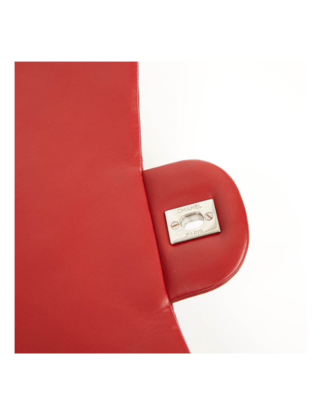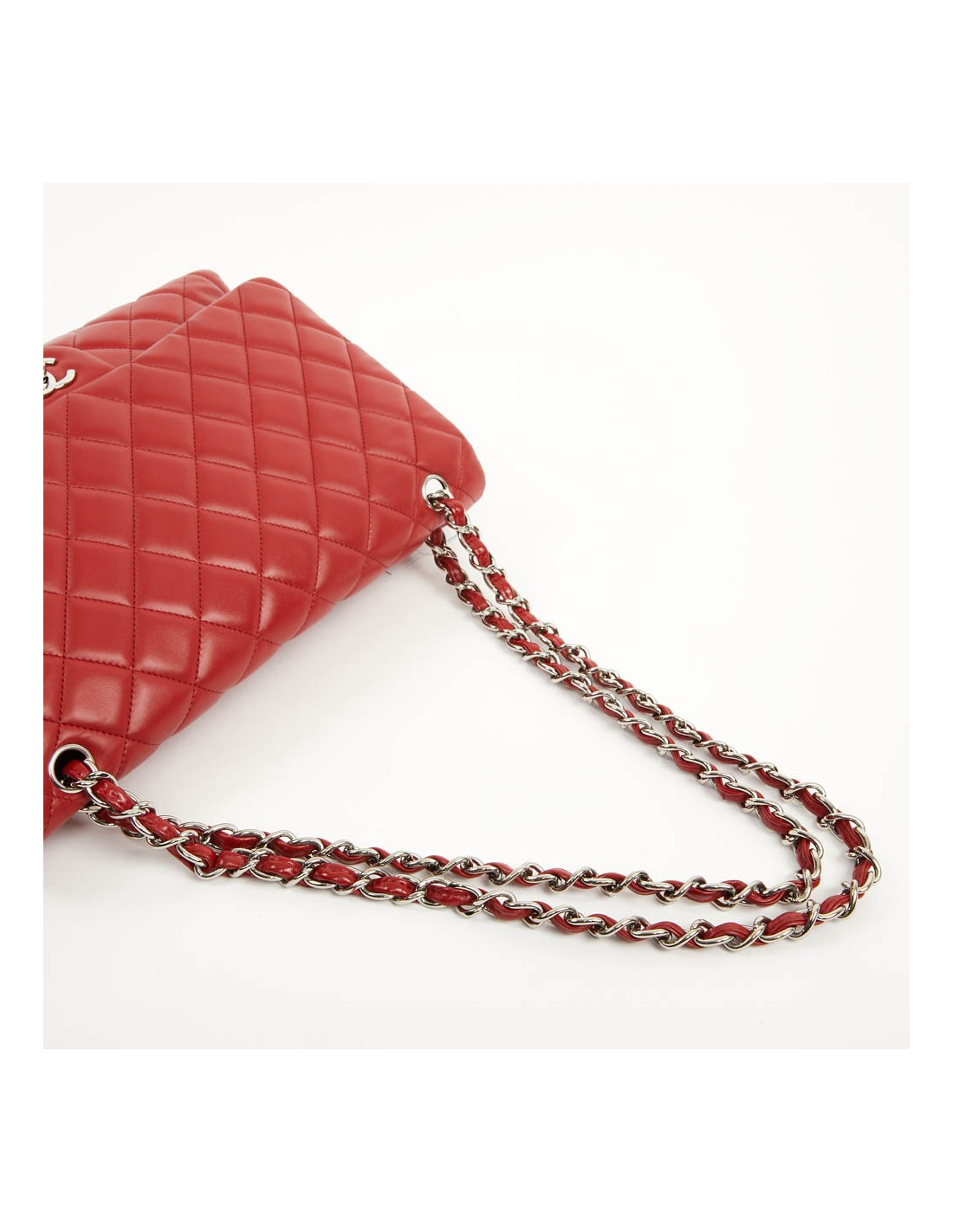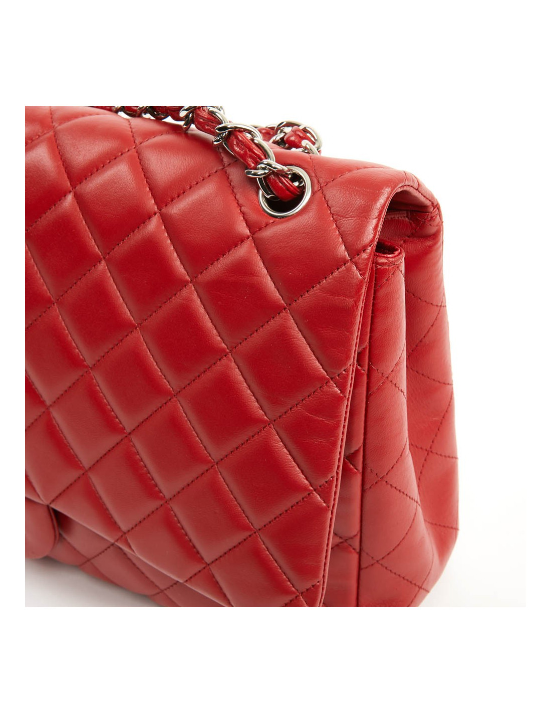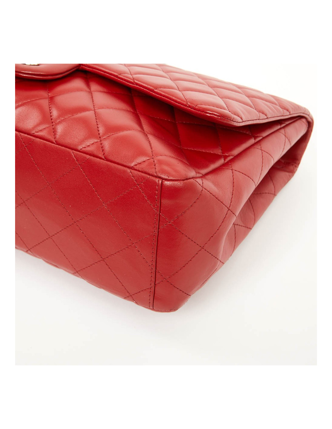 Chanel jumbo handbag, with a wide flap in red quilted leather. It was re-dyed in the authentic style by Germaine Lesèche, the famous dyer. It can be worn on the shoulder or cross-body. It is lined in leather with a double pocket, one of which is zipped.