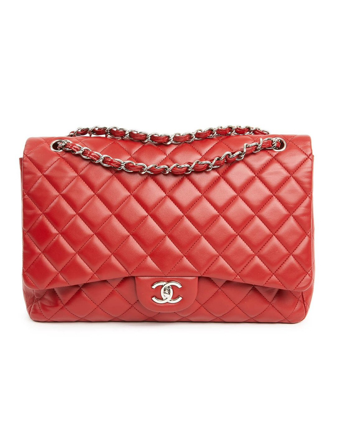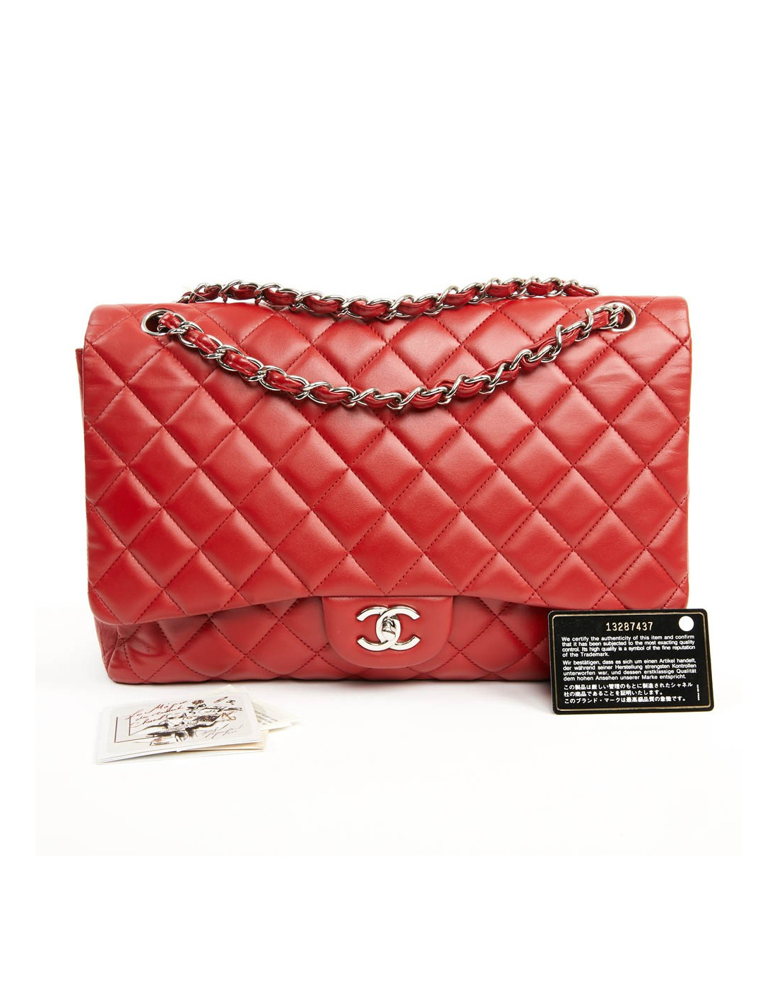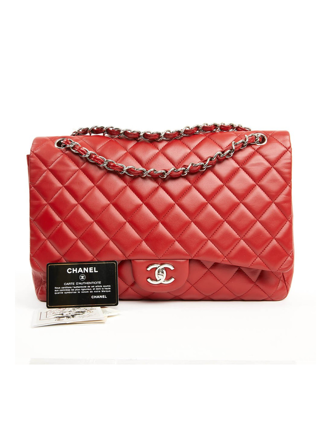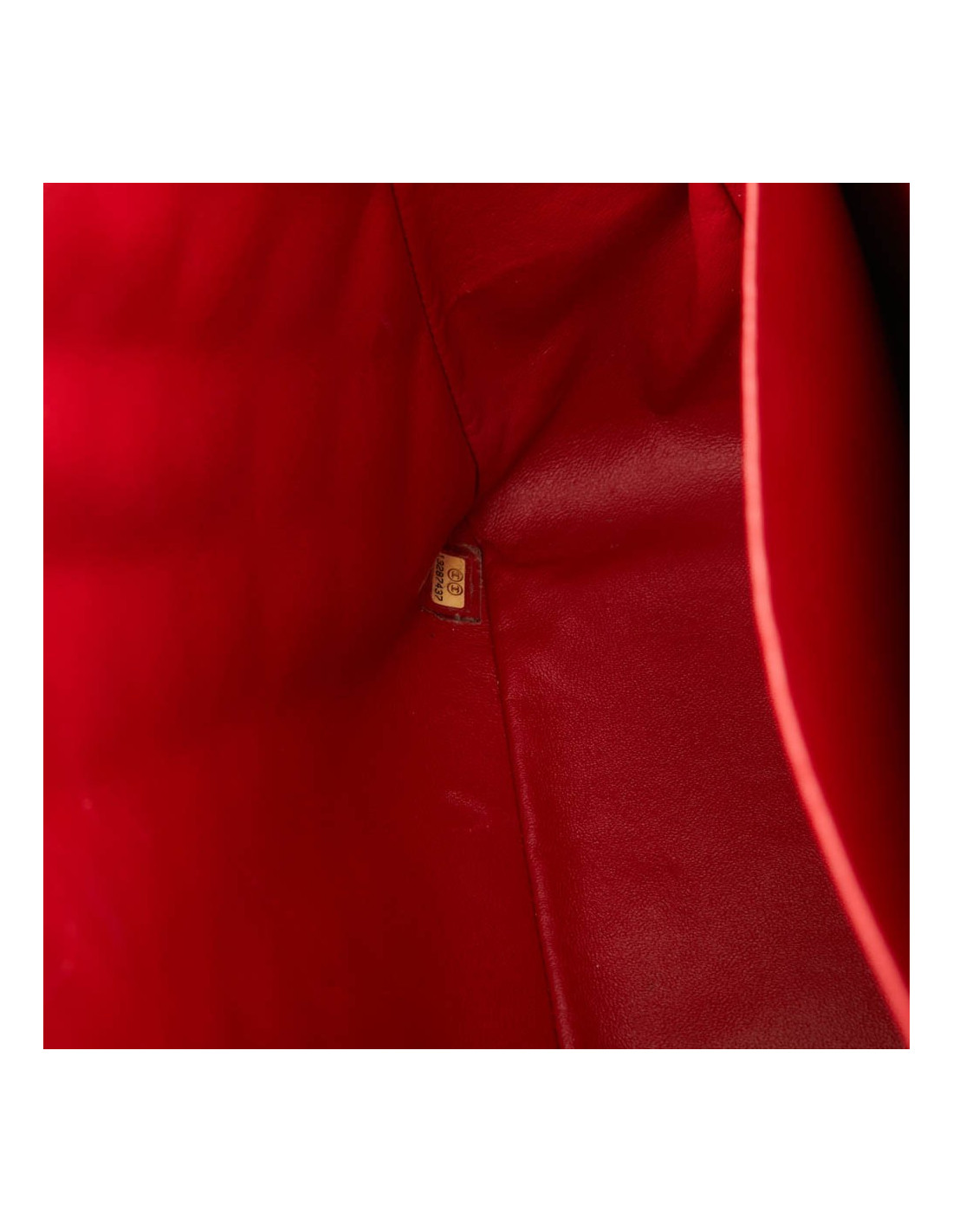 Chanel jumbo handbag, with a wide flap in red quilted leather. It was re-dyed in the authentic style by Germaine Lesèche, the famous dyer. It can be worn on the shoulder or cross-body. It is lined in leather with a double pocket, one of which is zipped.