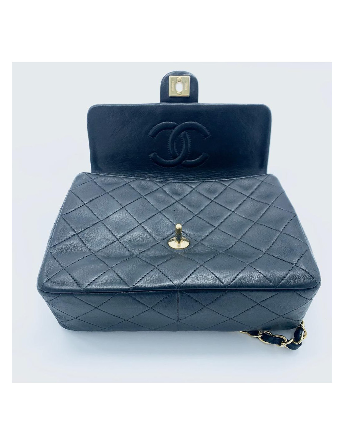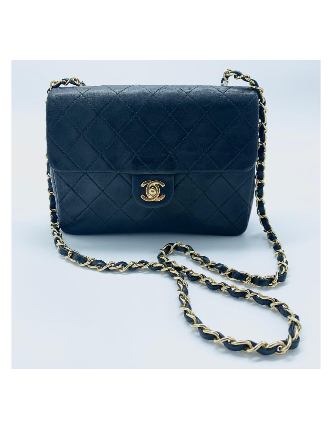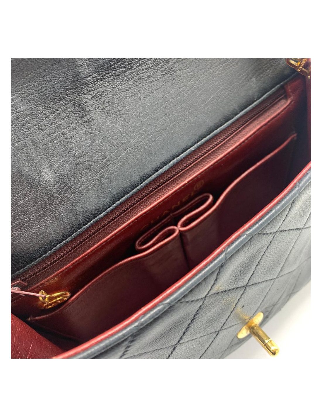 CHANEL vintage crossbody mini bag in black lambskin leather. It is in good condition. The jewelry is in gilt metal.