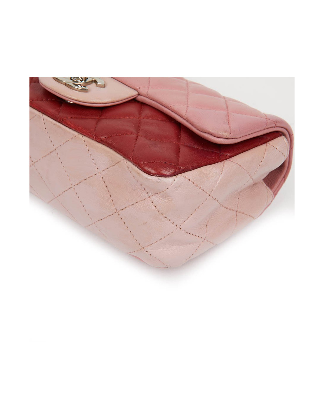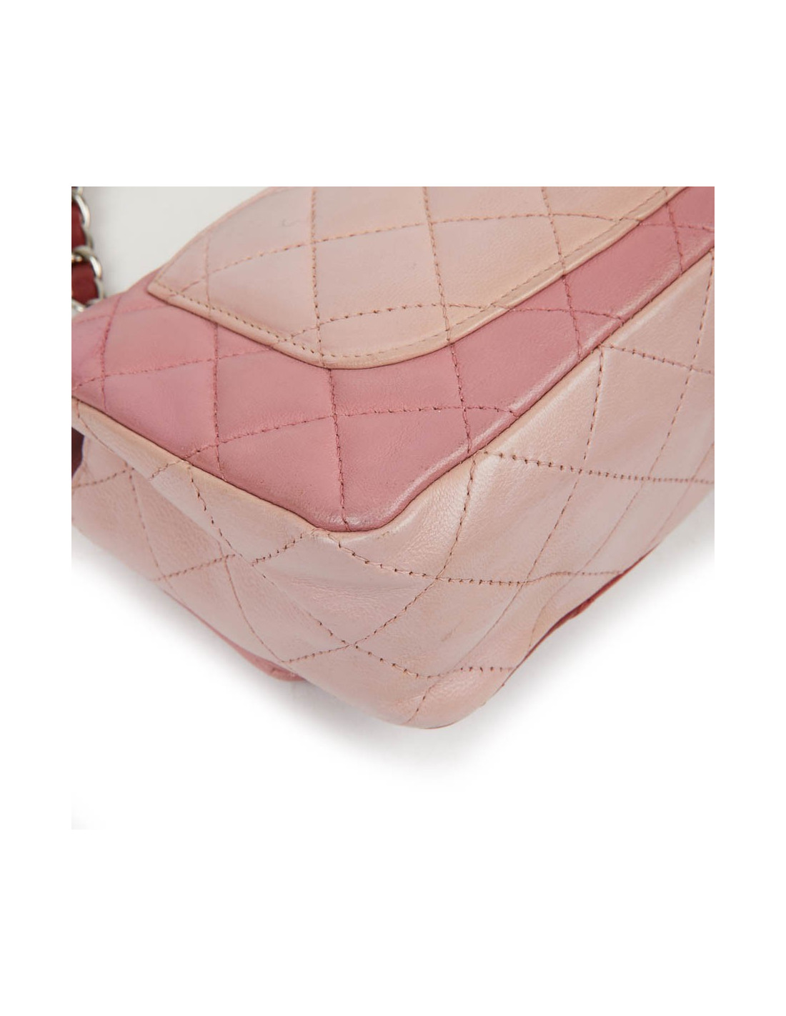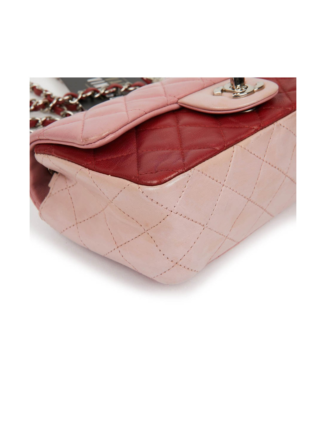 Mini Timeless CHANEL bag in tricolor, powder pink, pink and red lambskin. The jewelry is in silver metal.