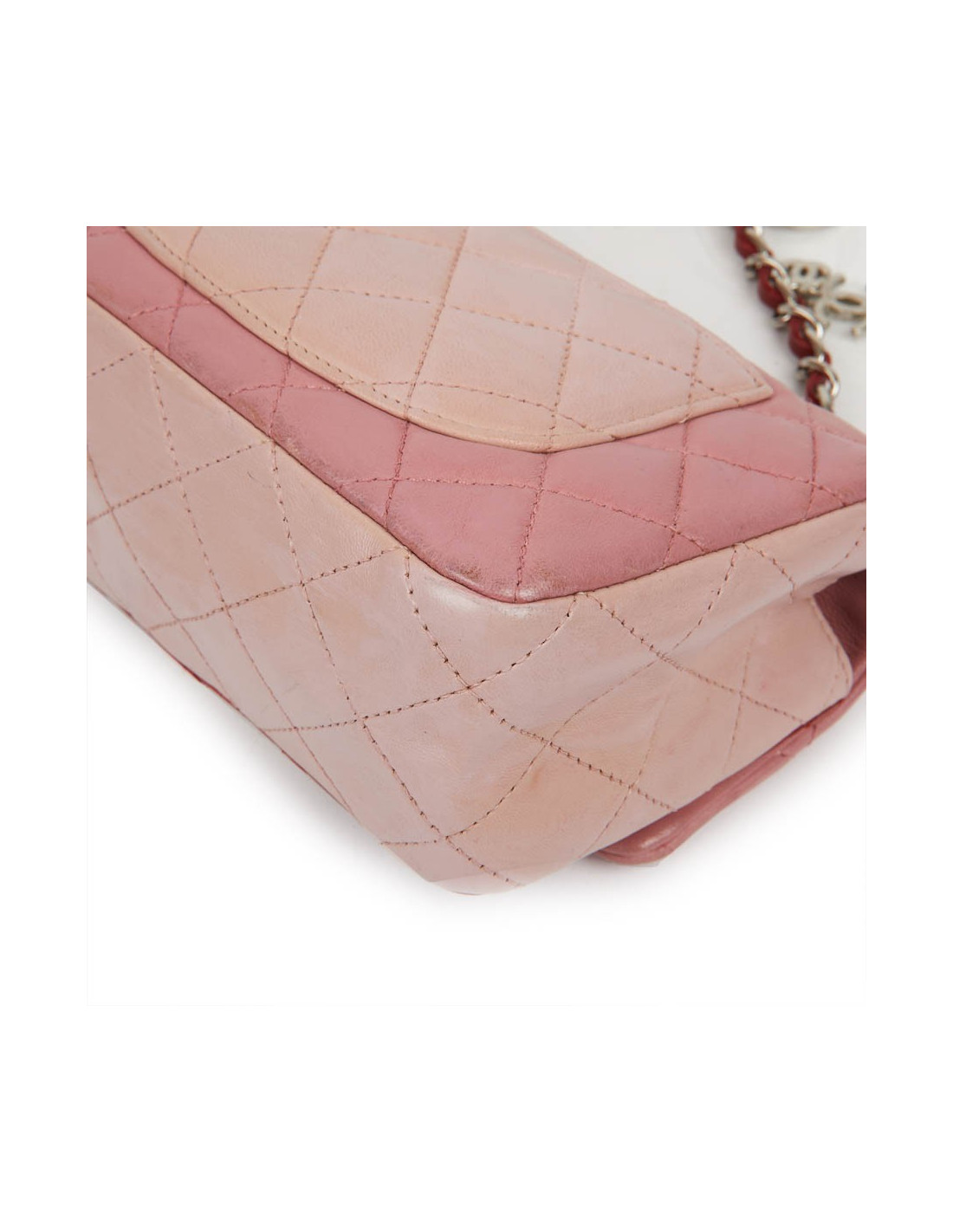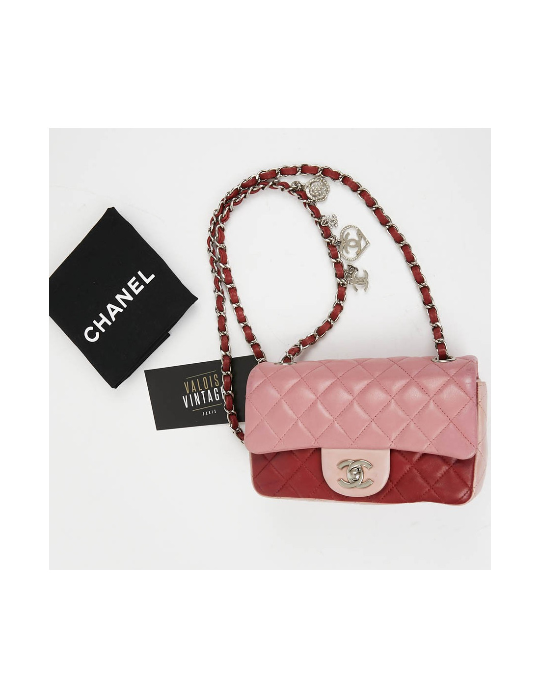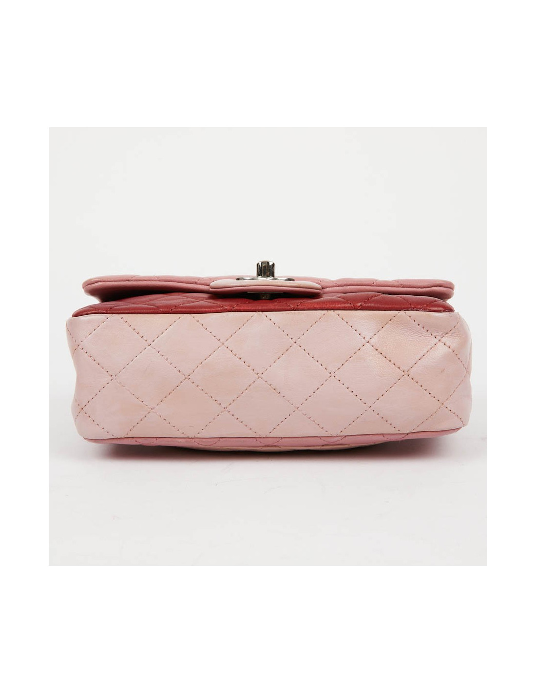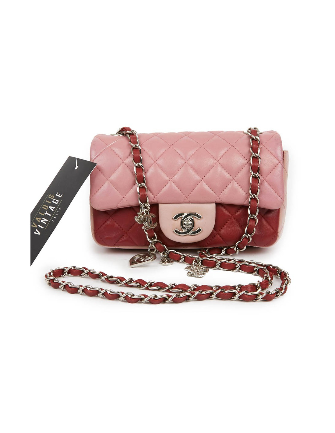 Mini Timeless CHANEL bag in tricolor, powder pink, pink and red lambskin. The jewelry is in silver metal.