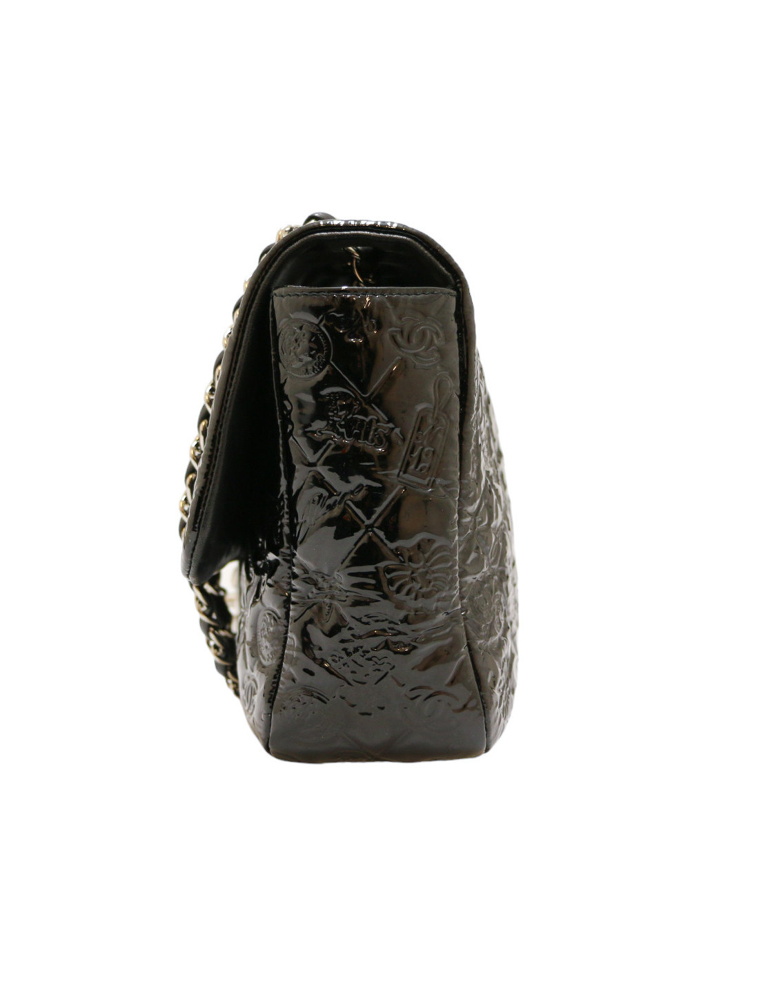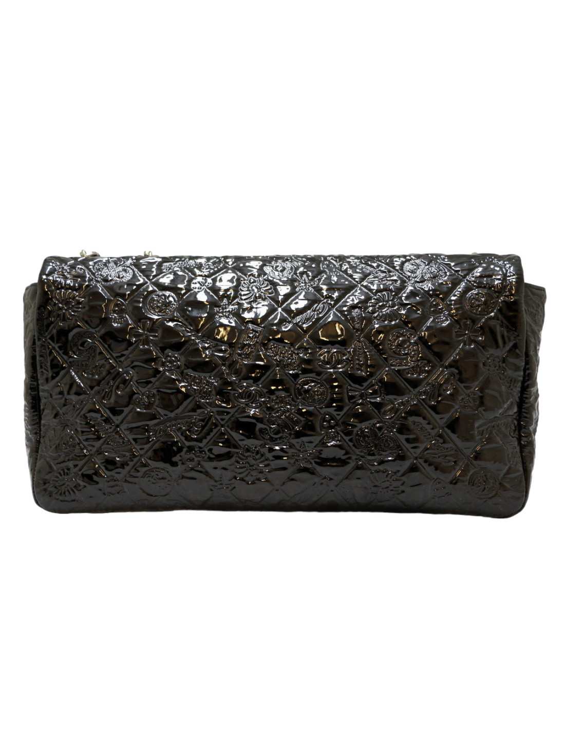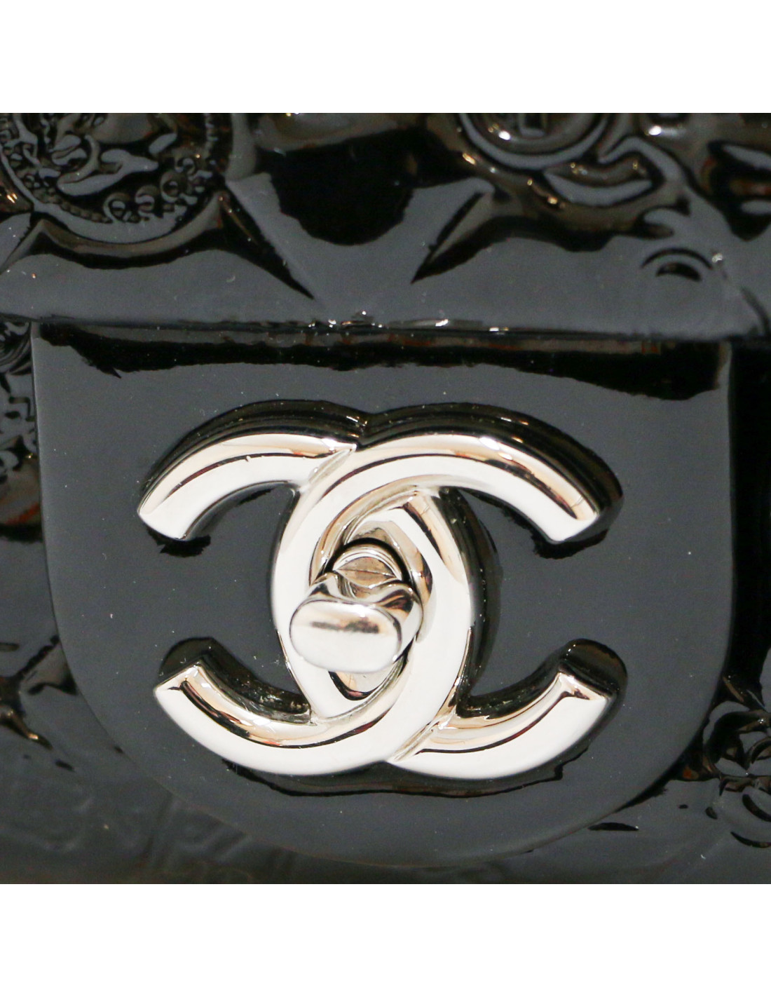 Details : patent leather bag embossed with symbols representing the Maison Chanel emblems: the coin with Gabriel Chanel's portrait, the clover, N°5 and others