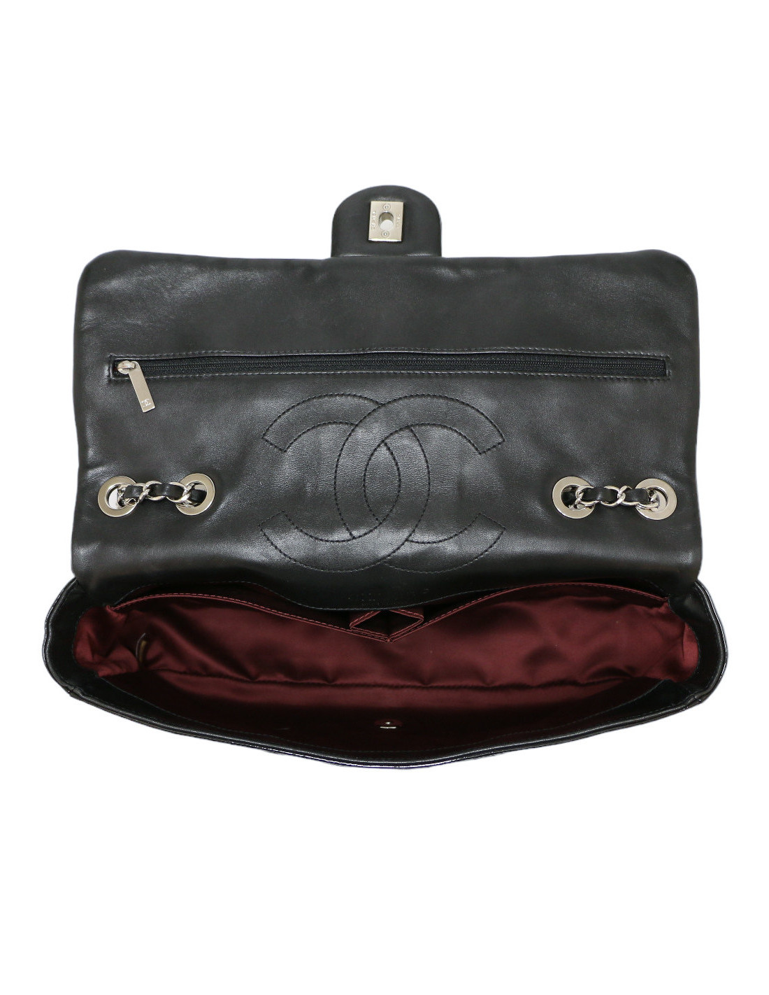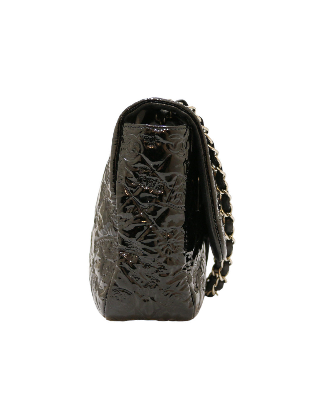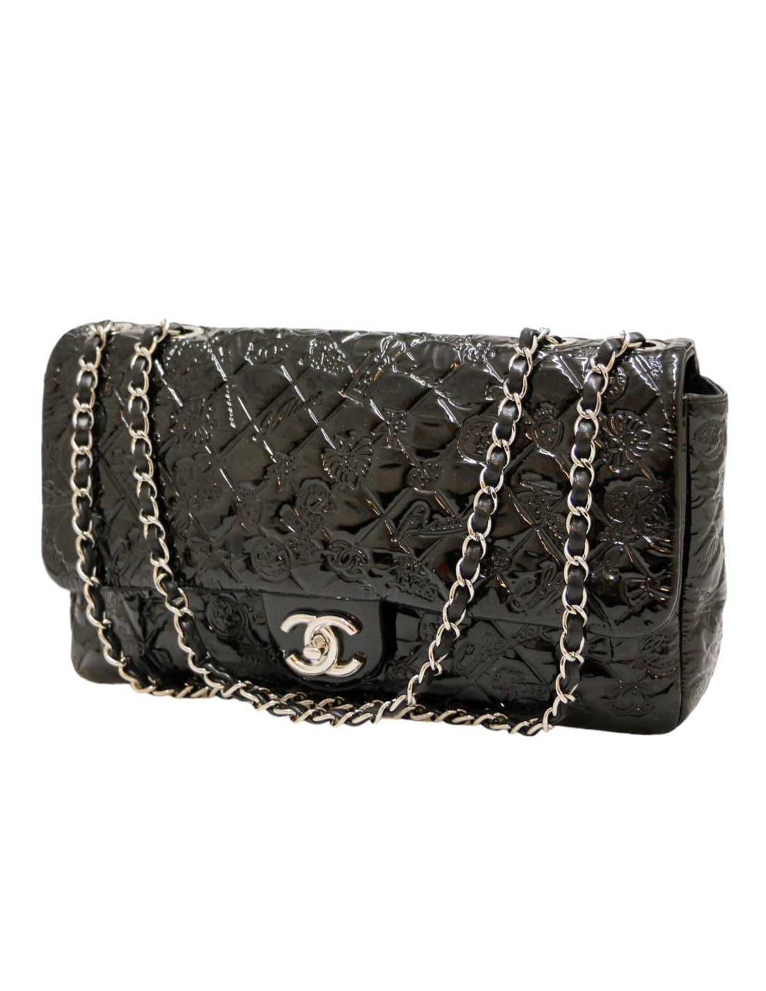 Details : patent leather bag embossed with symbols representing the Maison Chanel emblems: the coin with Gabriel Chanel's portrait, the clover, N°5 and others