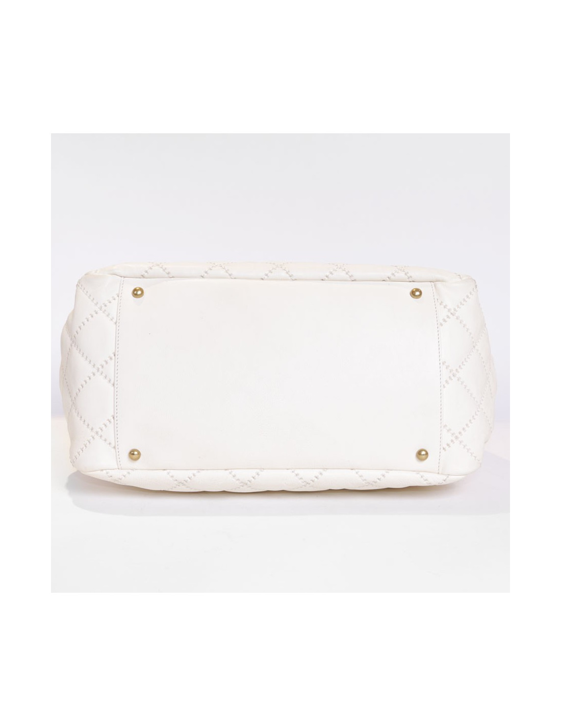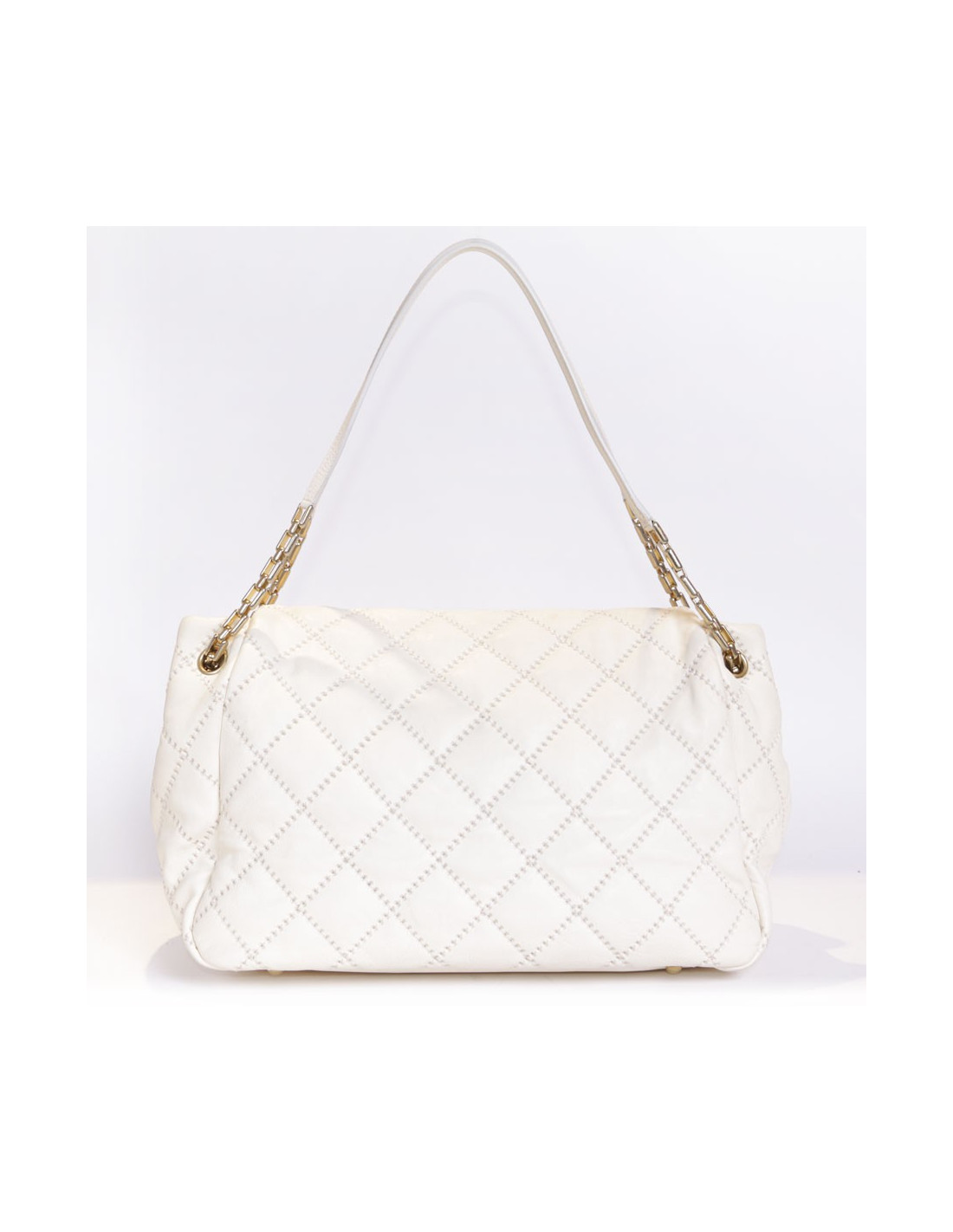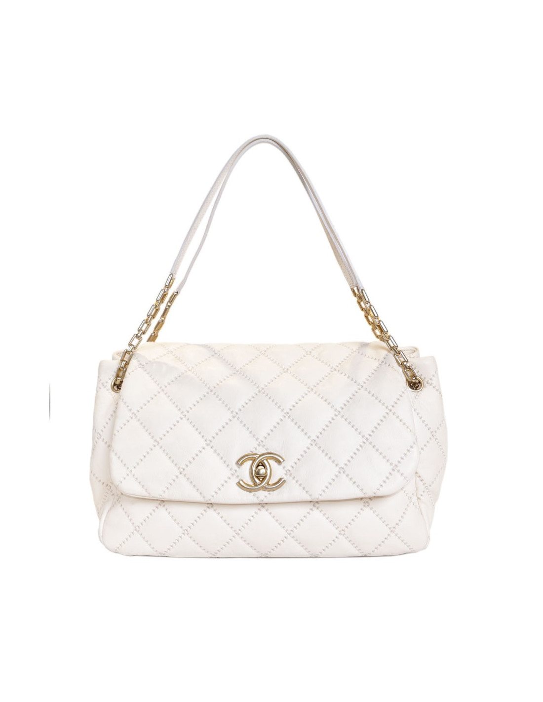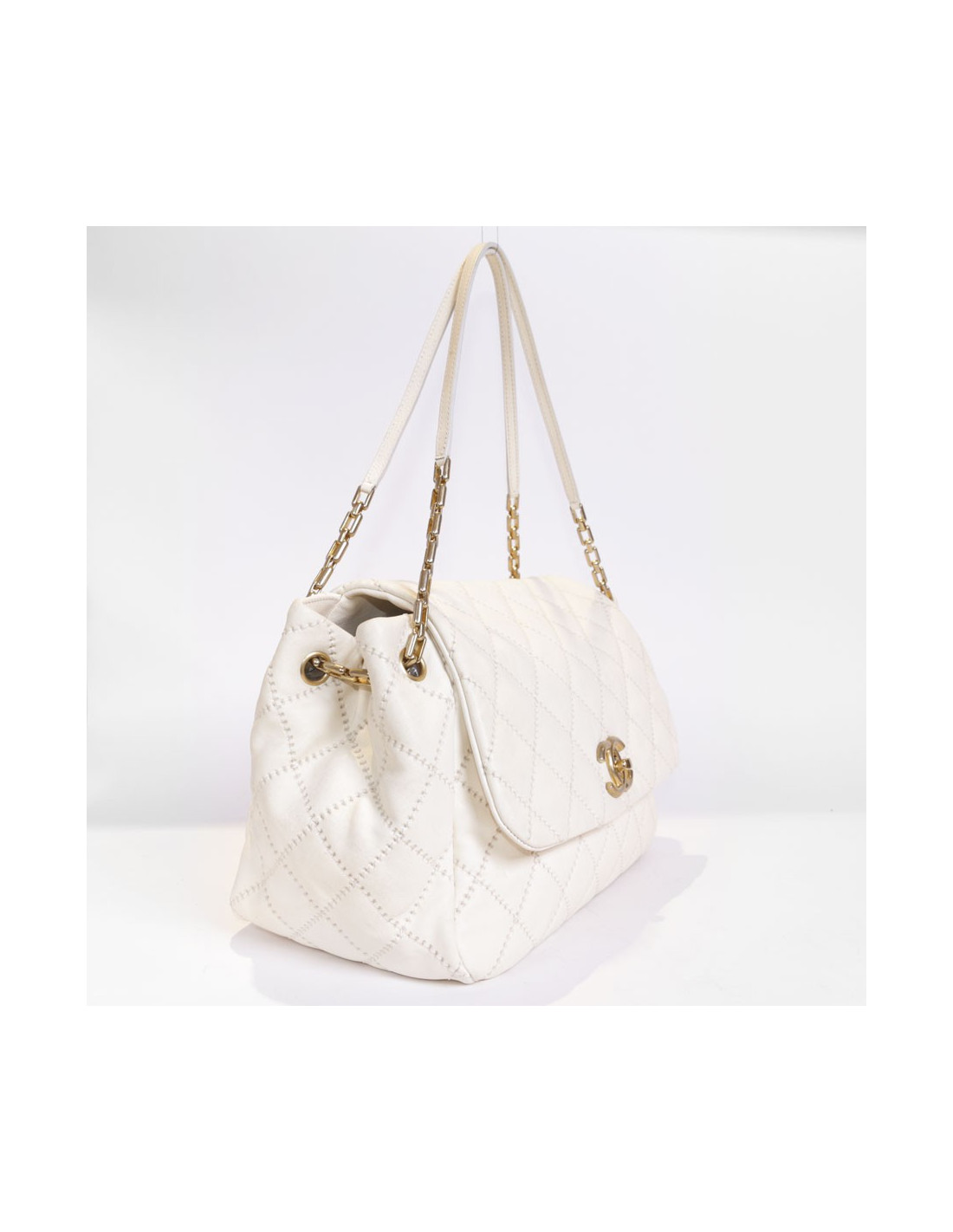 Bag leather eggshell quilted Chanel House. The jewelry is gold metal aged patina. Clasp 'CC'. The Interior is canvas with 3 pockets including 1 zipped and 1 for smartphone. Hologram: 1660... No authenticity card.