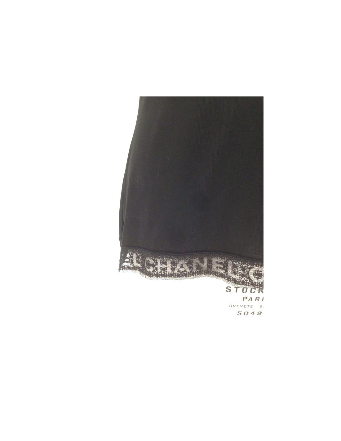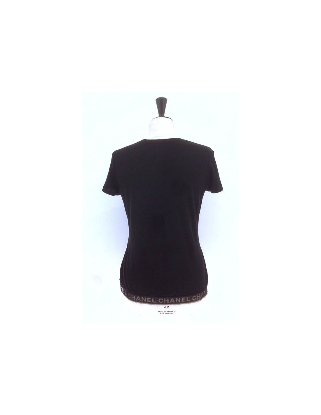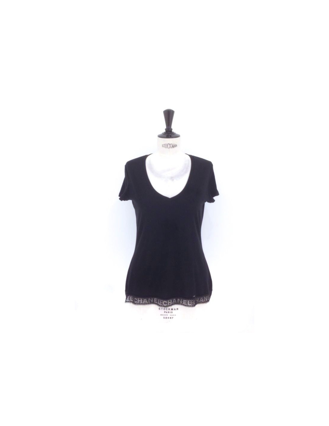 T-shirt short sleeves CHANEL Black 100% cotton, size 42. At the bottom of this top to the plunging V-neck, was of very pretty lace inlay style embroidery "CHANEL".