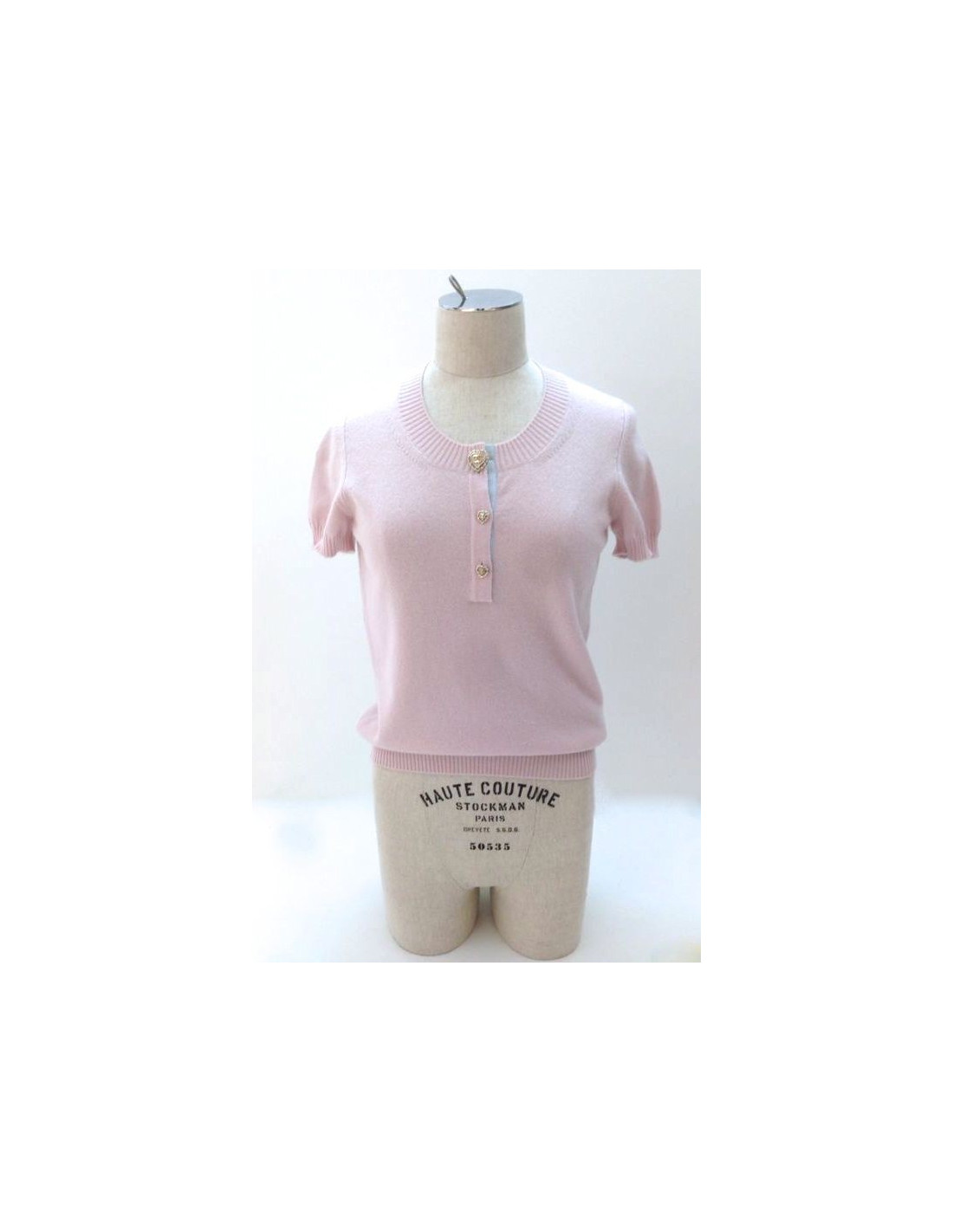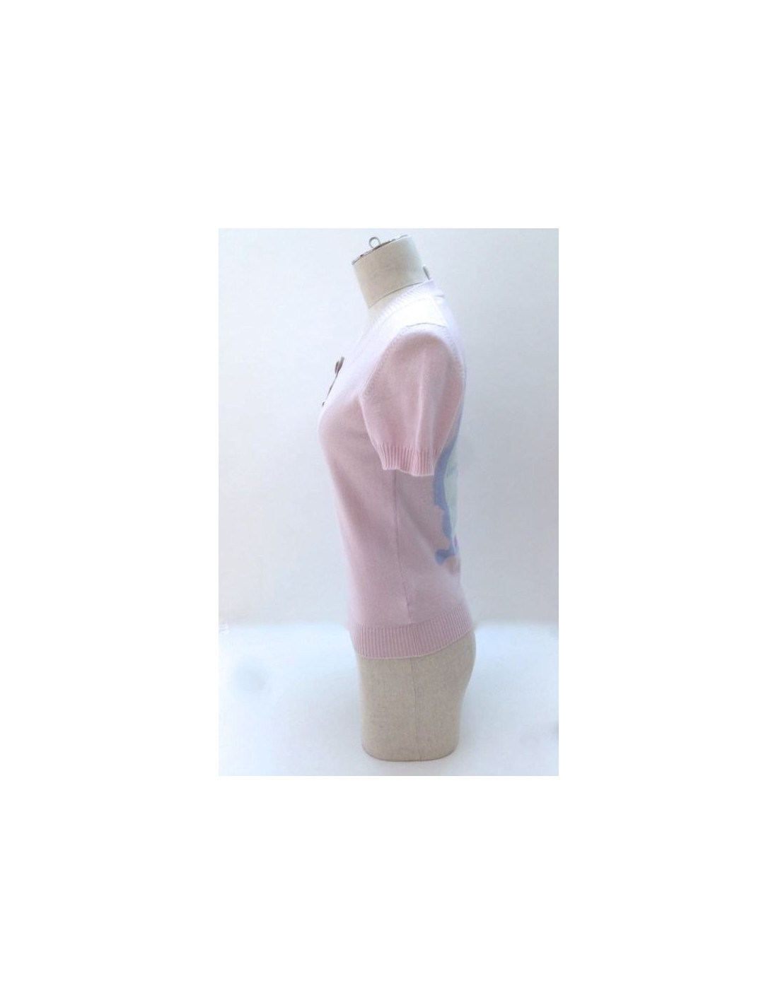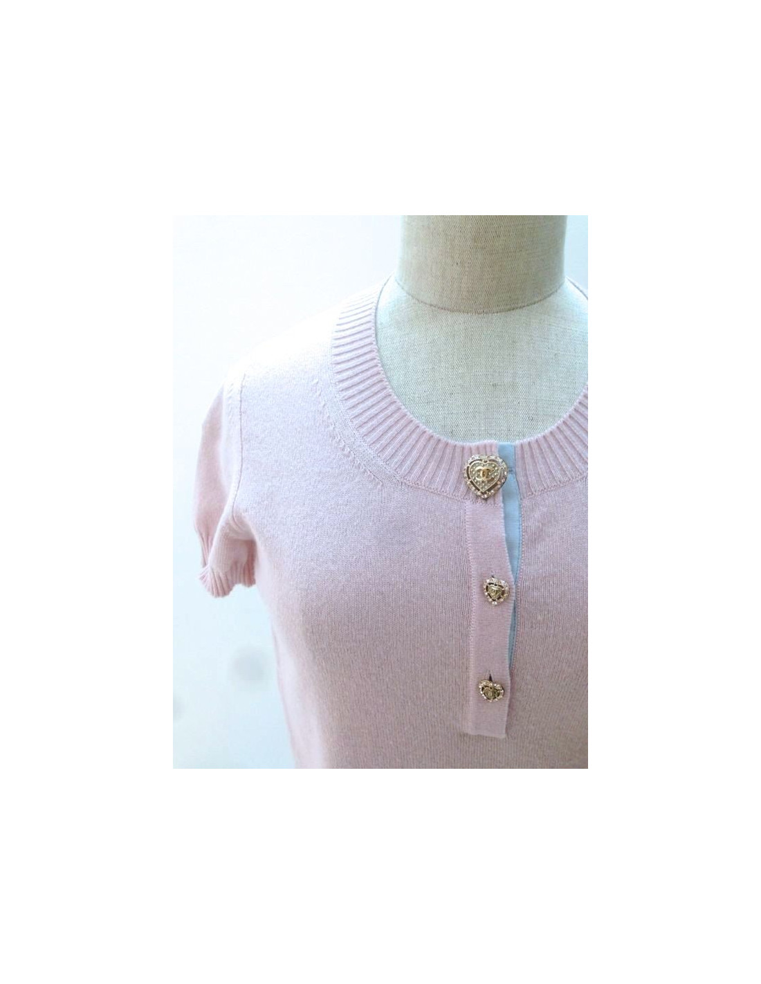 Top CHANEL, size 36, cruise 2009 collection. This feminine piece can be worn very casual. At the front, collar is adorned with three stunning gold, heart shaped, acronyms CC, and surrounded by silver and pale pink rhinestone buttons. The back is embroidered a drawing in the form of baroque mirror, color sky blue, light yellow. There are inscribed "MIAMI", "CHANEL CRUISE", "2008-2009 '.