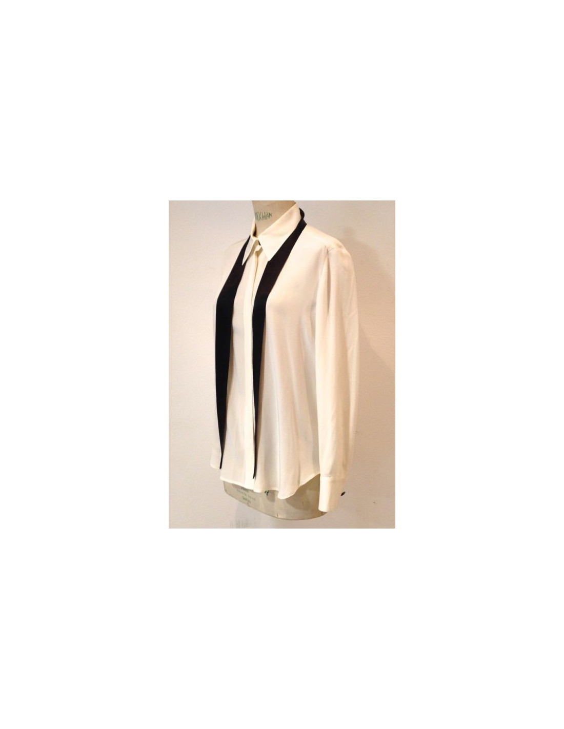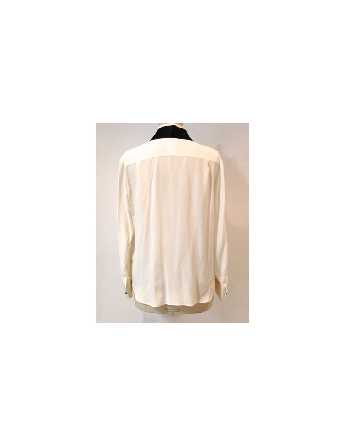 CHANEL shirt silk white and black. Paw hidden with acronyms white mother-of-Pearl "CHANEL Paris" buttons. On the sleeve buttonholes, very nice buttons Black Silver hammered and acronyms CC. Along the pass, a lovely white satin ribbon can be tied around the neck or left in a sling chic. Made in France.