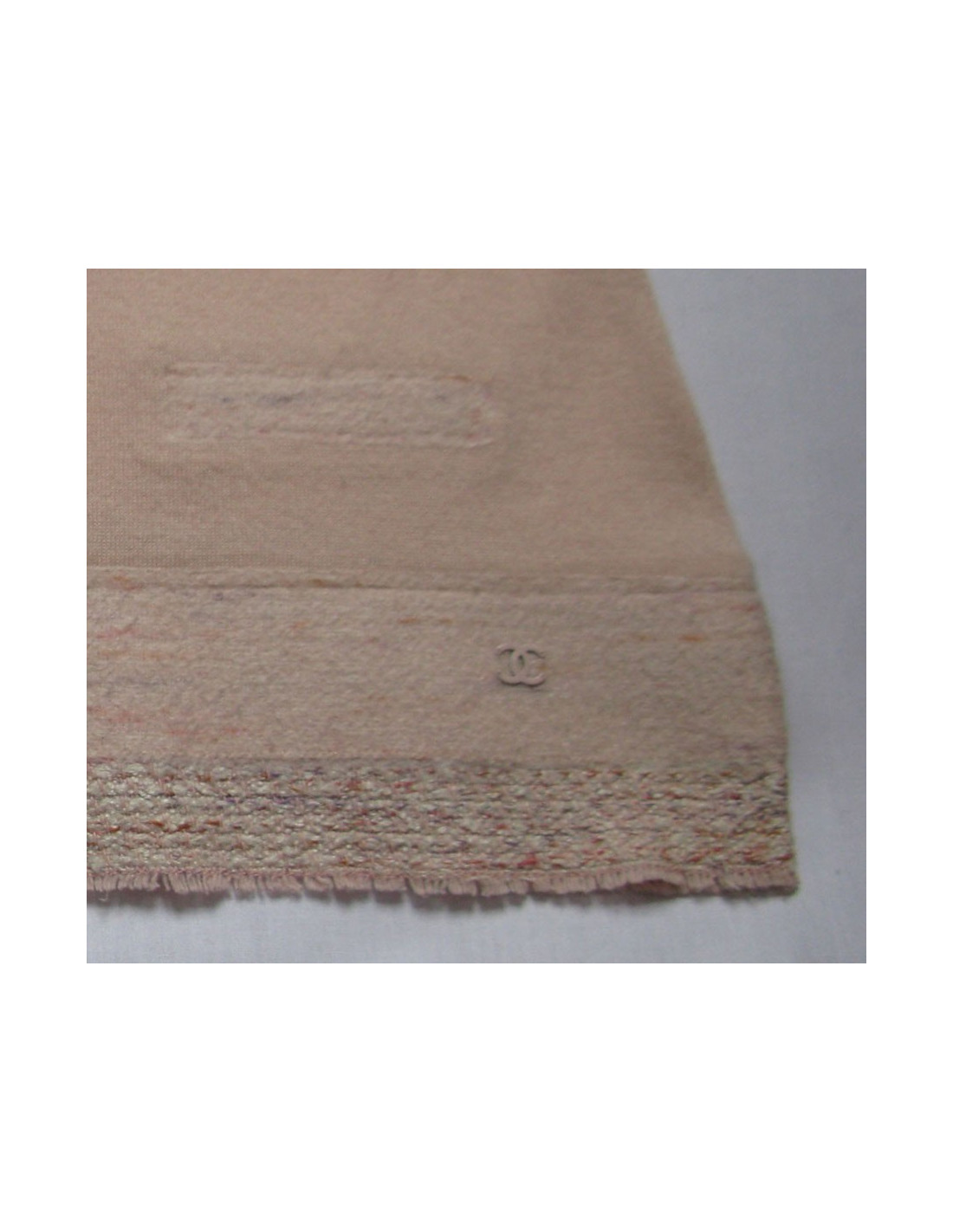 Elegant! Chanel cashmere sweater pink T38FR, round neck, short sleeves, line adjusted, split from each side of the hips, contrasting stitching (pink, coral, purple, white) silk thread and cotton on the sleeve edge, at the bottom of the sweater assorted small fringes. At the bottom left is the logo of the brand "CC", small pockets of decoration supported at the level of the taille.100% Kashmir. Inlay 52% silk, 48% cotton. Length: 57 cm, Chest width: 40 cm Sleeve length: 21cm, Build: 38 cm Very good condition: small patch on the front, (pretty dimmed).