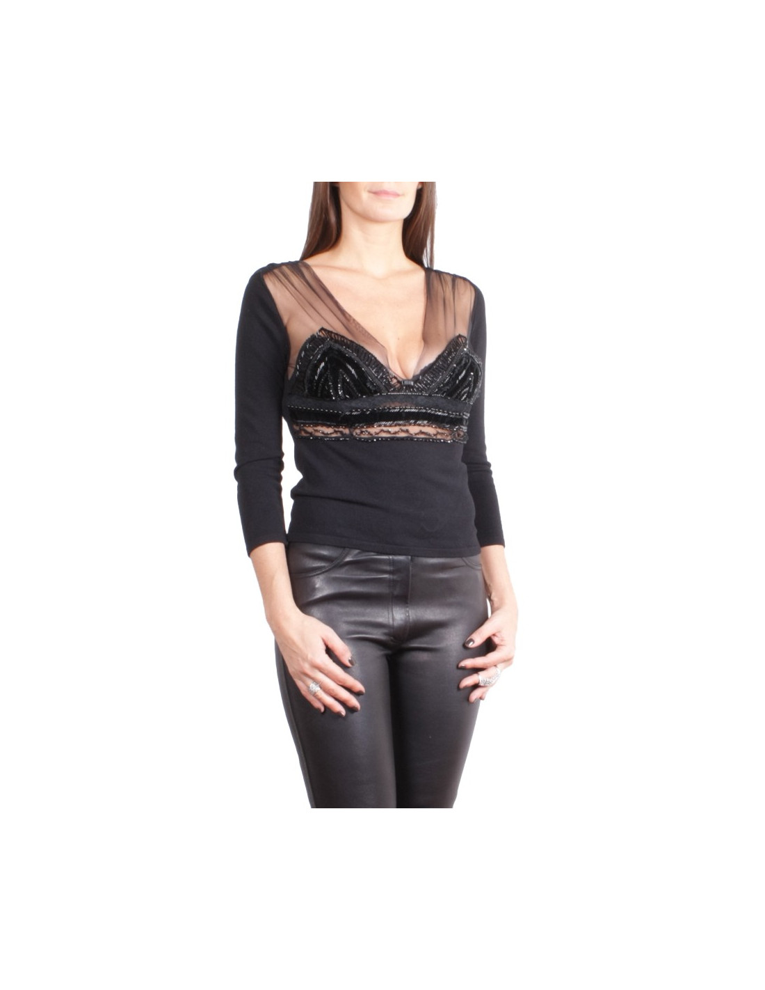 Top VALENTINO T 38 EN, wool and cashmere, embroidered with sequins and black pearls on the chest in black tulle.