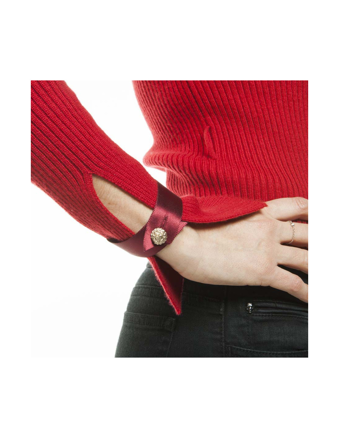 < p style = "text - align:center;" >The wrists are open and closes with a plum Ribbon satin finishing with a button.