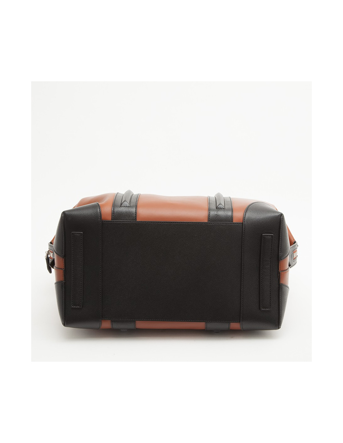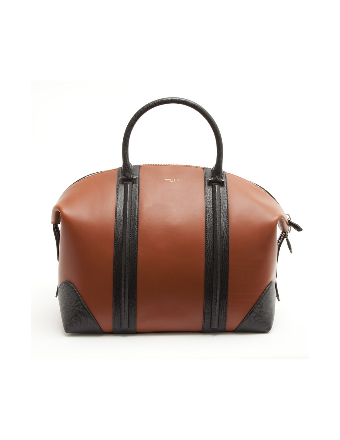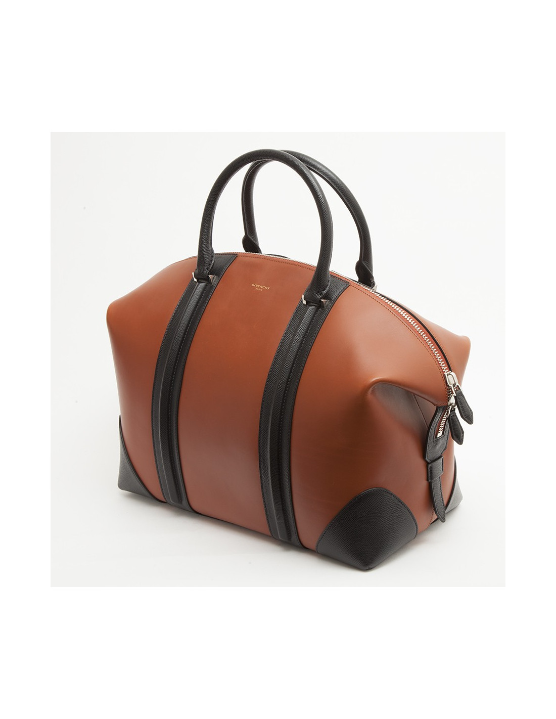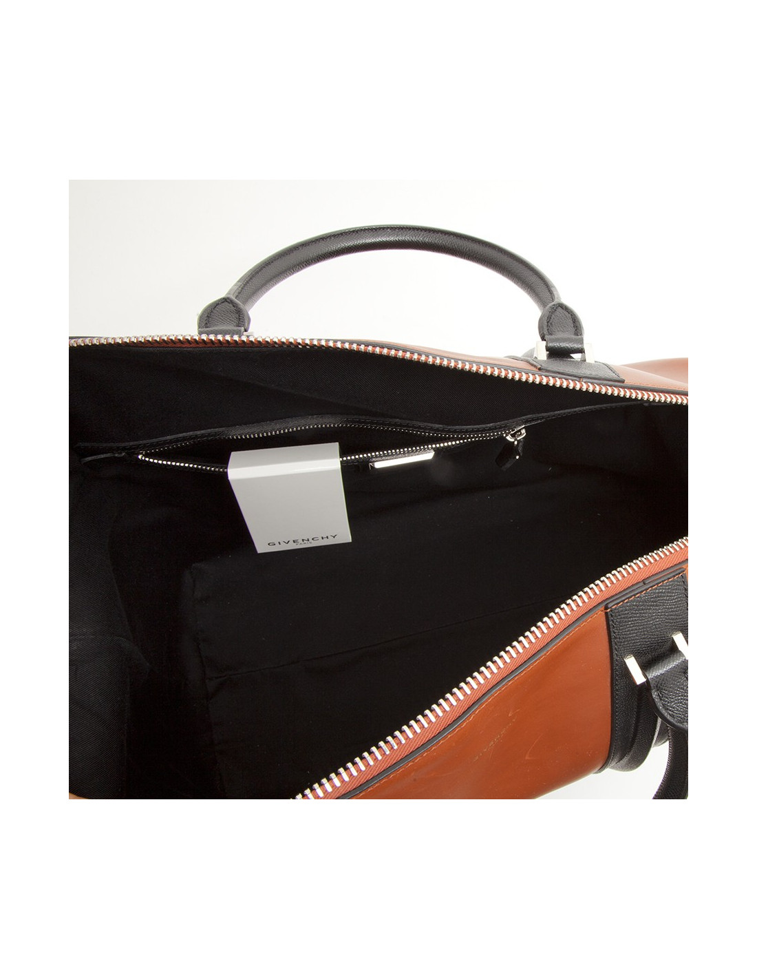 GIVENCHY 24 HOUR bag in box camel leather and black grained leather. Silver metal hardware. It has a double zipper. Worn by hand