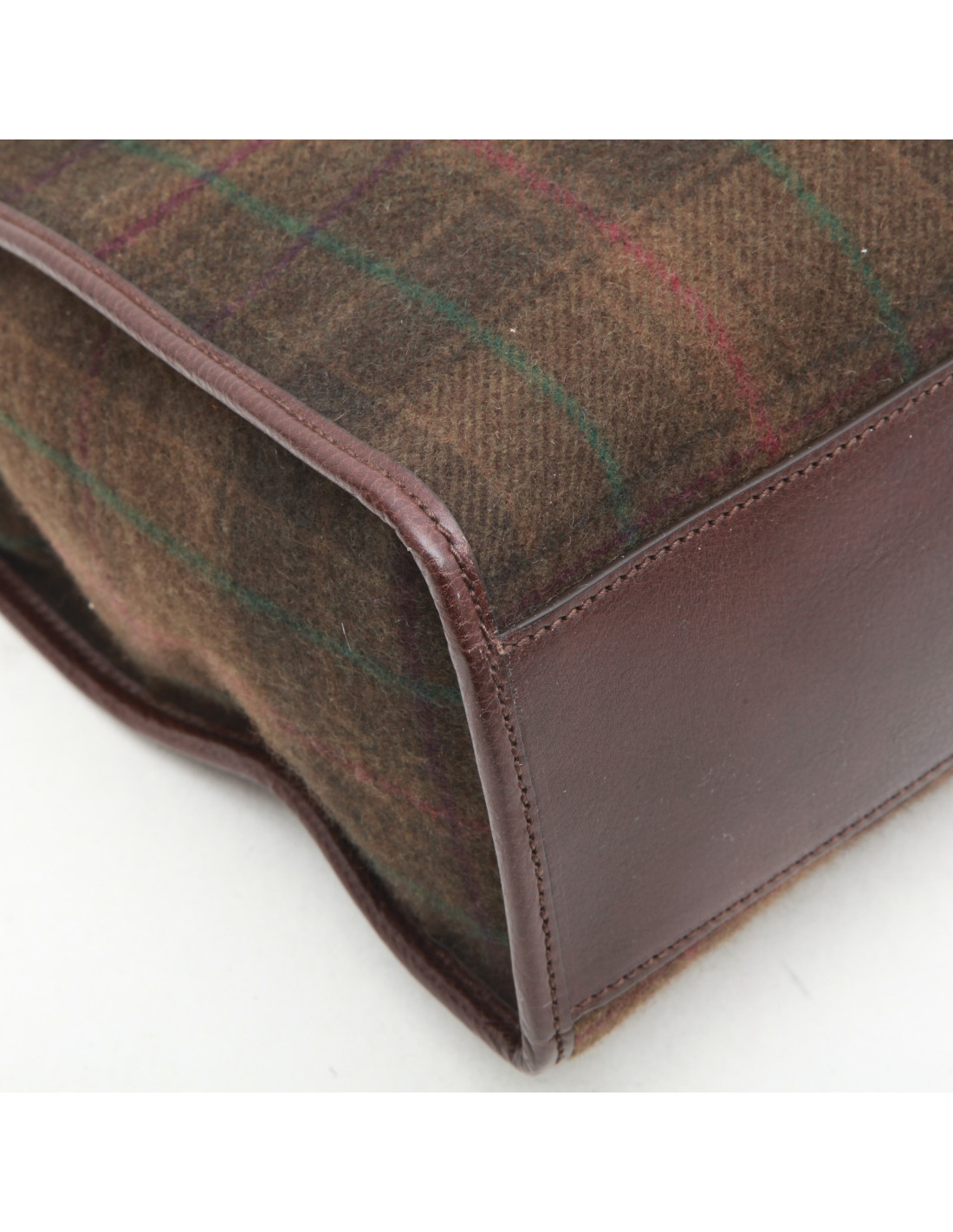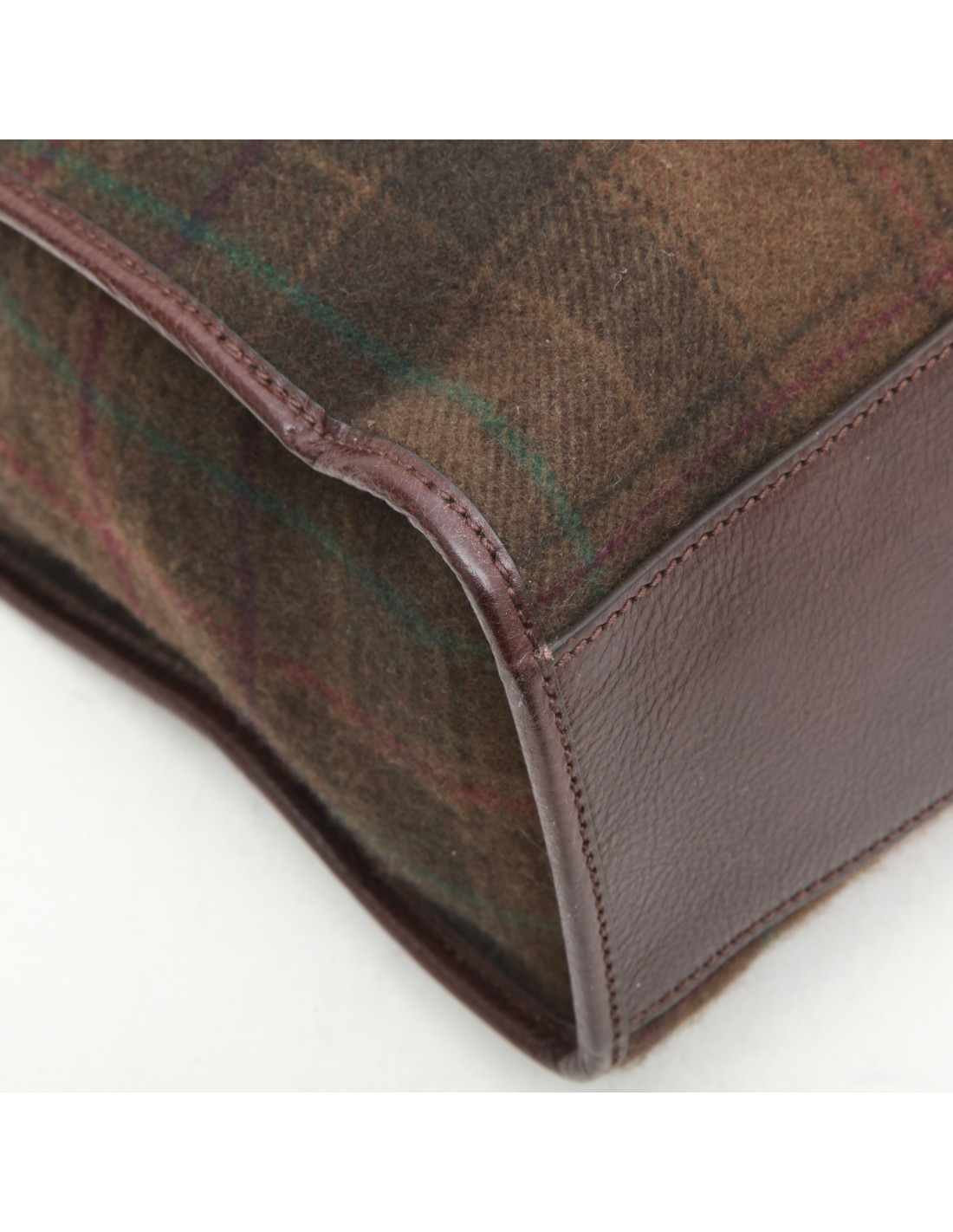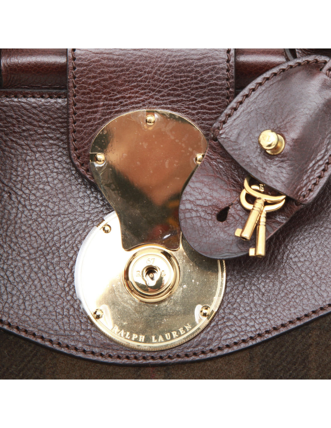 Ralph Lauren bag in wool, English green tartan pattern, brown grained leather. Gold hardware. Made in Italy. Worn by hand or on the shoulder with removable shoulder strap. Keys and address holder. Brand-new condition. Plastics are present on the clasp. It is lined in purple fabric with 4 pockets, one of which is zippered. Authenticity card 313767