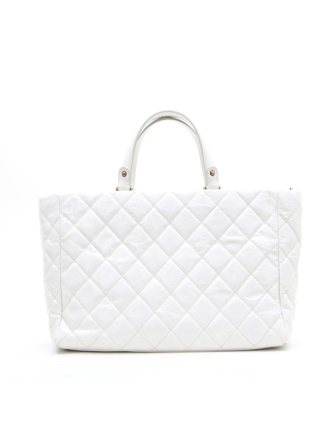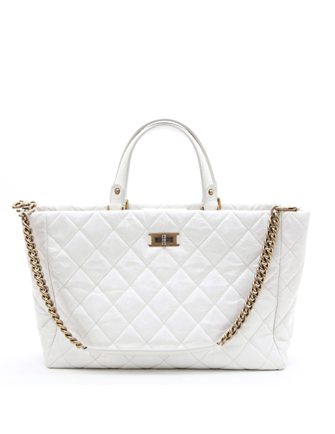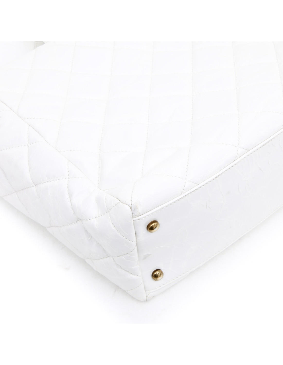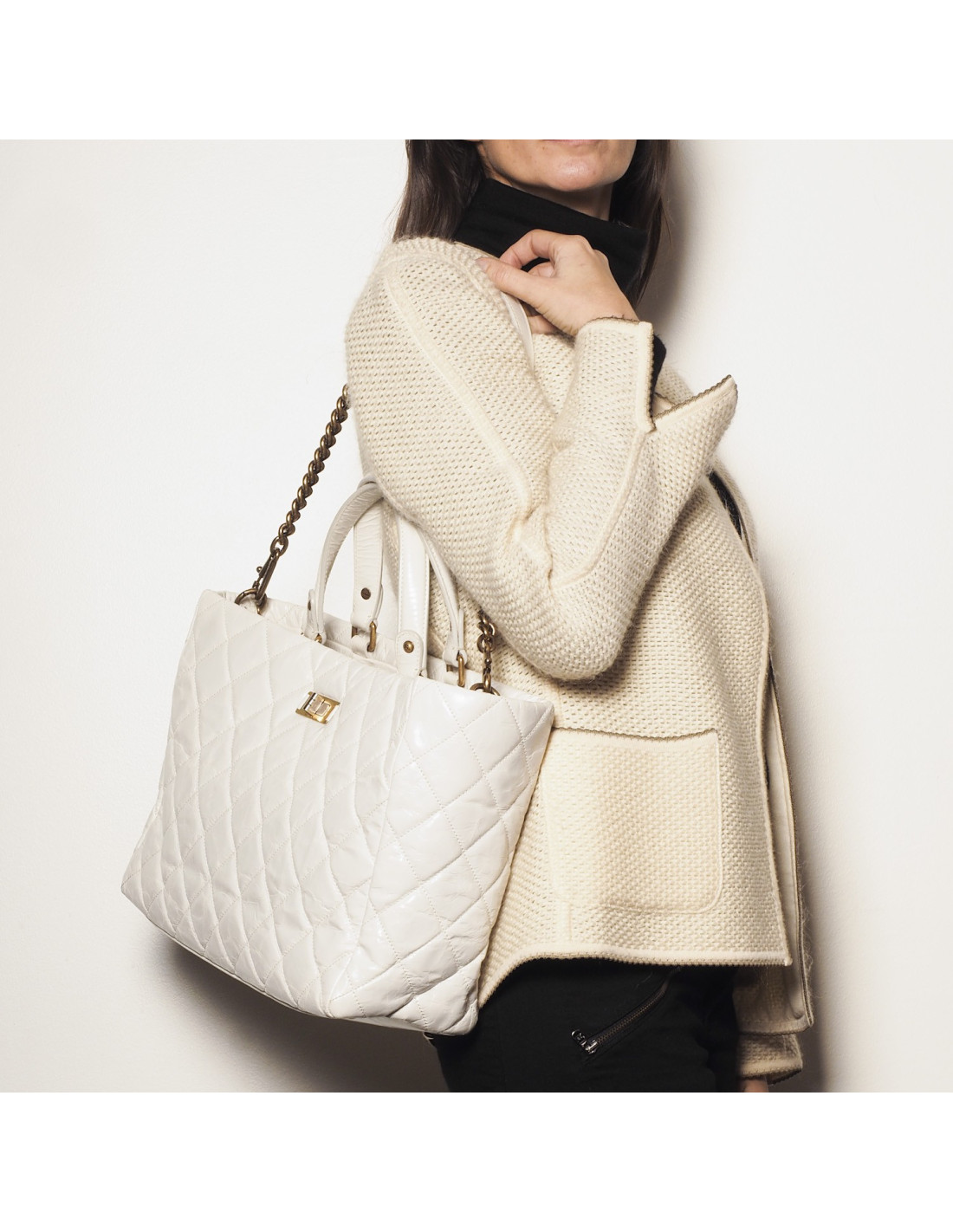 Chanel tote bag in aged white patent leather. Clasp 2.55 two-tone gold and silver.