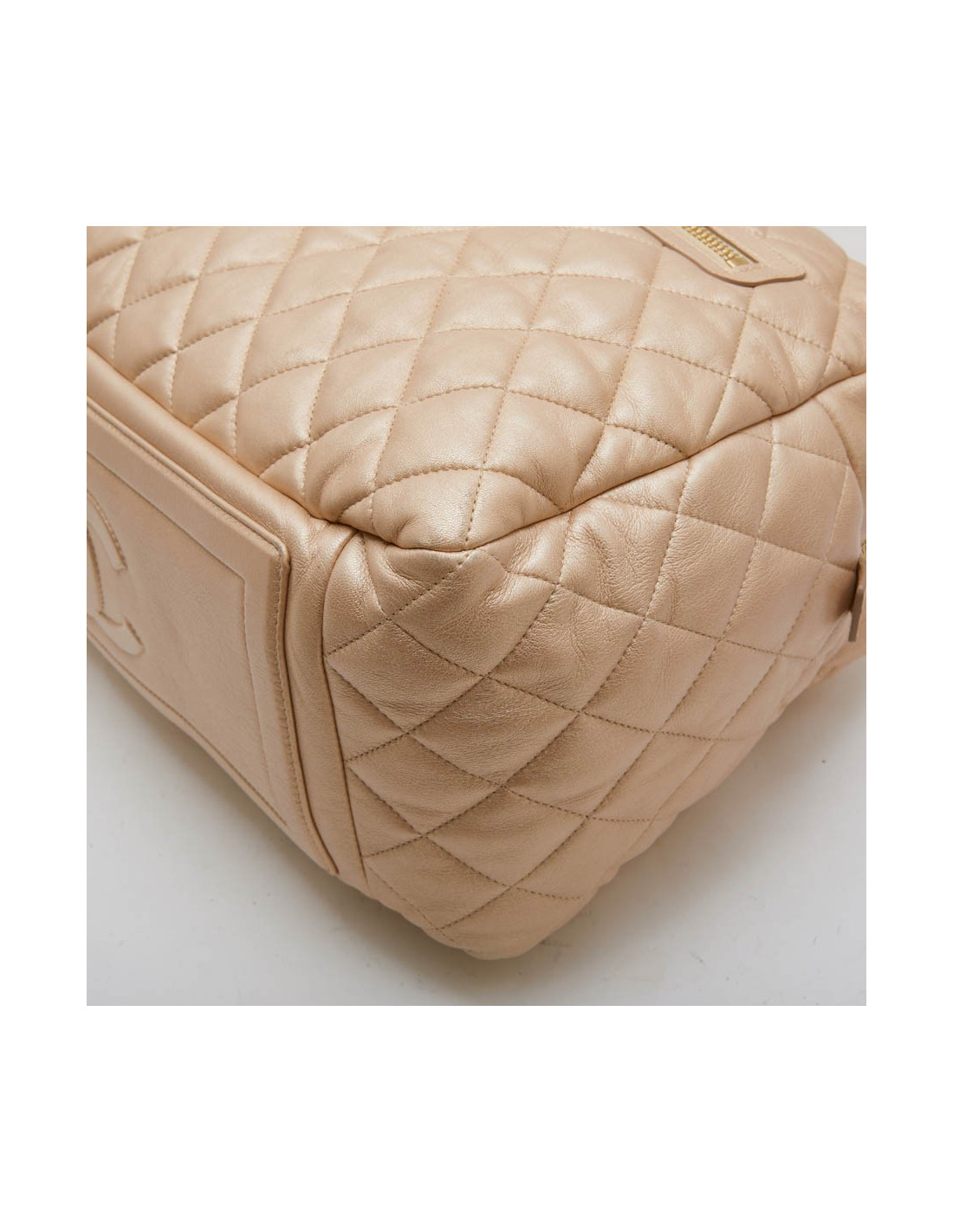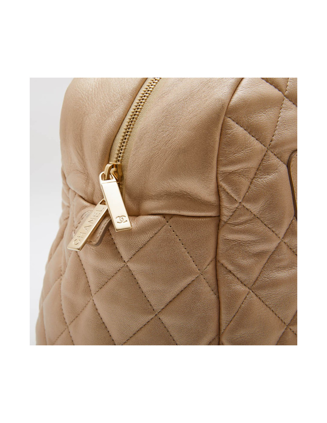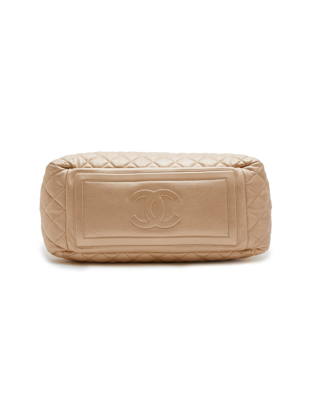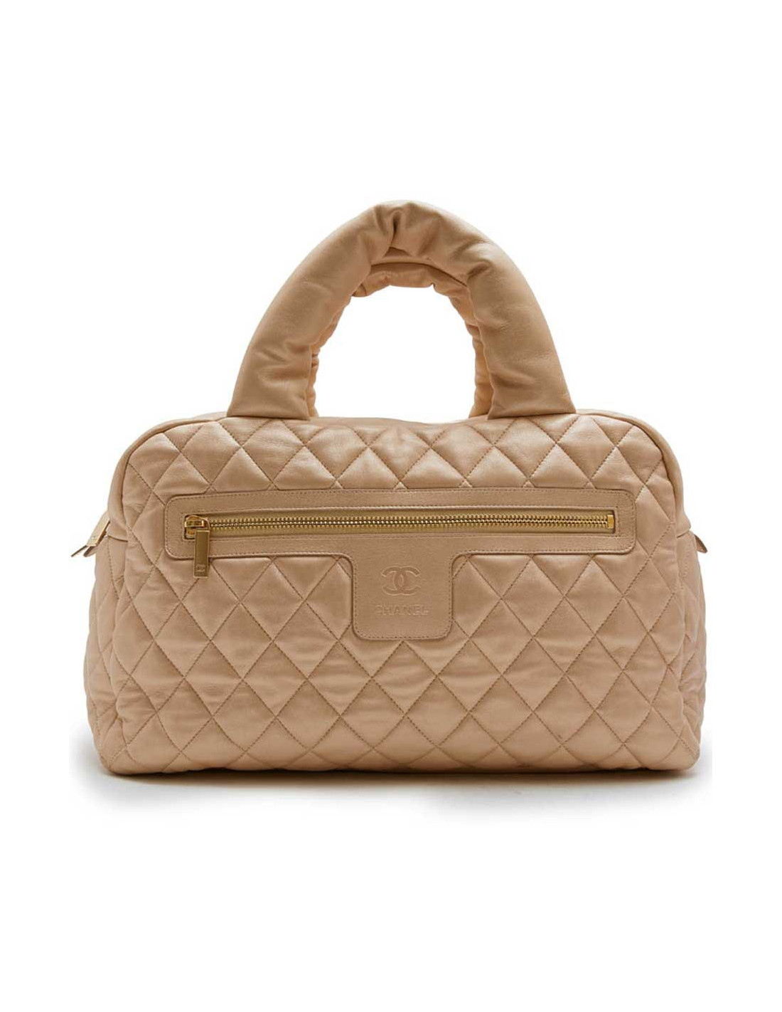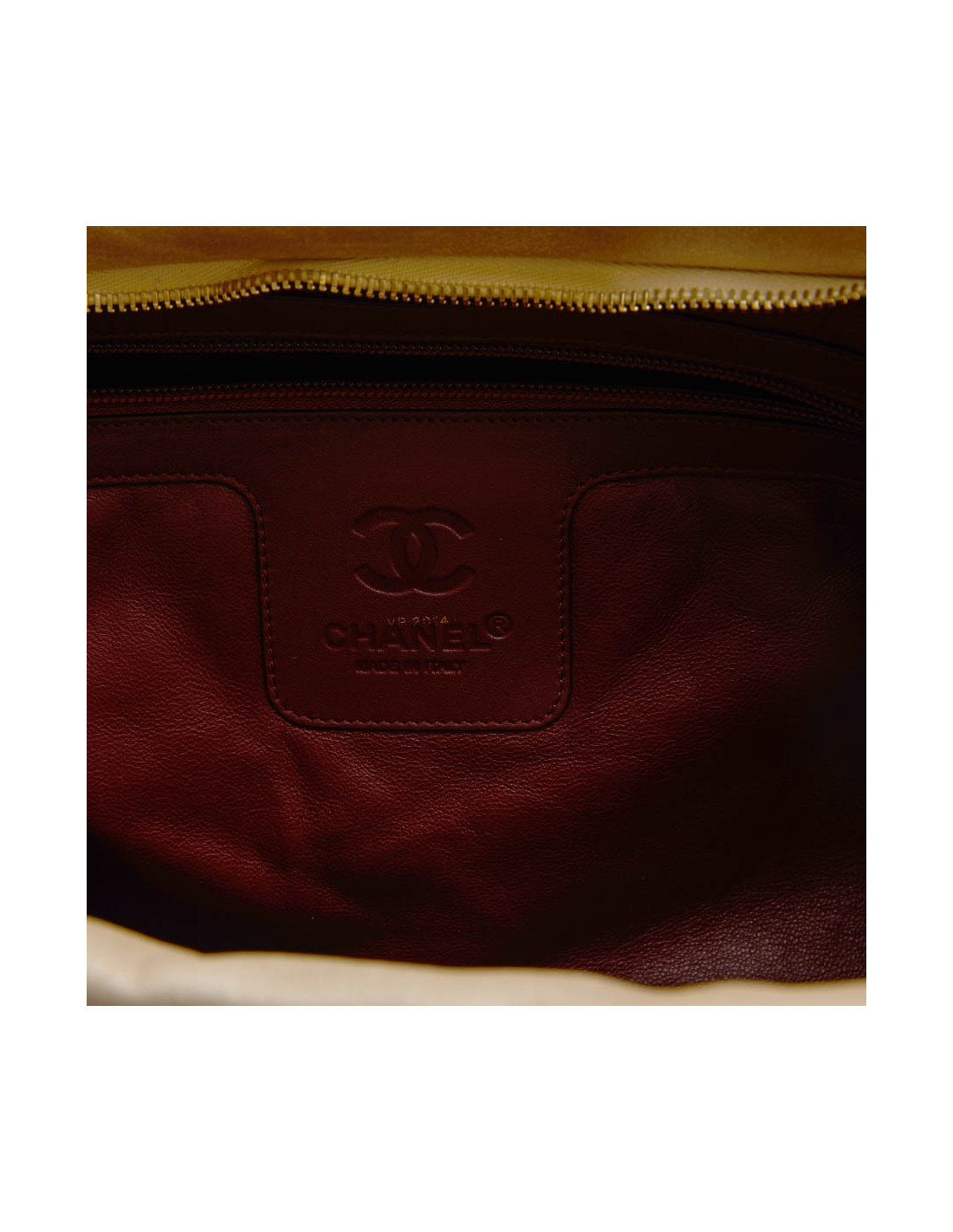 Chanel 'Cocoon' bag in gold quilted leather. It is fully lined in burgundy leather with a zipped pocket and a keychain.