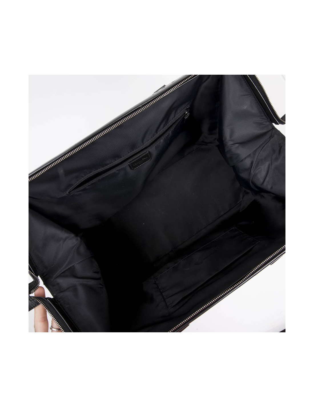 Palladium silver metal hardware. Integral zipper. The inside is in dark blue canvas with a patch pocket and a zipped pocket. You have bottom feet to protect the bag.