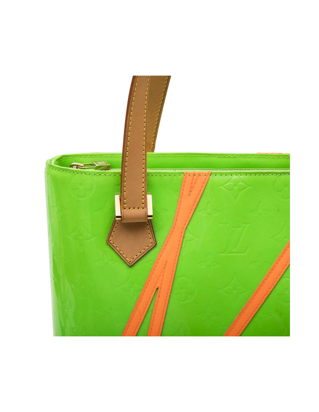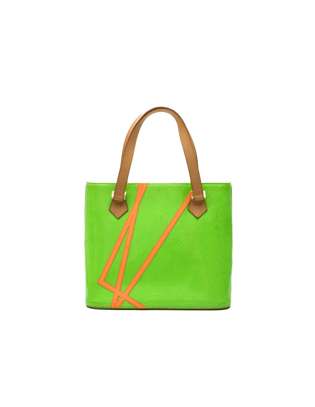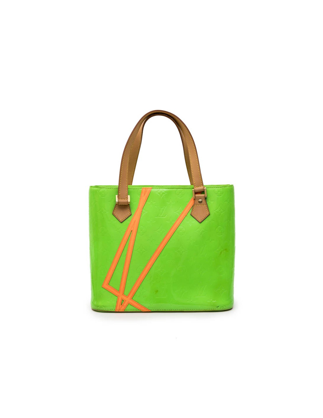 Louis Vuitton 'Houston' bag in neon green monogram patent leather. Limited Series by Robert Wilson. Gilded hardware. Zip closure. Natural cowhide finishes.