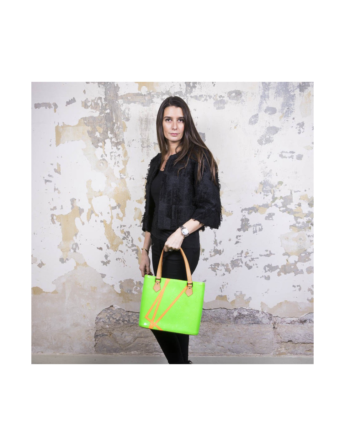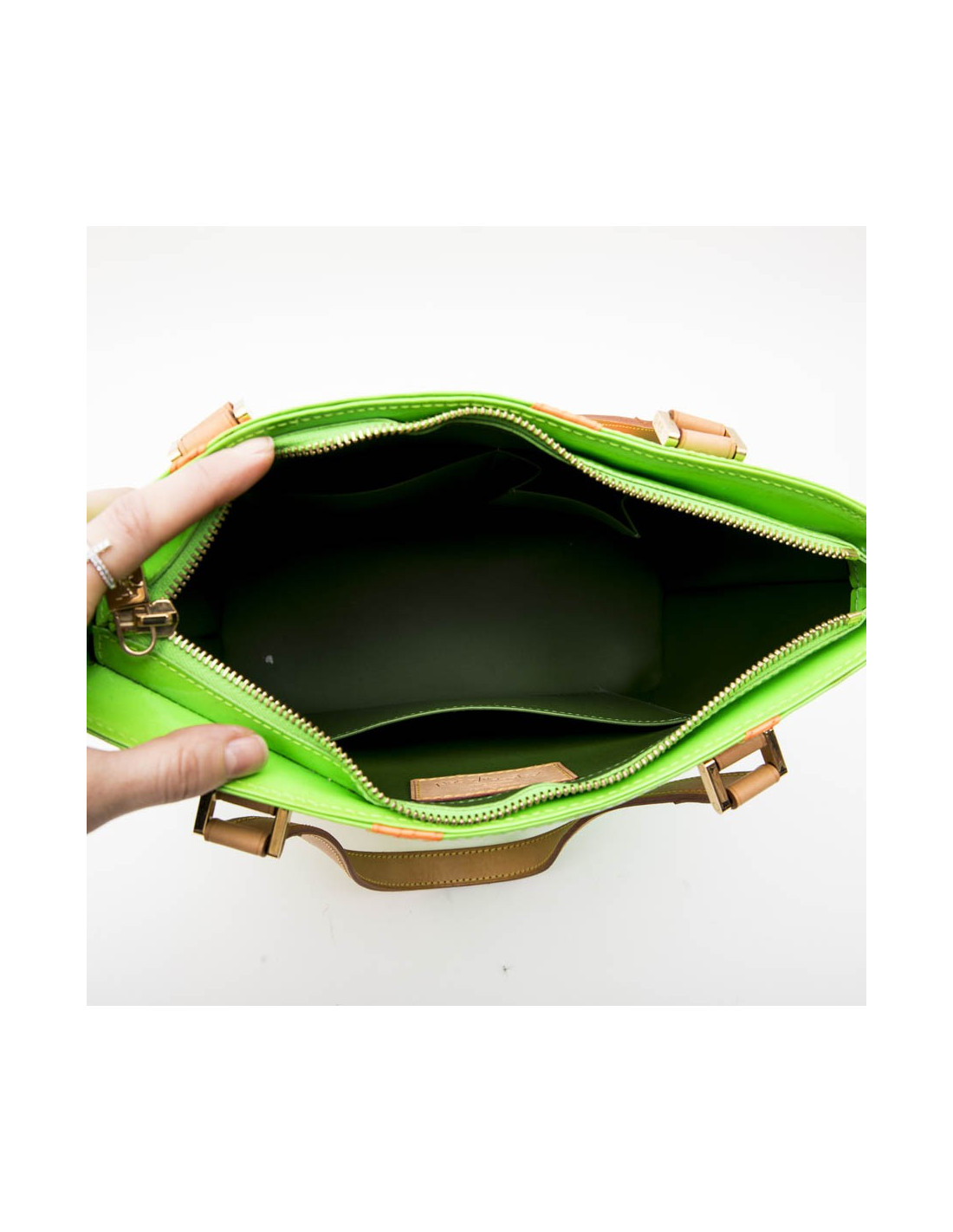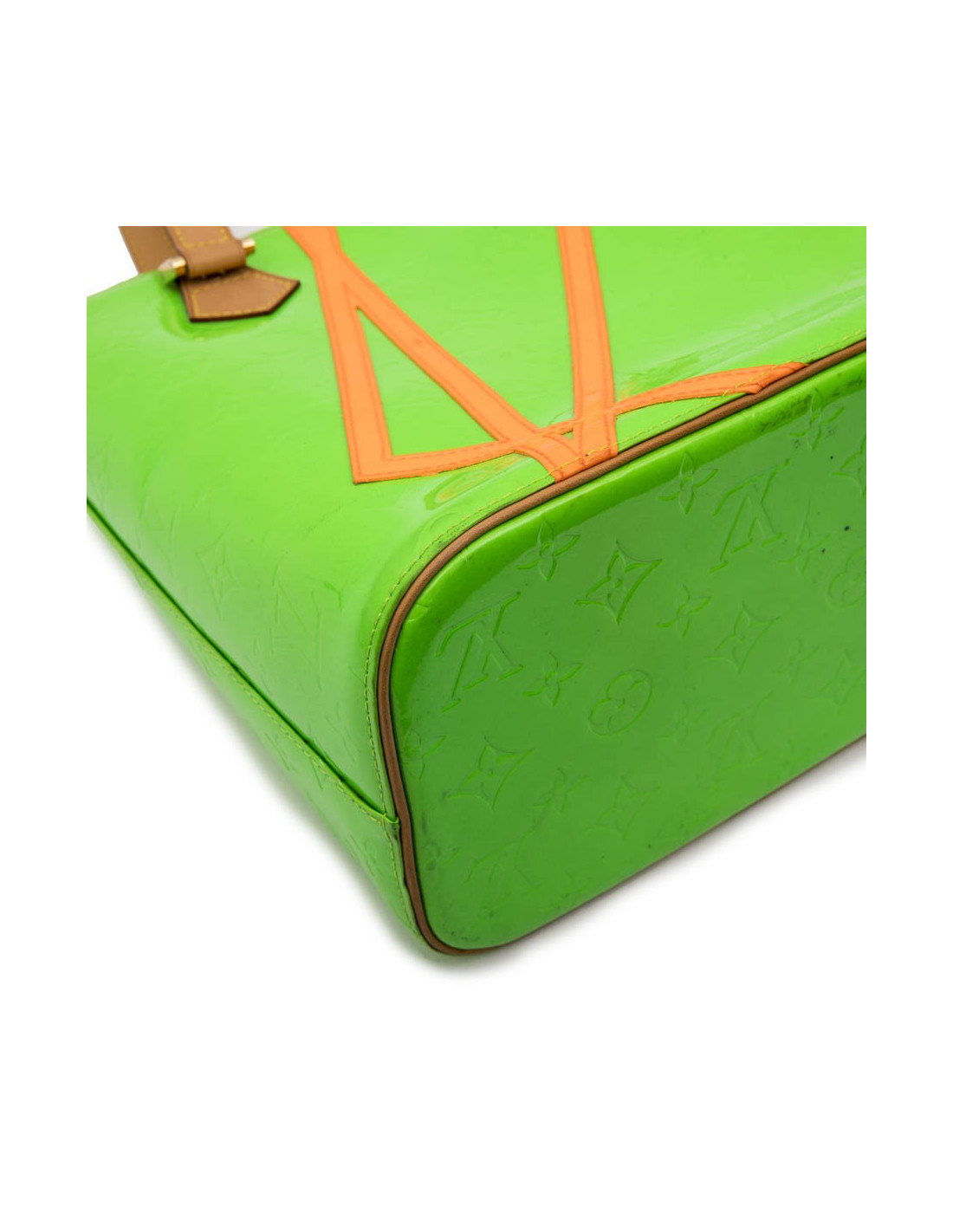 Louis Vuitton 'Houston' bag in neon green monogram patent leather. Limited Series by Robert Wilson. Gilded hardware. Zip closure. Natural cowhide finishes.