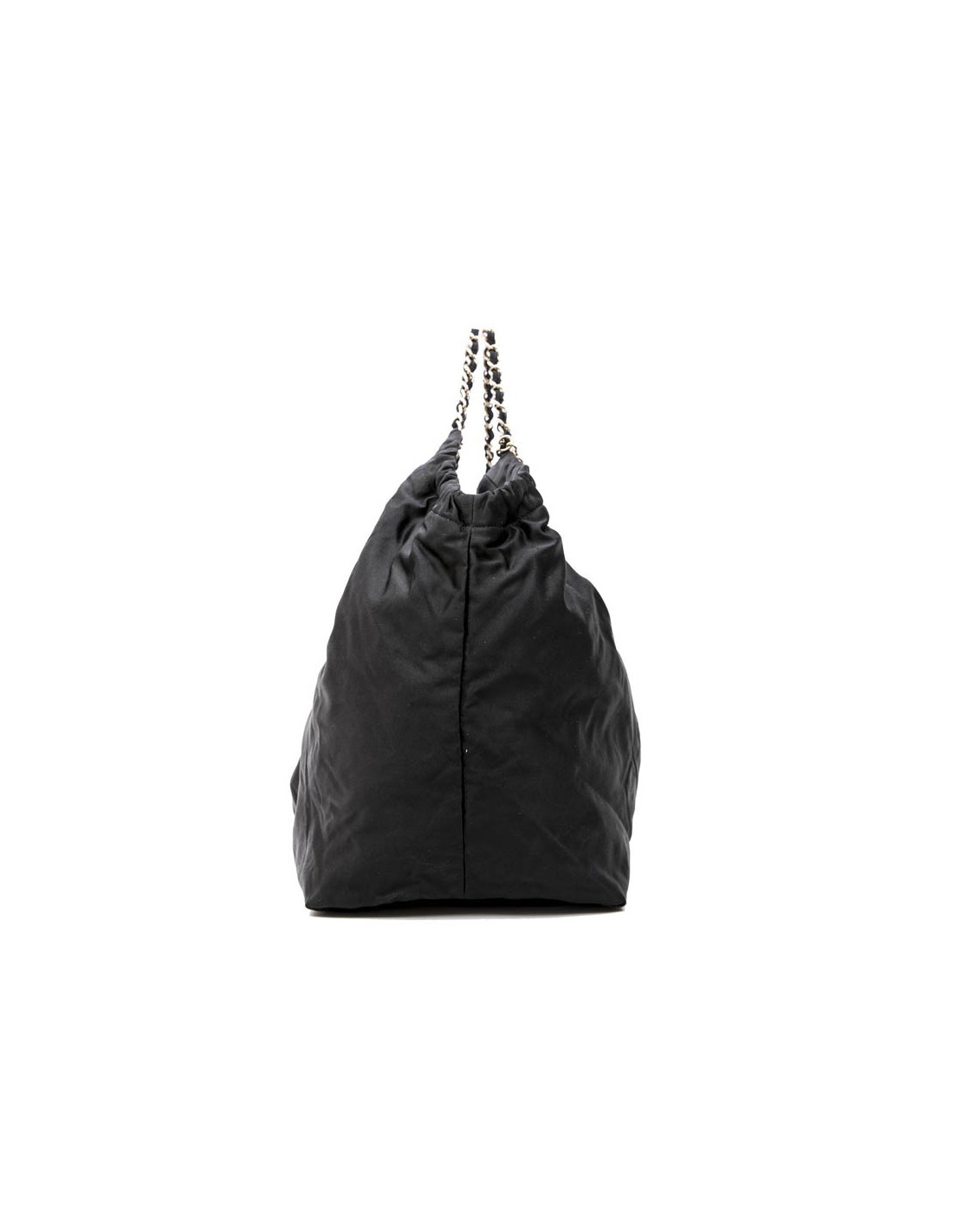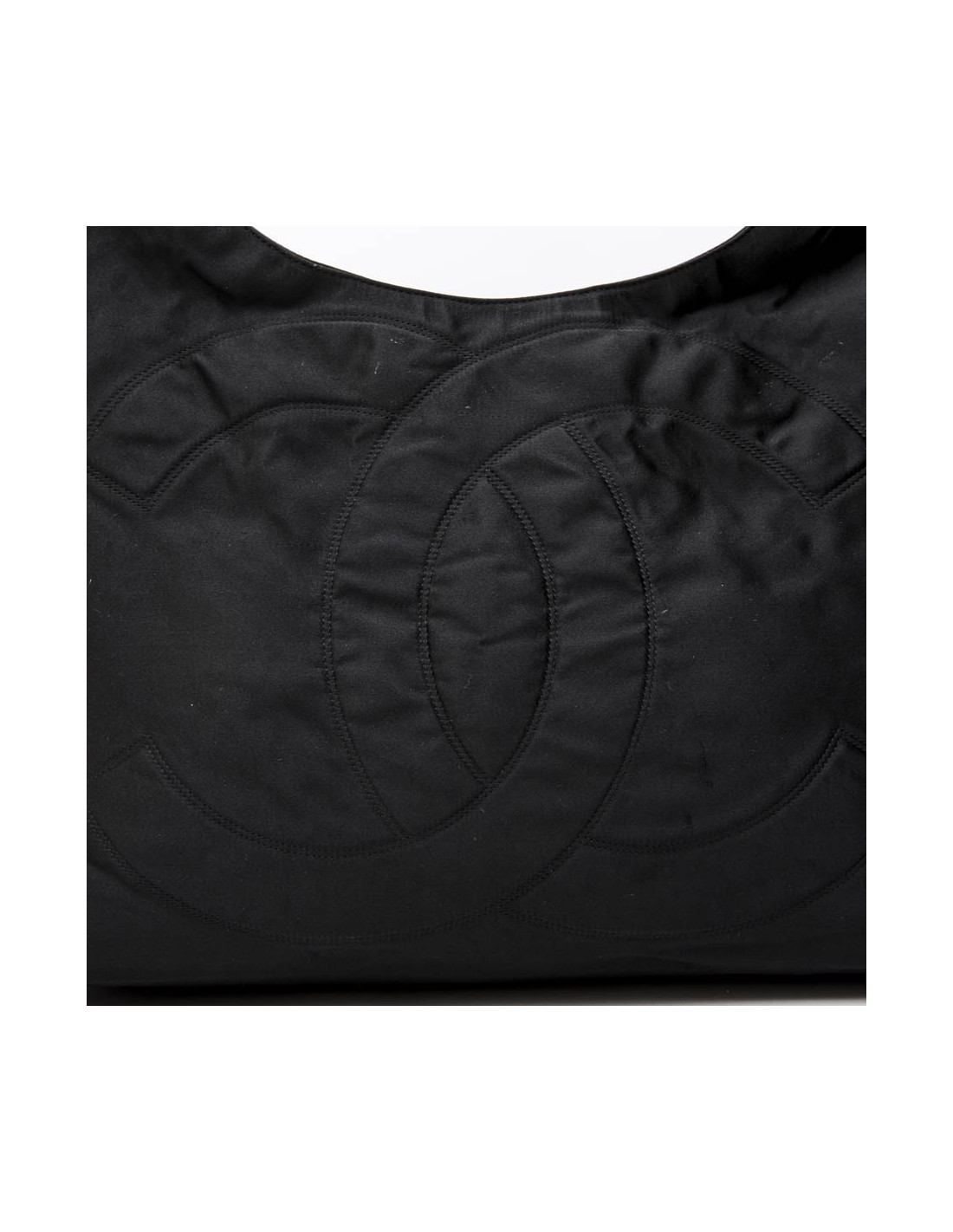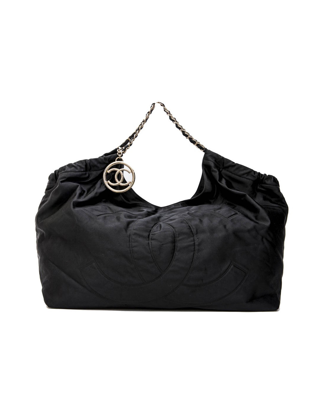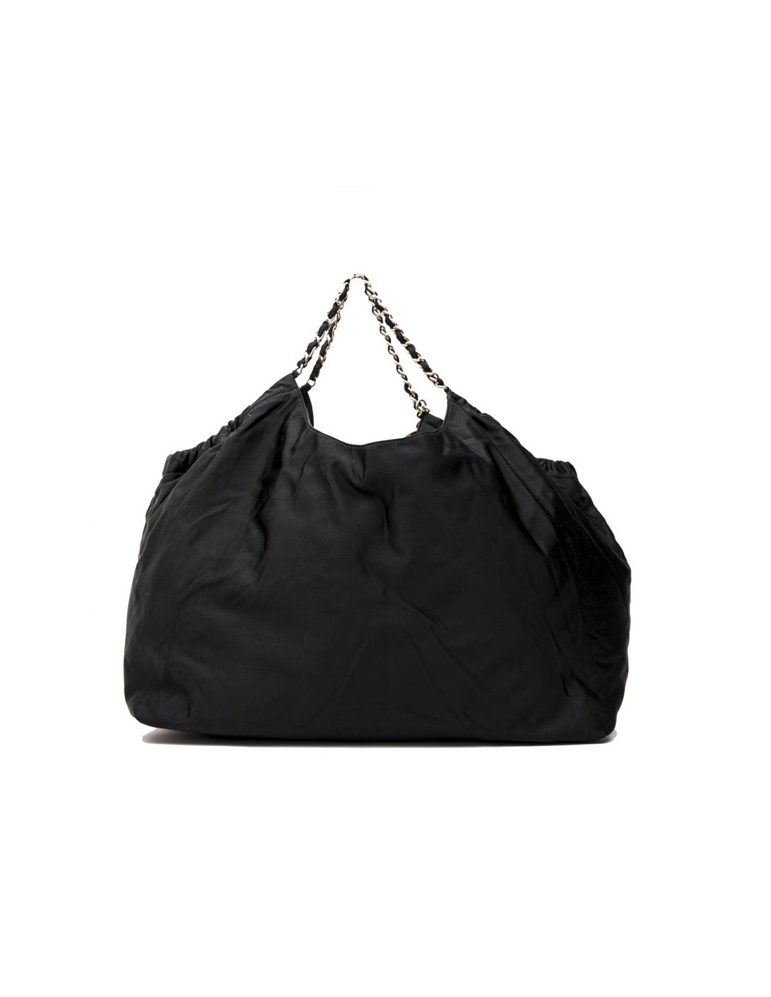 Chanel tote bag in black duchess satin. Gilded metal hardware. Snap closure. The interior is in black monogram canvas.