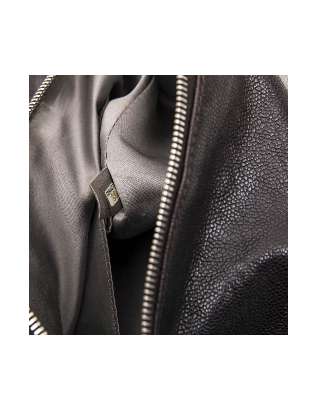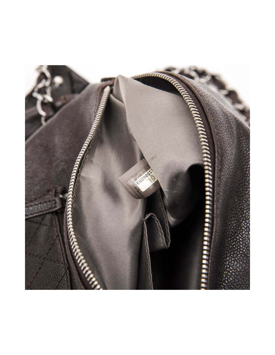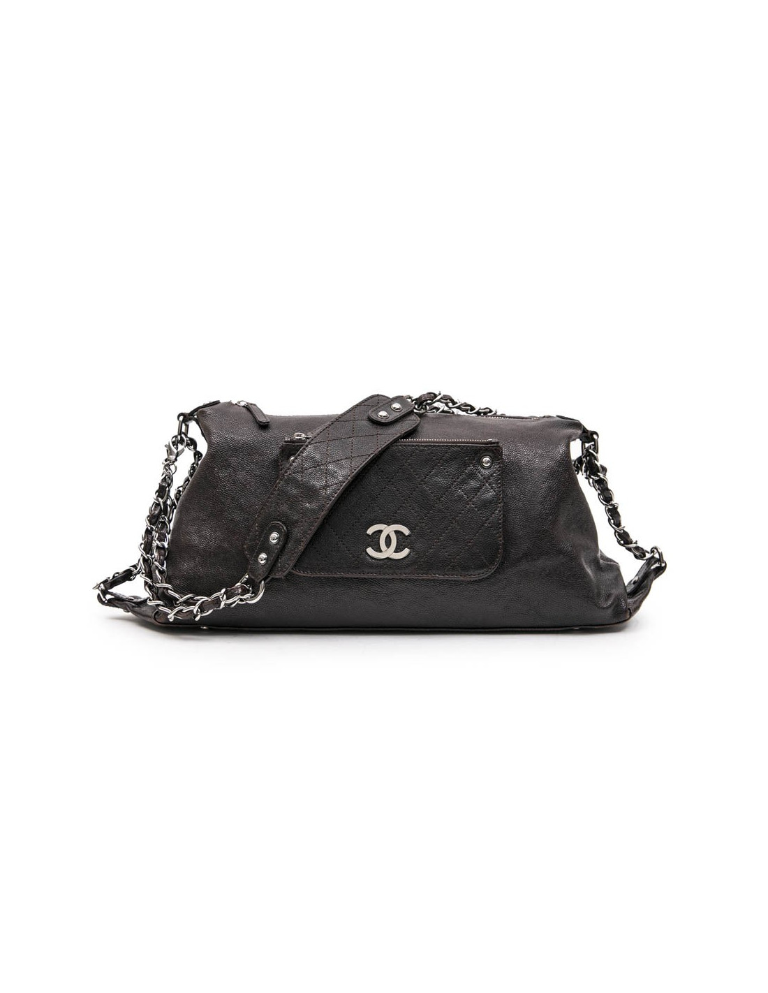 Chanel satchel in brown grained leather. The hardware is in palladium silver metal. It is lined in gray canvas with 3 pockets including a zipper.