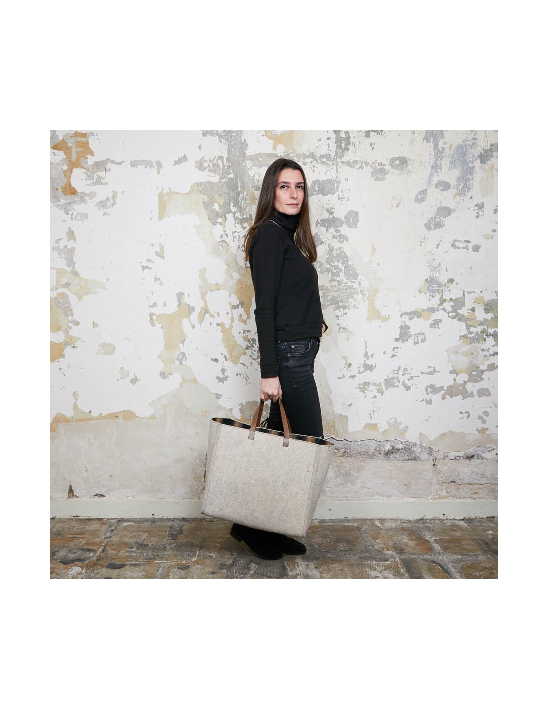 This large FENDI tote bag is in beige boiled wool. It has a striped wool interior. It can be carried by hand. It is in very good condition, with a slight trace on one side (see photo).
