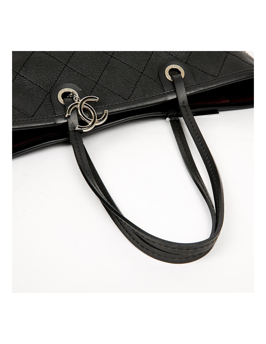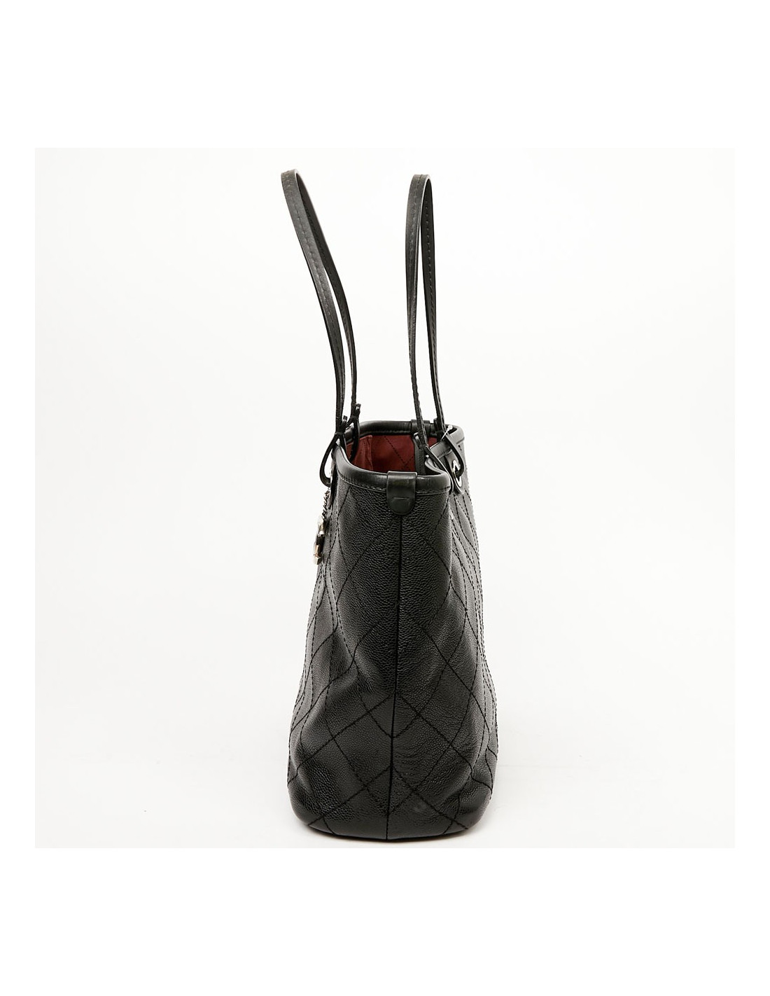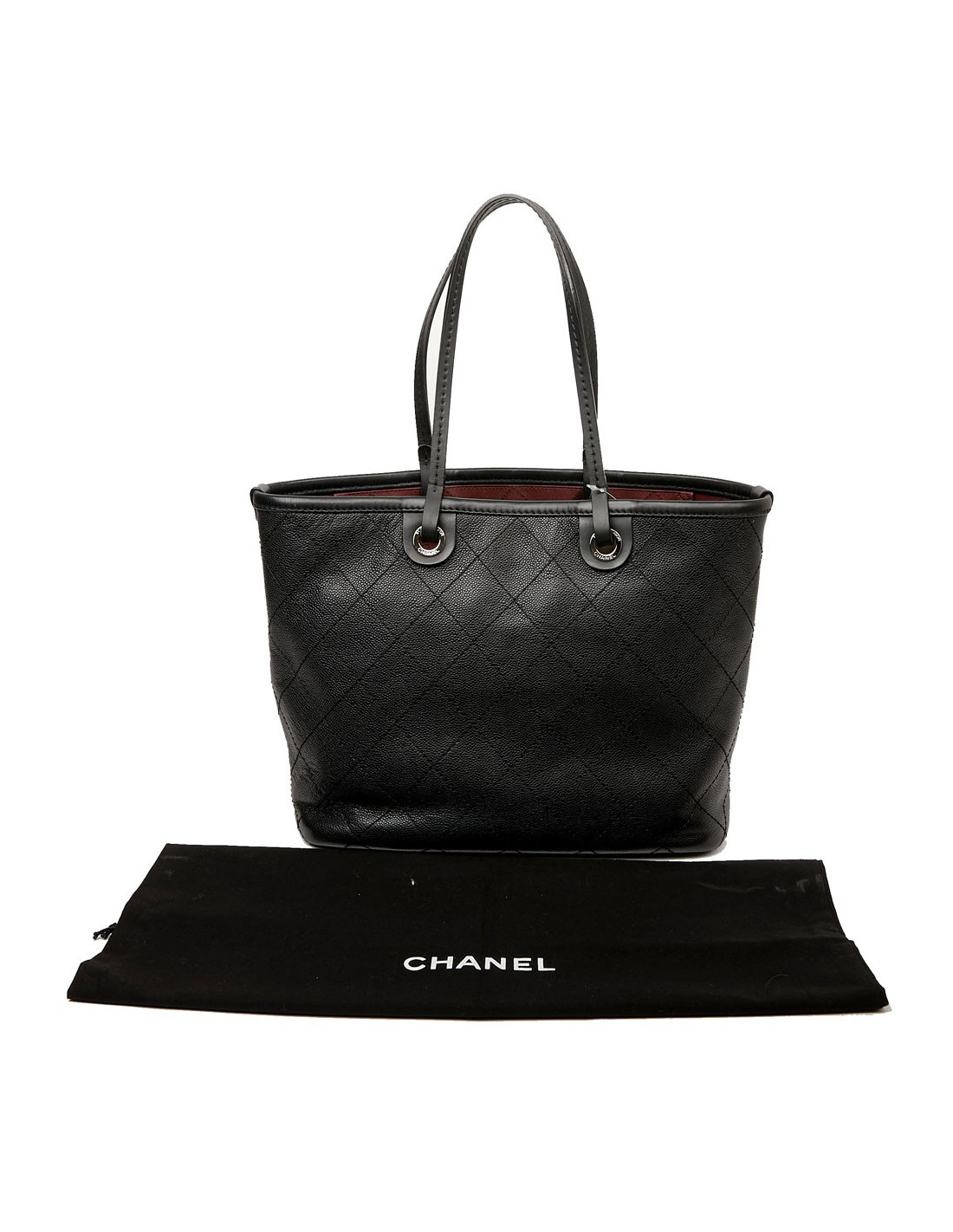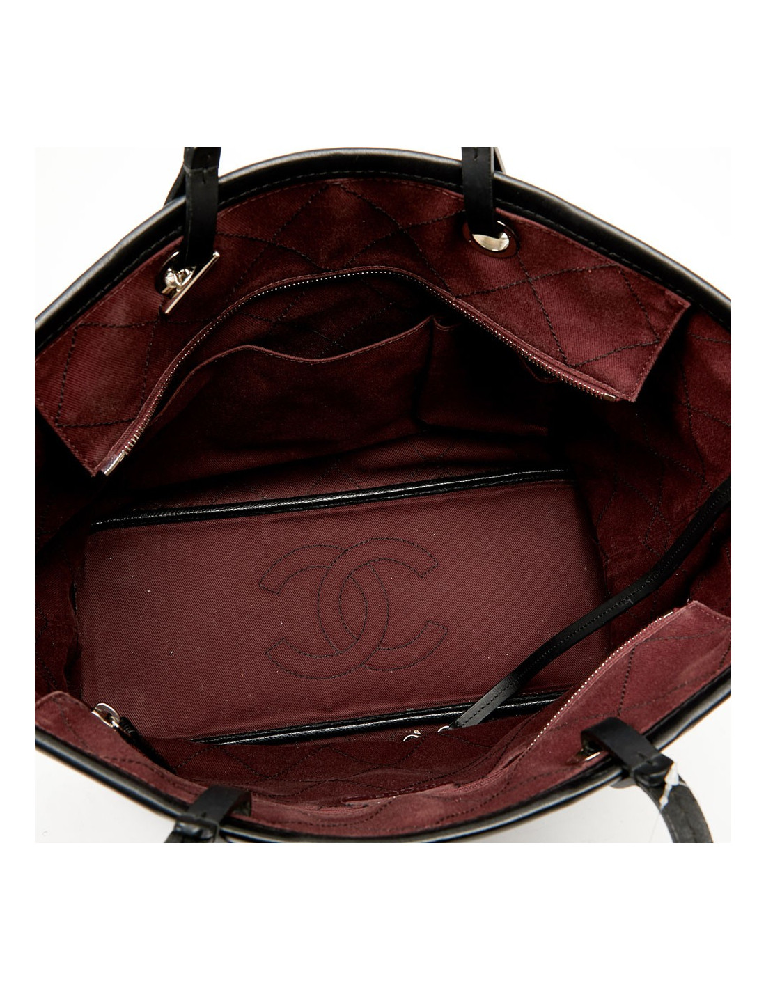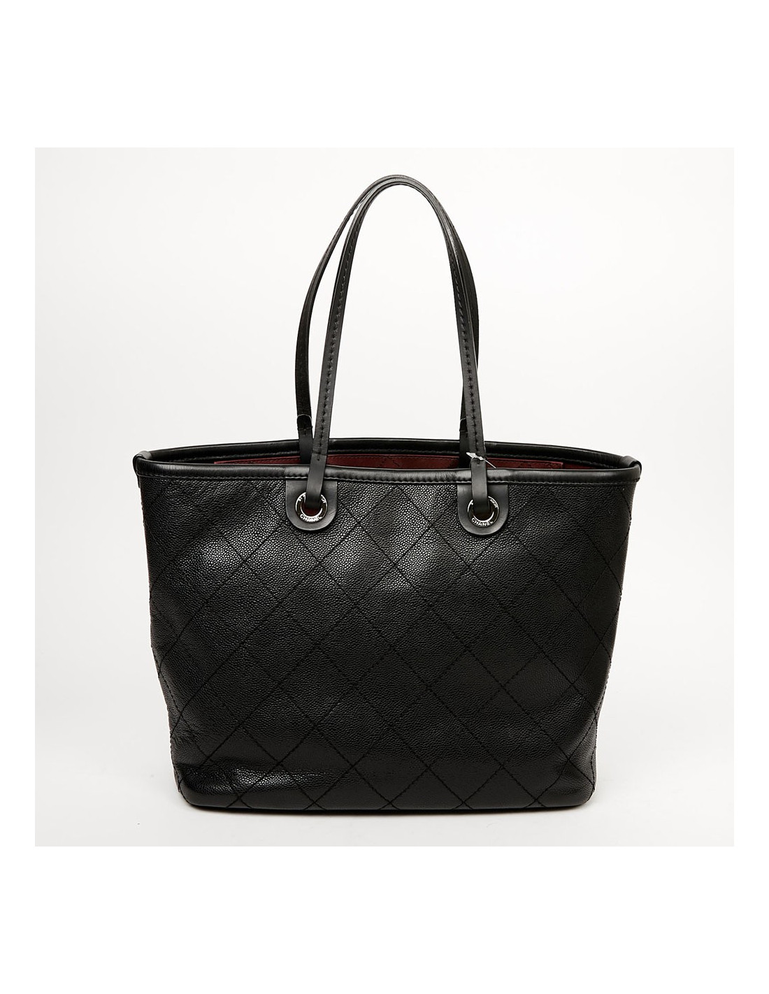 This large CHANEL bag is made of black grained calf leather. The topstitching gives a quilted effect to the bag. The finishes are in silver metal, the eyelets are marked "CHANEL 31 rue Cambon Paris". A charm CC is removable, you can place it wherever you want on your bag. The leather handles allow a shoulder carrying. It is lined with burgundy fabric, a large CC is embroidered at the bottom of the bag. To safely store your belongings you have a large zippered pocket on one side and two on the other side. Closing with a zipper. Under the bag, four metal protective bottom feet. The corners and handles are free of wear and tear. This bag is in perfect condition.