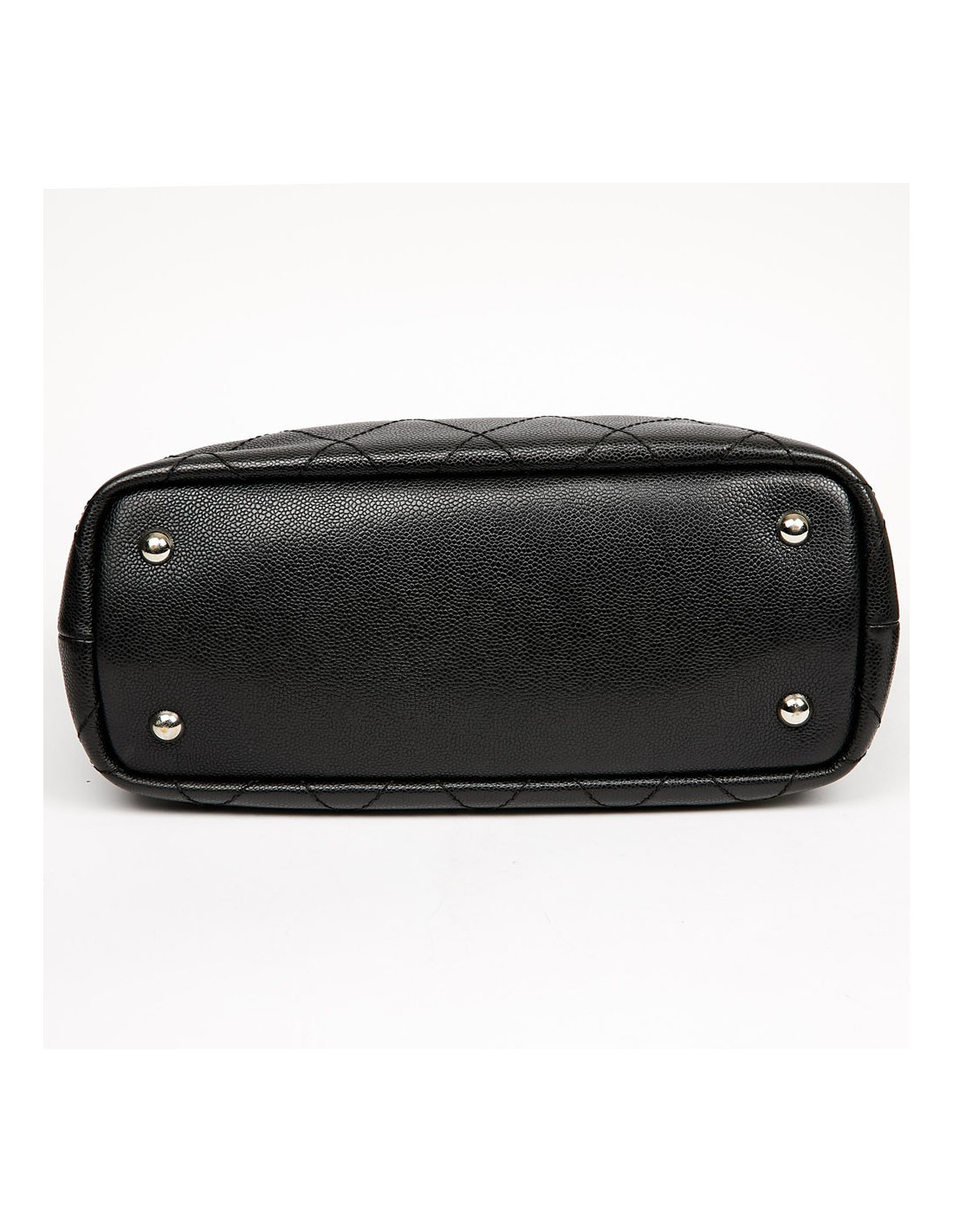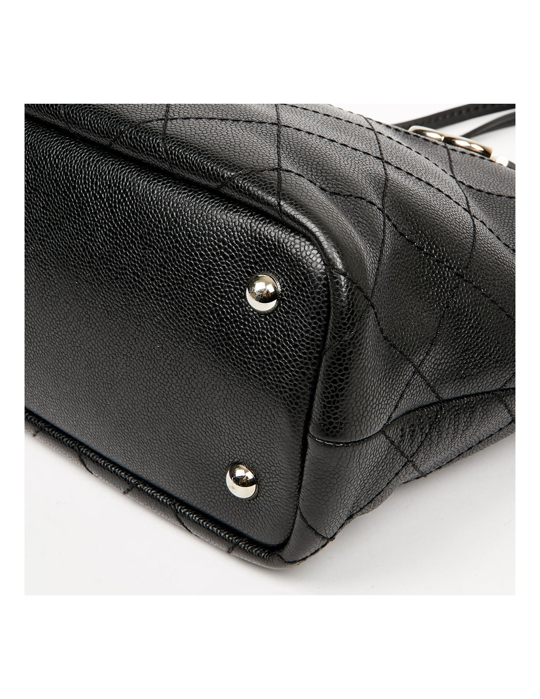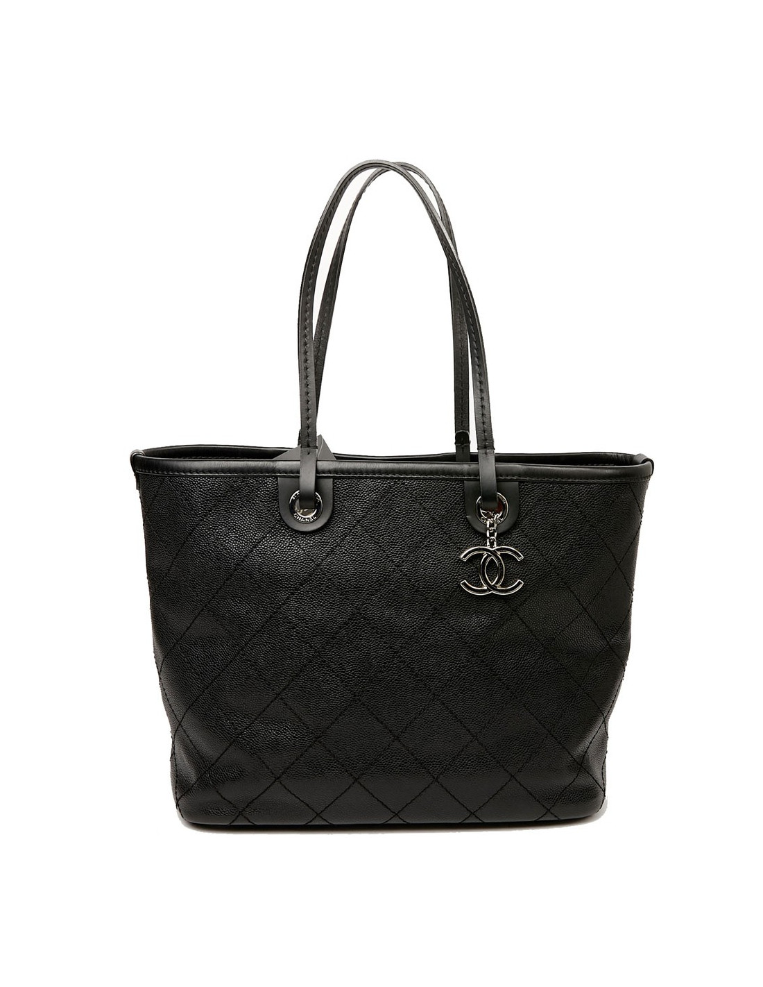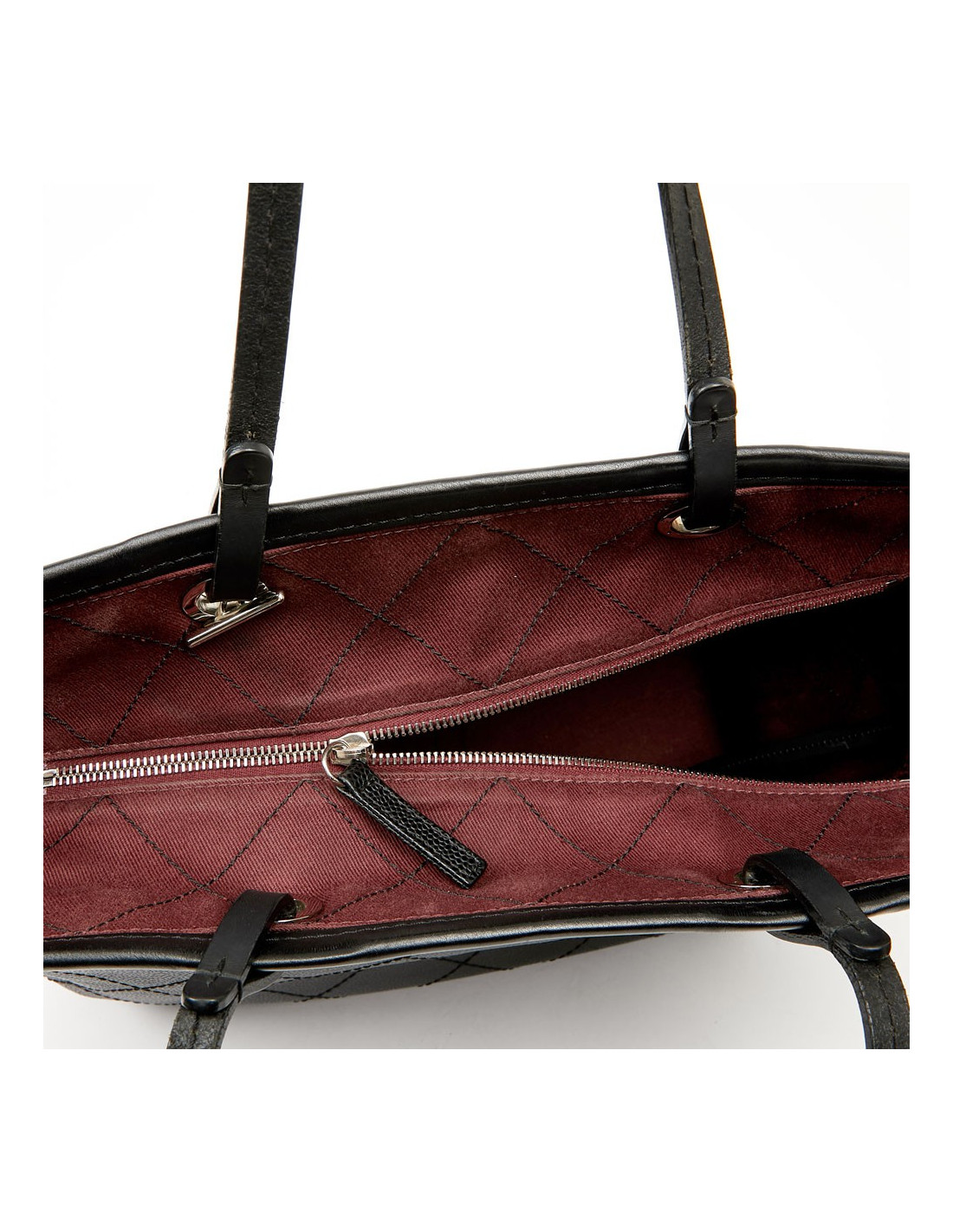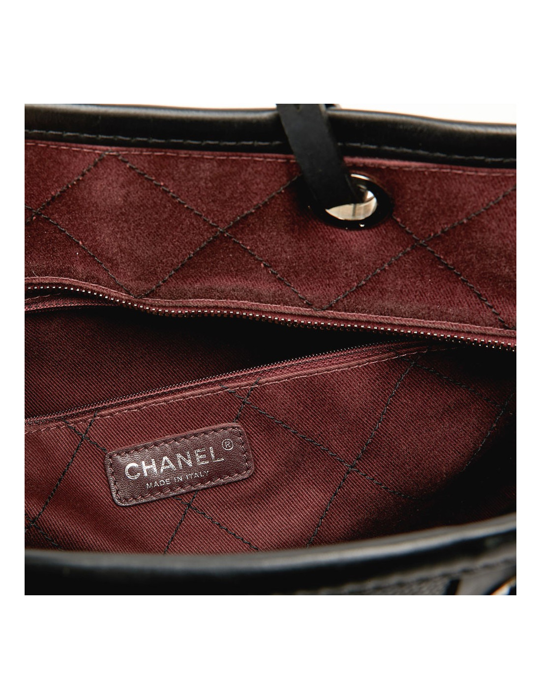 This large CHANEL bag is made of black grained calf leather. The topstitching gives a quilted effect to the bag. The finishes are in silver metal, the eyelets are marked "CHANEL 31 rue Cambon Paris". A charm CC is removable, you can place it wherever you want on your bag. The leather handles allow a shoulder carrying. It is lined with burgundy fabric, a large CC is embroidered at the bottom of the bag. To safely store your belongings you have a large zippered pocket on one side and two on the other side. Closing with a zipper. Under the bag, four metal protective bottom feet. The corners and handles are free of wear and tear. This bag is in perfect condition.