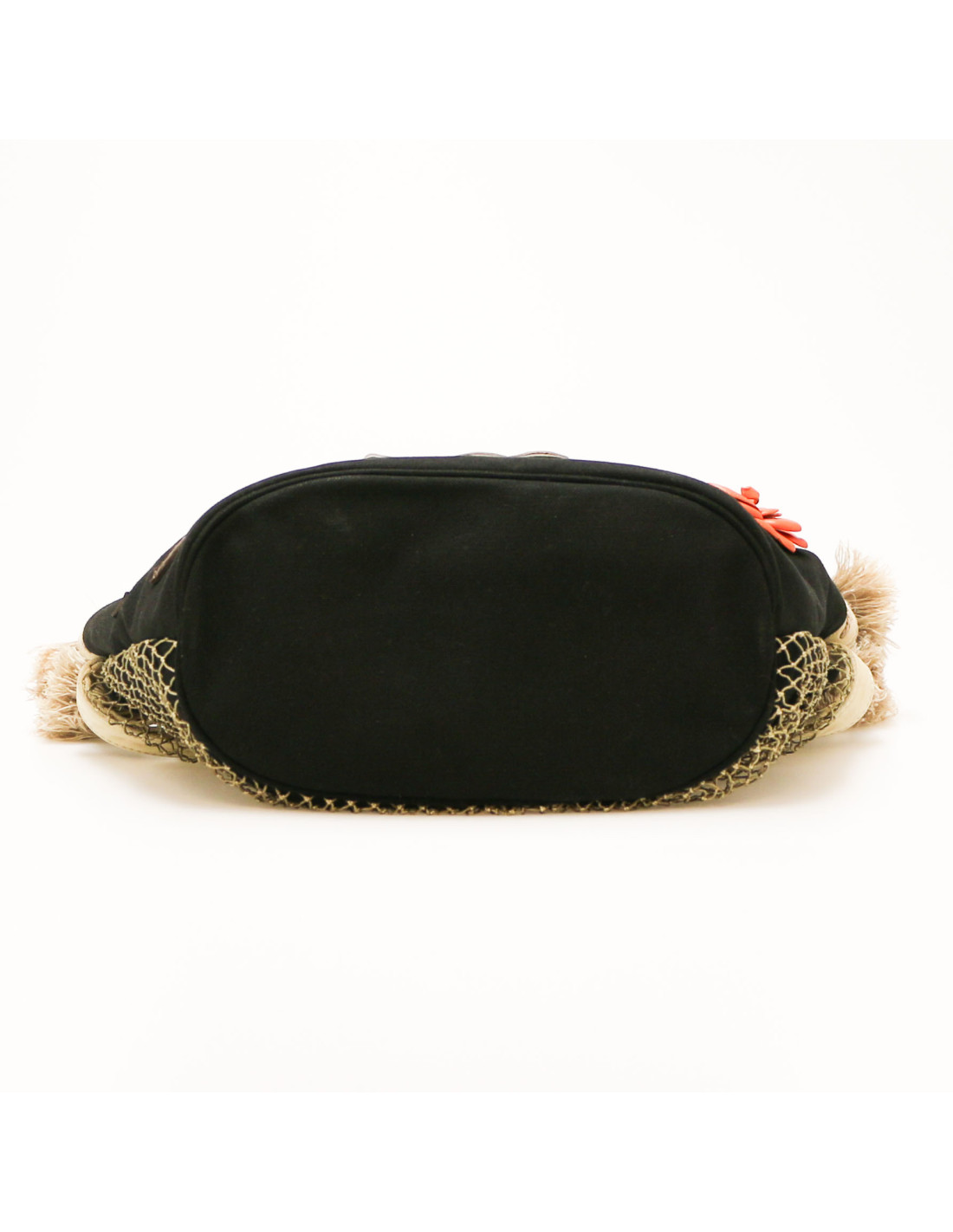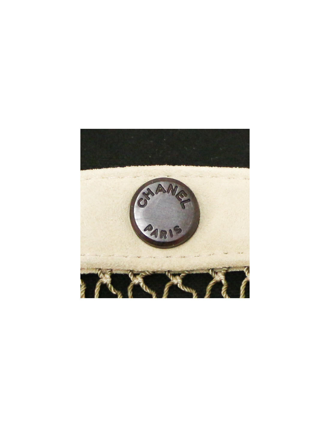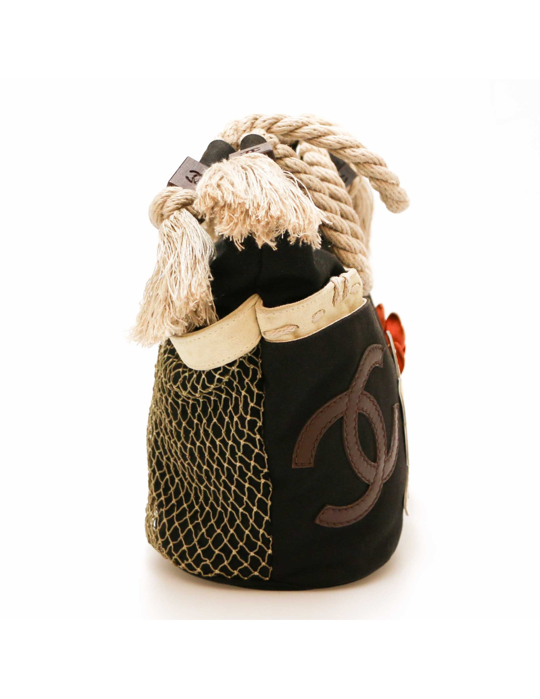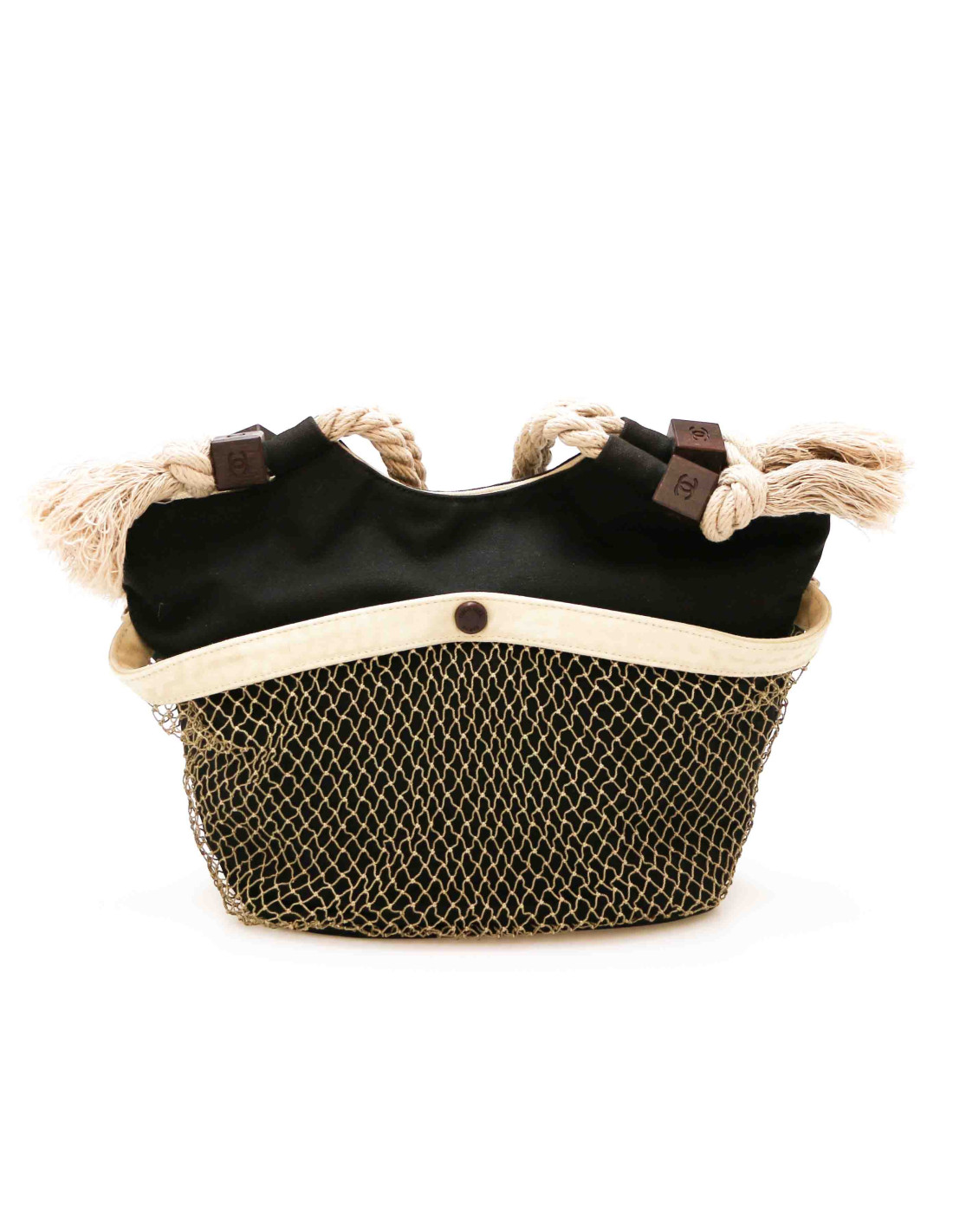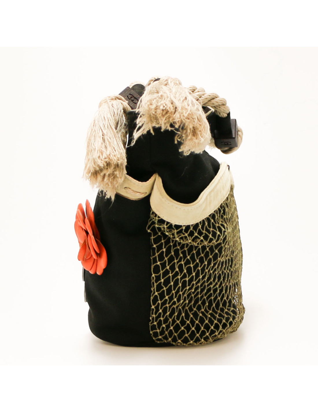 Details : has been cleaned at Germaine Lesèche's. Cotton canvas basket with leather details (tracings) and mesh. Patch pockets on each side, one zipped pocket inside. Magnetic button closure.