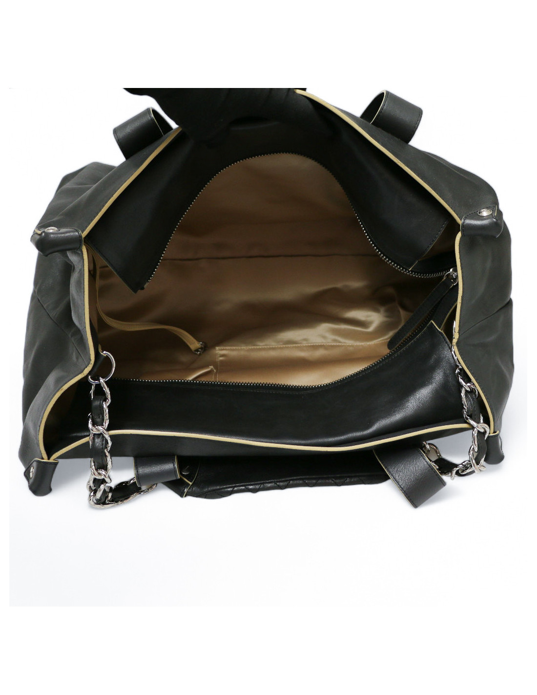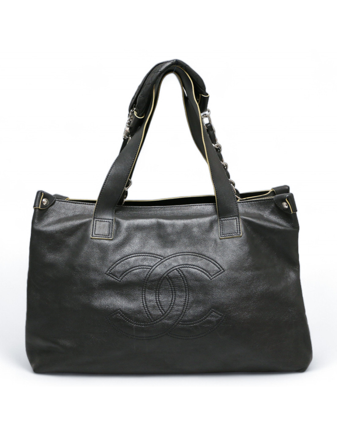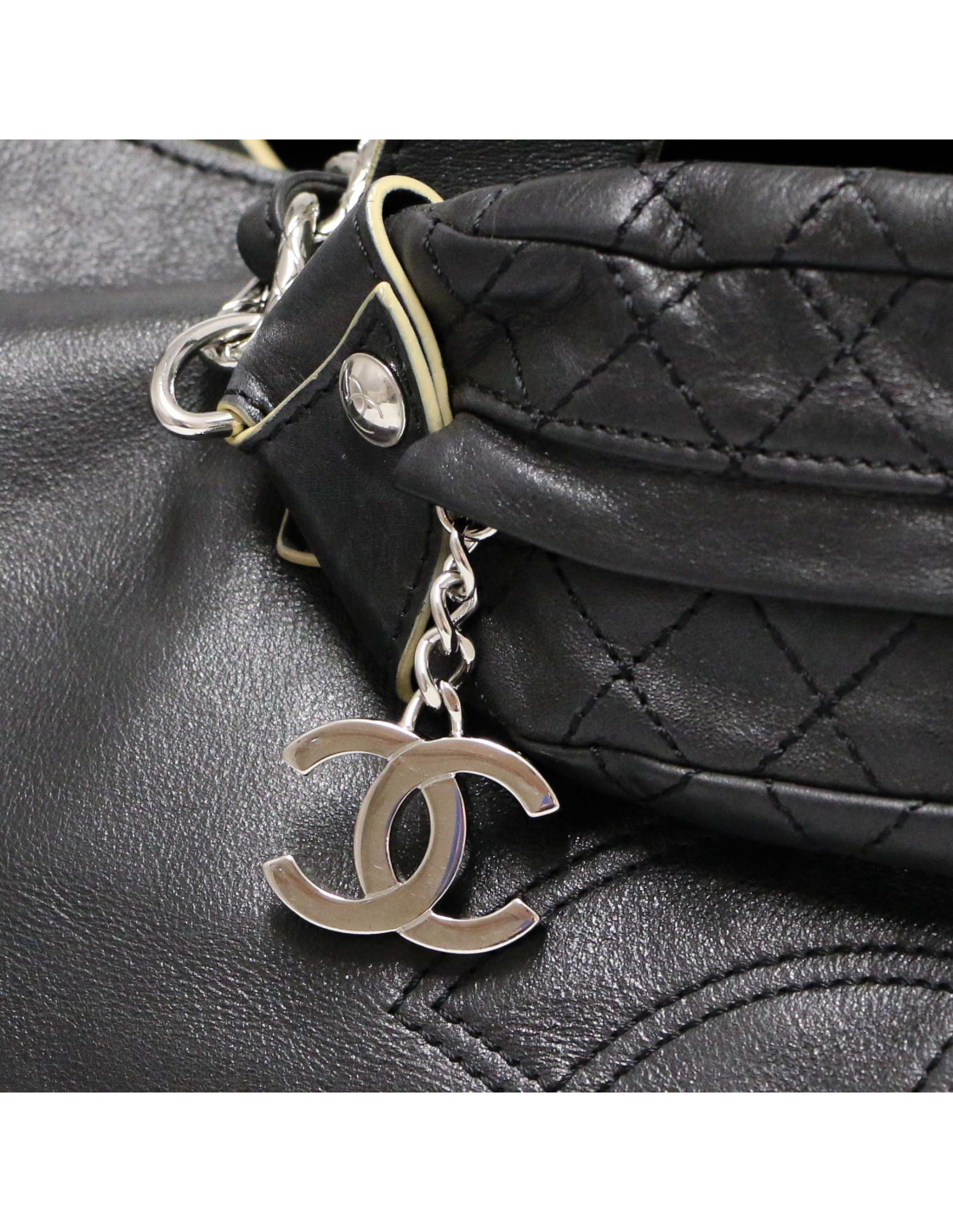 Details : zipper closure, three small inside pockets, one of which is zippered. Two leather straps and a silver chain and leather handle. A small quilted zipped pocket embellished with a CC charm. Large CC logo on front. Good condition, a few traces on the leather, not very visible.
