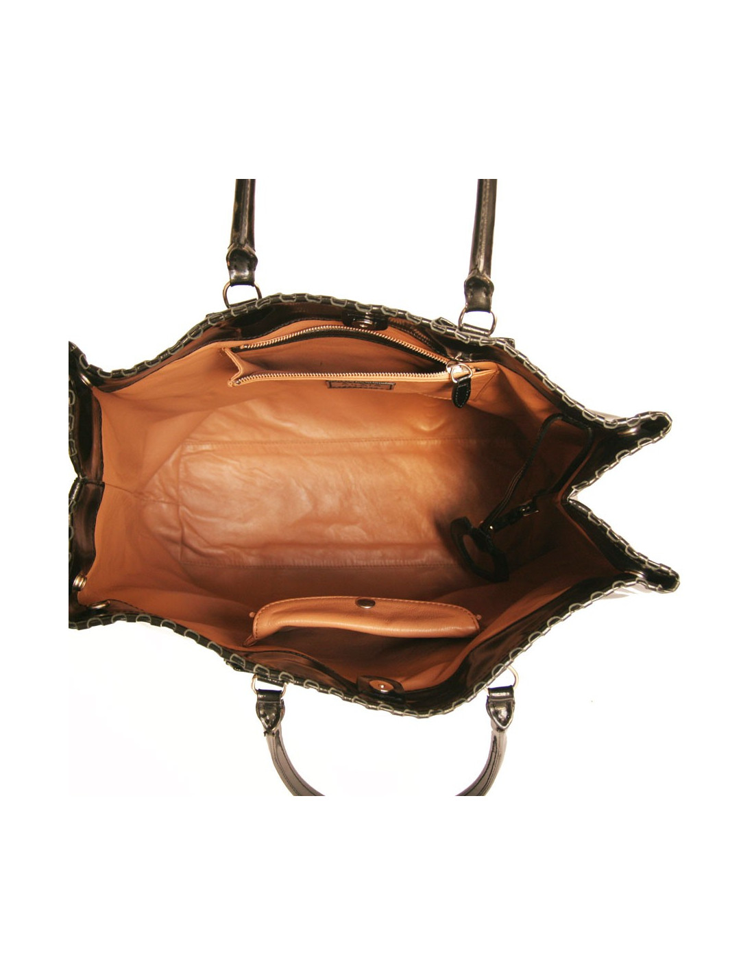 Worn by hand or arm with two handles that each measure 46 cm. The interior is in leather with three pockets: one zipper, one that closes with a pressure and a flat pocket.
