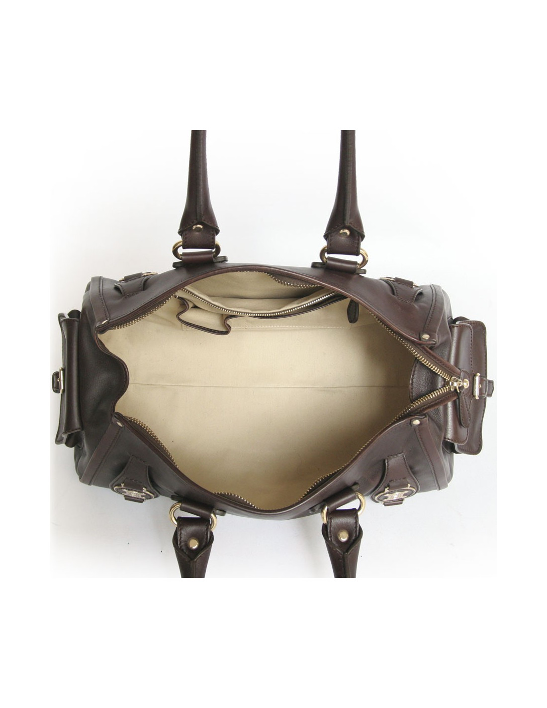 Céline brown leather bag. Zipper closure. Fittings is made of gilded brass. Double handle which allows it to be in three ways: by hand, shoulder and arm. It is very convenient because it offers a large storage capacity with its interior in beige fabric. It has 3 inside pockets including one zipped. Two pockets on the sides. In very good condition. Very light patina of leather under the bag.