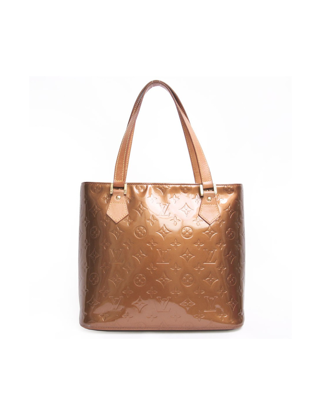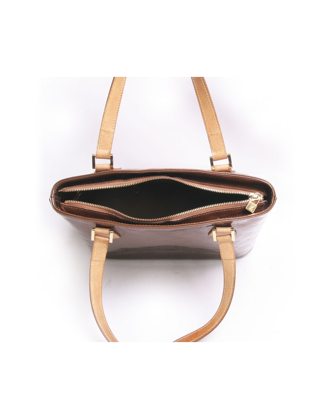 Sac Louis Vuitton en cuir monogram verni marron brillant. Les deux anses sont en cuir marron. La bijouterie est en laiton doré. Fermeture zippée. L'intérieur est en cuir marron avec deux poches dont une zippée. En très bon état.