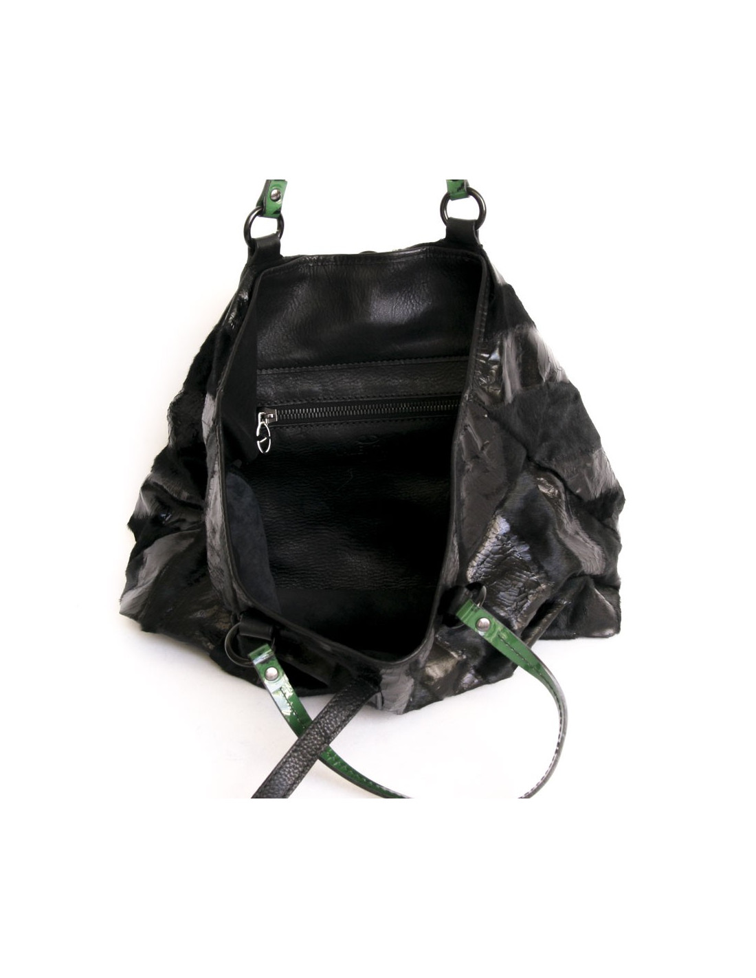 Bag Tote Valentino in foal and parts in varnished black aged leather. It is very good condition. The handles are in green patent leather and black stitching. It is convenient to put a computer and documents. It is worn on the shoulder.