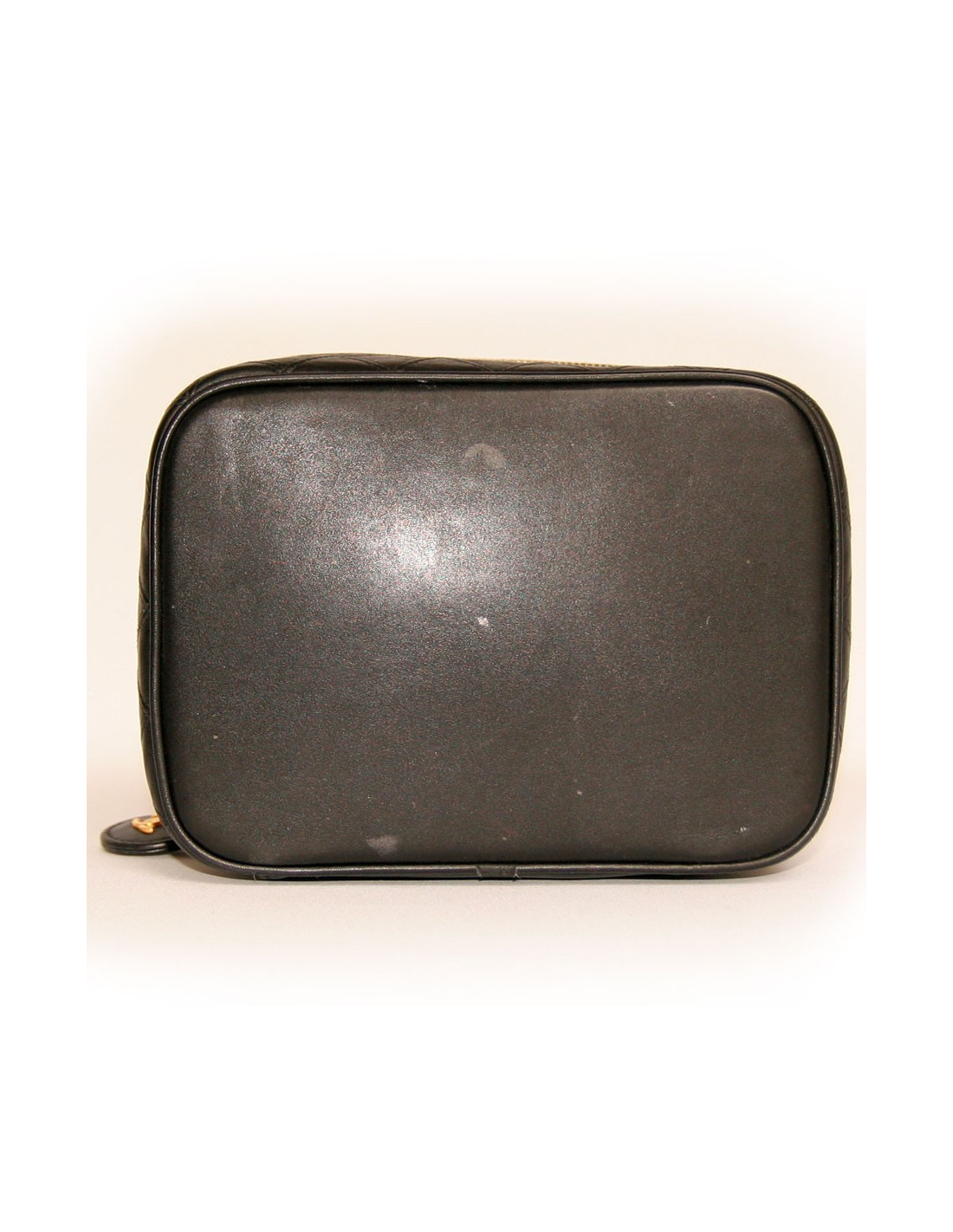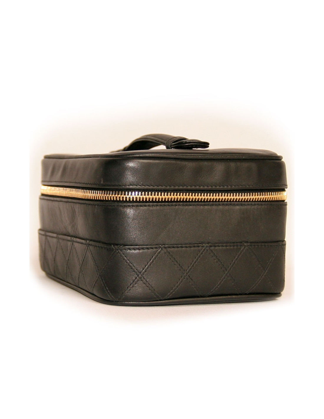 Vanity case in black leather Chanel. Ideal to put all your cosmetics or it can also be used for your jewelry. The jewelry are gold metal.