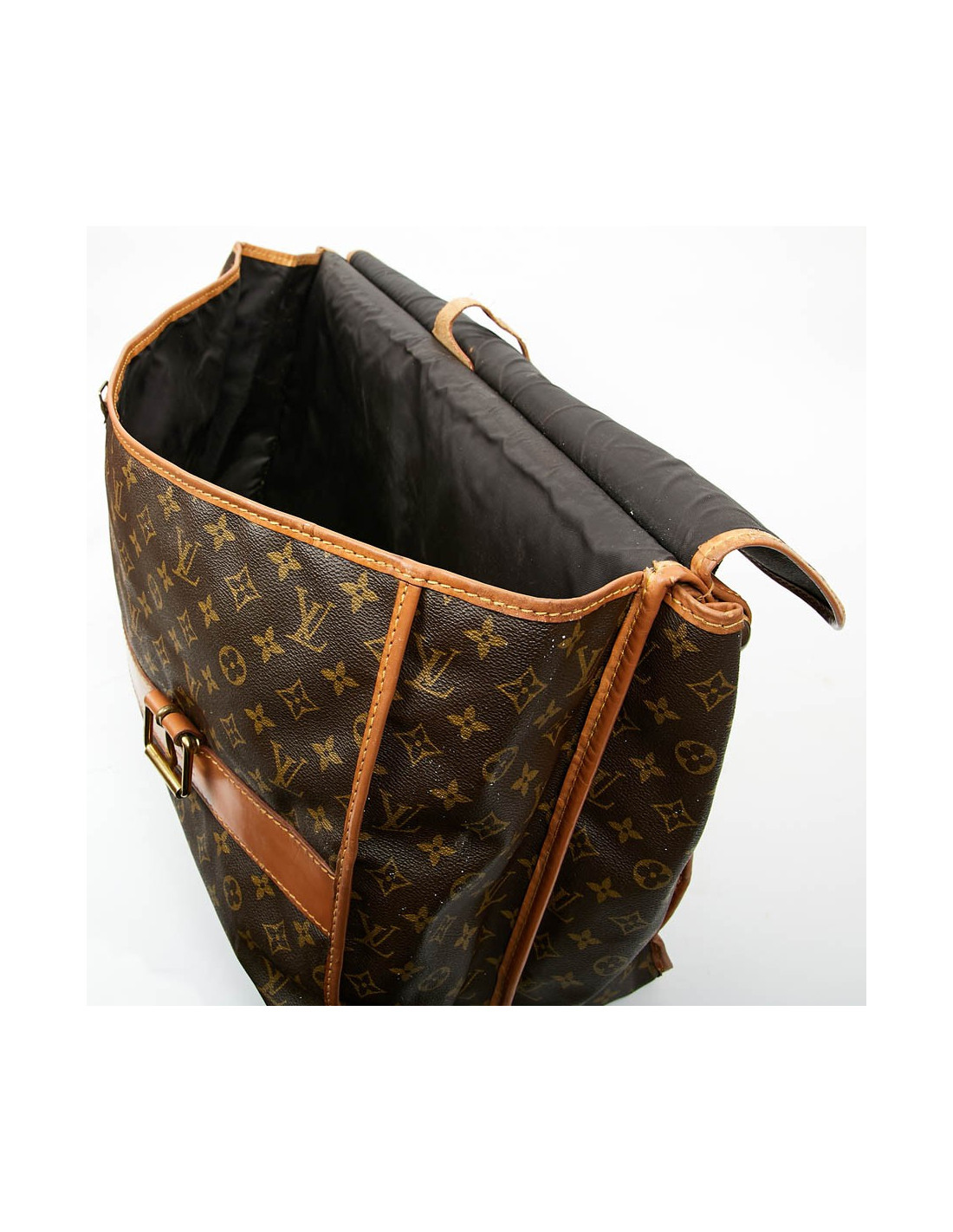 It has two separate storage spaces, each with a flap closure ending with a pin buckle, their lining is in canvas.