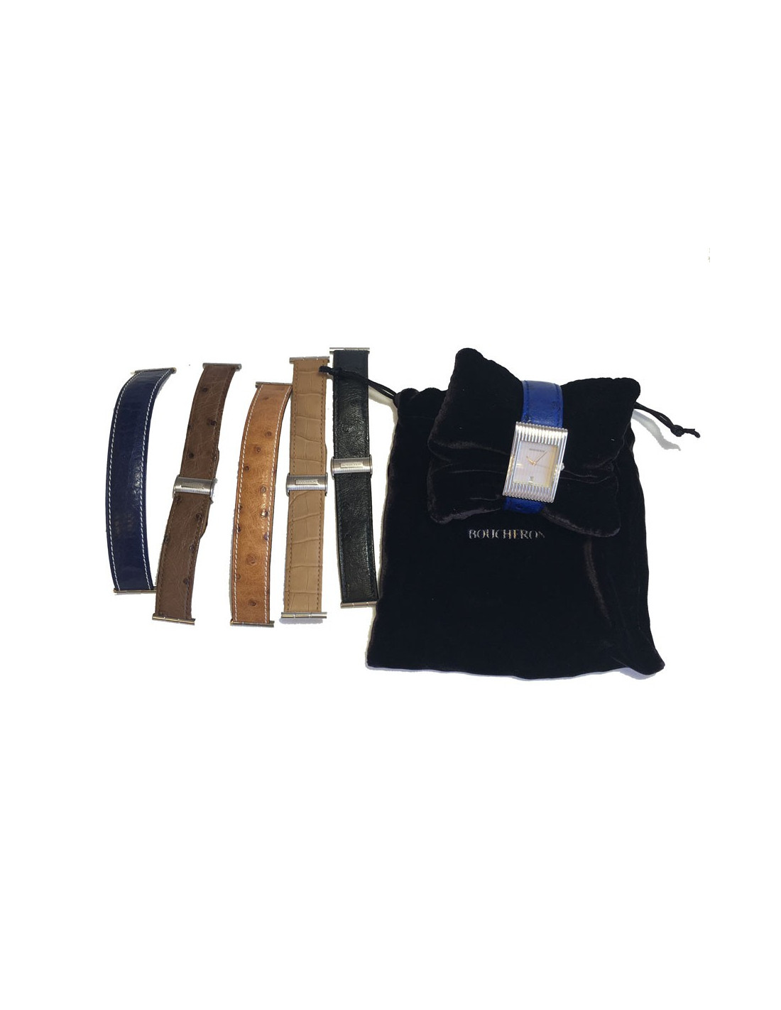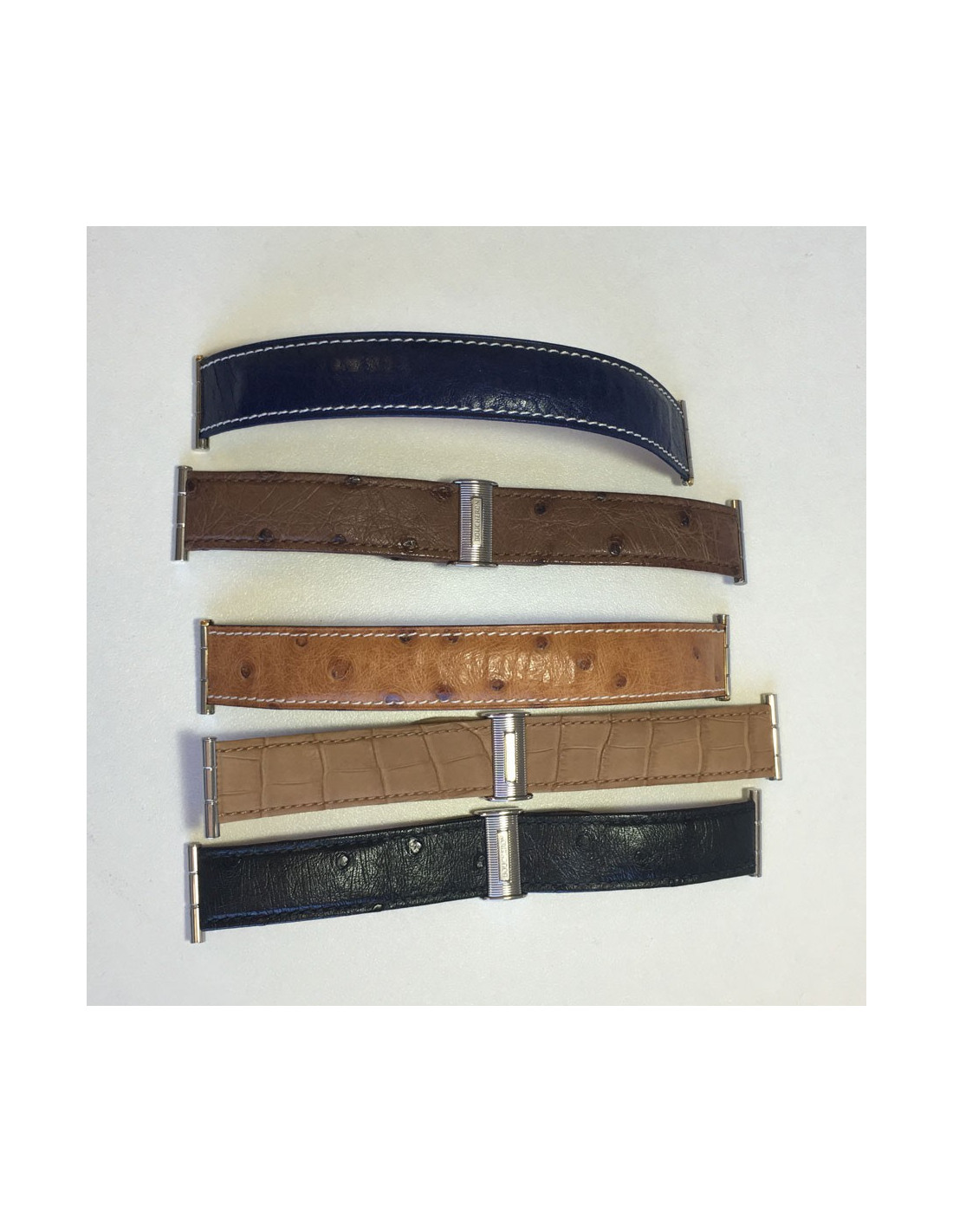 Cette montre possède des bracelets de rechange de coloris et matière différentes: 3 en autruche, marron, camel et noir, 1 en alligator marron clair et 1 en cuir bleu roi.