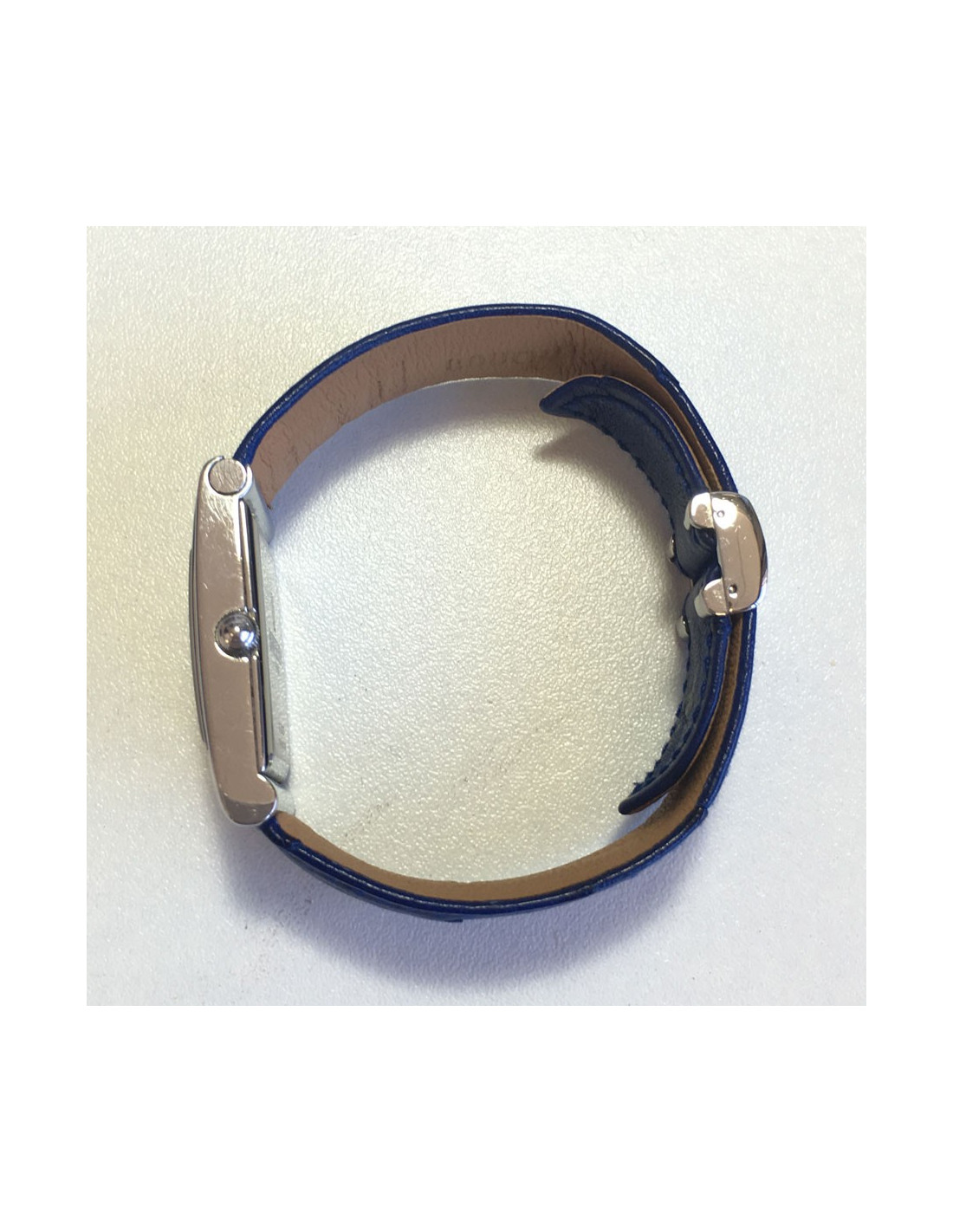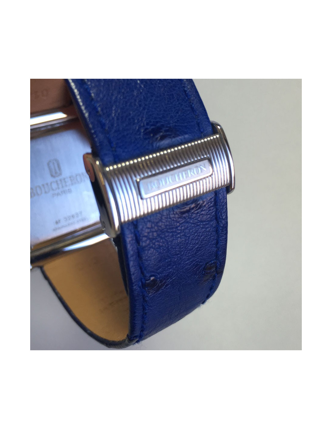 Montre BOUCHERON "reflet grand modèle", à boitier rectangulaire en acier. Cadran à fond gris. Guichet dateur. Mouvement à quartz. Bracelet coulissant en autruche bleu.